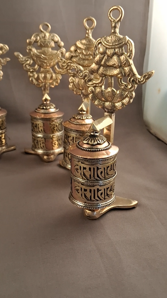 Tibetan Buddhism Set of 8 Auspicious Ritual Sign Om Mantra Table Stand Hanging Offering Copper Brass Prayer Wheel Nepal