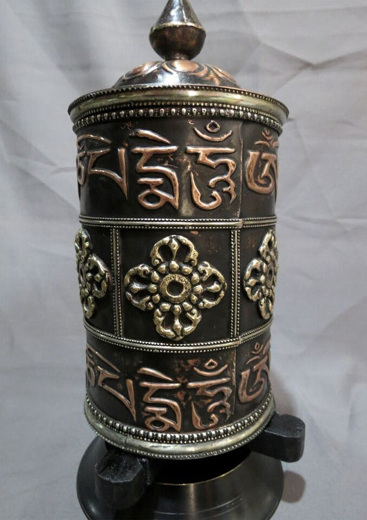 Tibetan Om Mani Padme Hum Mantra Vishwa Vajra/Double Dorje Copper Offering Prayer Wheel Nepal