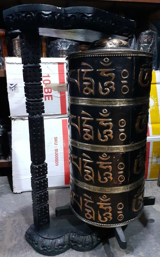 Tibetan Om Mani Padme Hum Mantra 35" Wooden Huge Wooden Frame Copper Offering Prayer Wheel Nepal