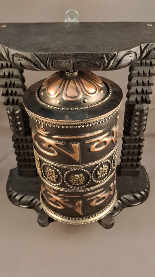 Tibetan Om Mantra 8 Auspicious Sign Wooden Craved Frame Offering Copper Prayer Wheel Nepal