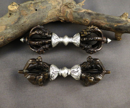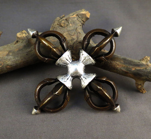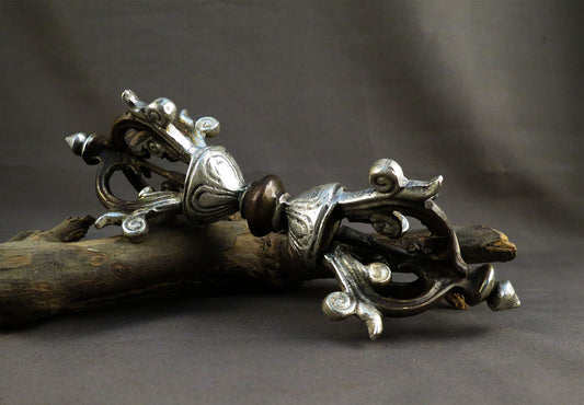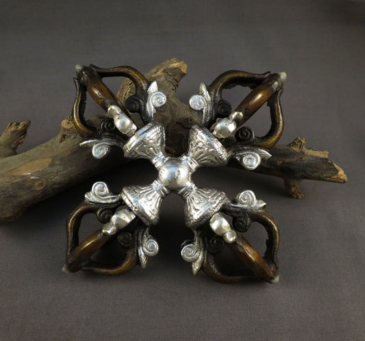 Buddhism Tibetan Ritual Brass Silver Oxide Double Dorje/Vajra Vishwa Vajra Thunderbolt Nepal free