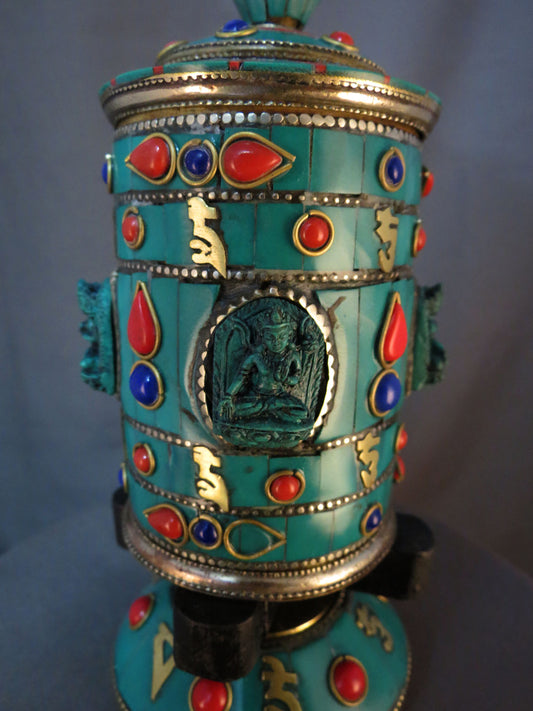 Tibetan Buddhism Goddess White Tara Om Mantra Brass Resin Turquoise Stone Handmade Prayer Wheel