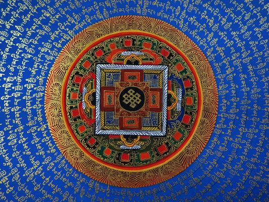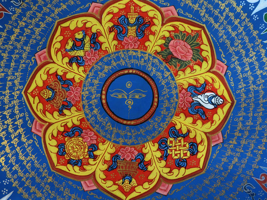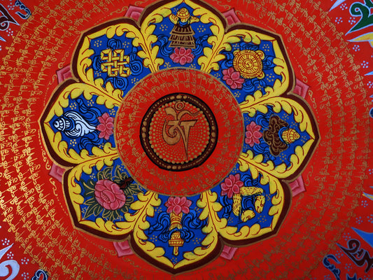 Tibetan Buddhism Ritual Vishwa Vajra/Dorje Om Mani Padme Hum Mantra Mandala with 8 Auspicious Lucky Sign Handwritten Painting Thangka Art Nepal free