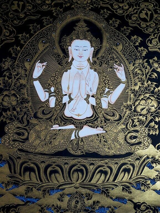 Chenrezig represents the infinite compassion of all Buddhas. He is often depicted with four arms — symbolizing loving-kindness, empathy, joy, and equanimity. Two hands are joined in prayer at his heart, while the others hold a crystal mala (prayer beads) and a lotus, signifying purity and the ability to lead beings toward enlightenment. His mantra, "Om Mani Padme Hum", is one of the most widely recited in Tibetan Buddhism and embodies his compassionate nature.