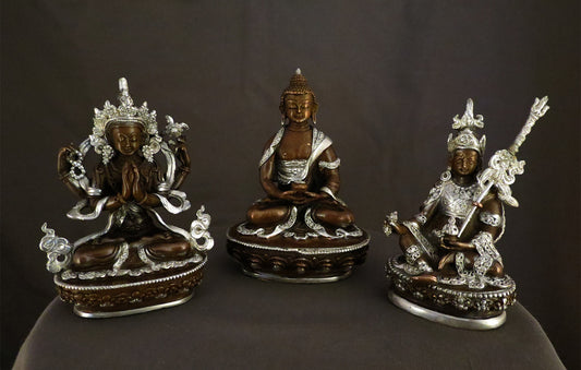 Tibetan Buddhism Lord Chenrezig, Lord Amitabha Buddha Guru Rinpoche Copper Statue Silver Oxide Sculpture free