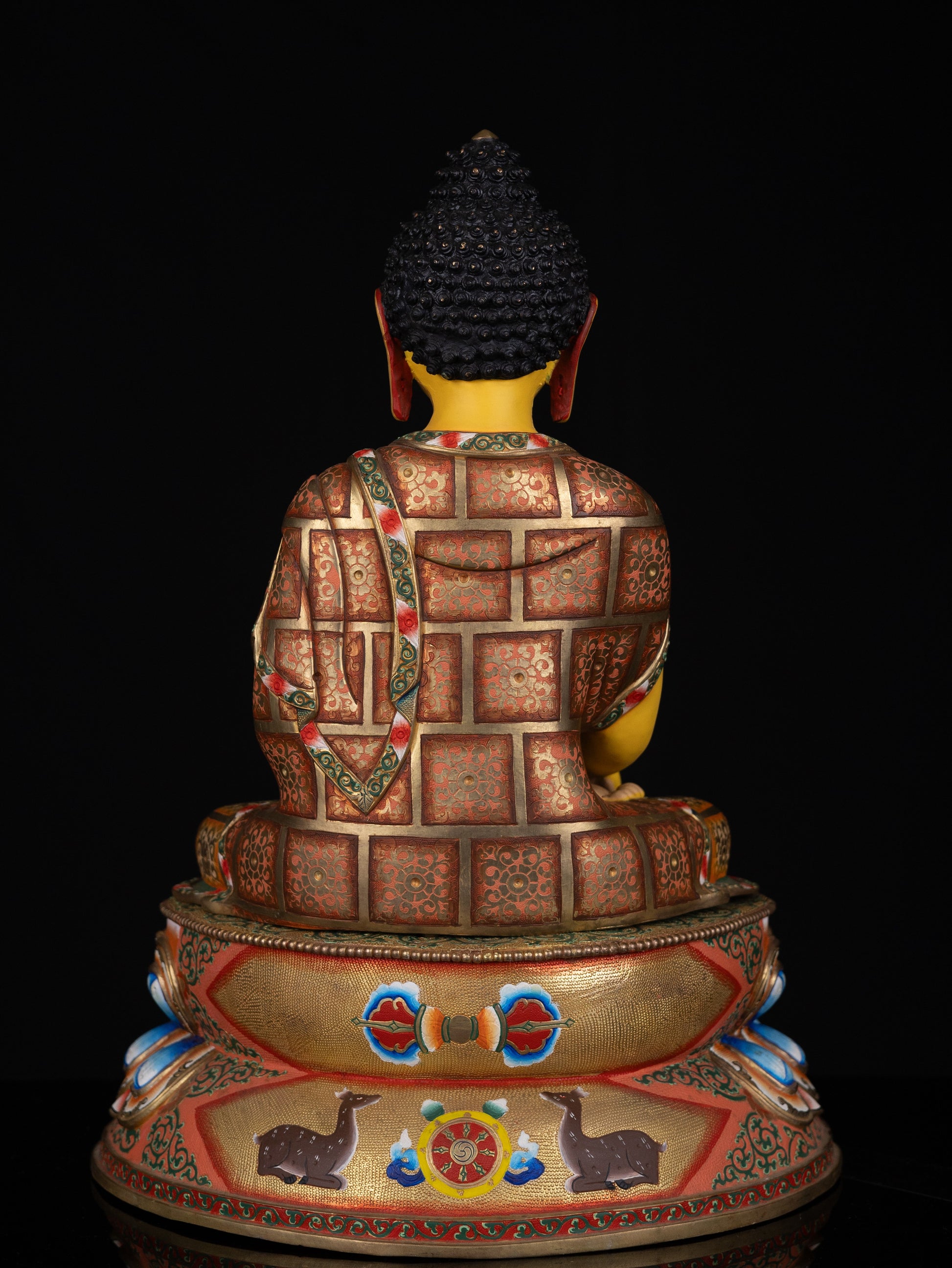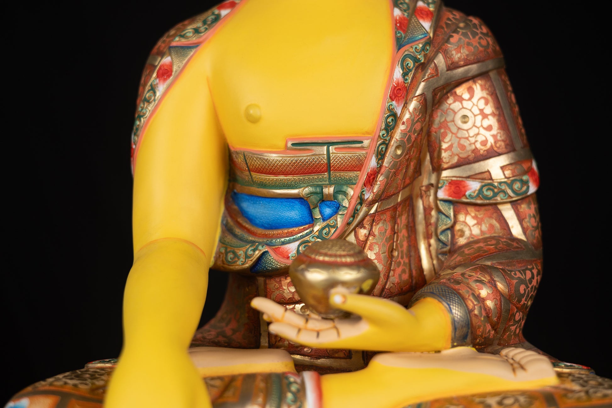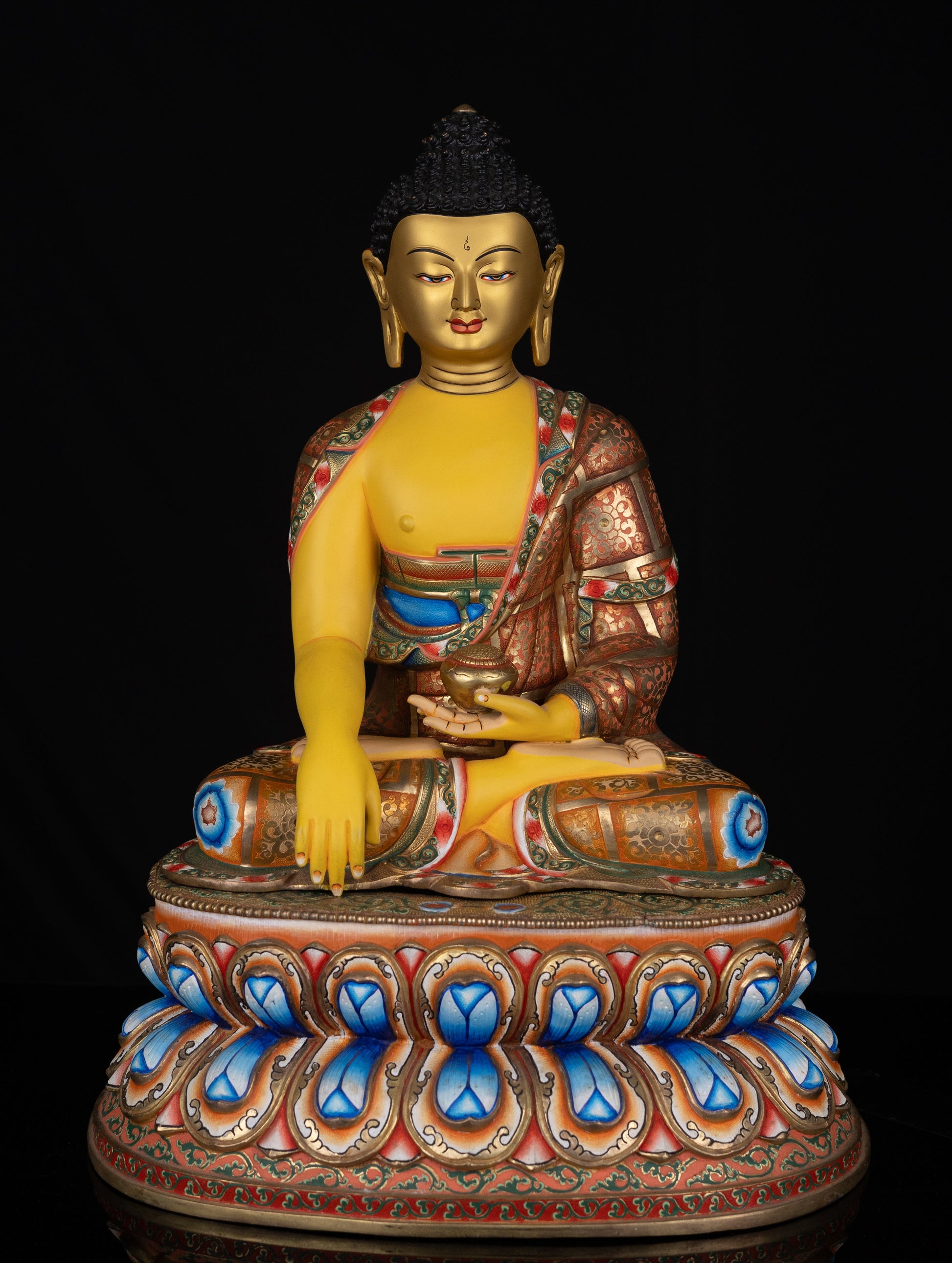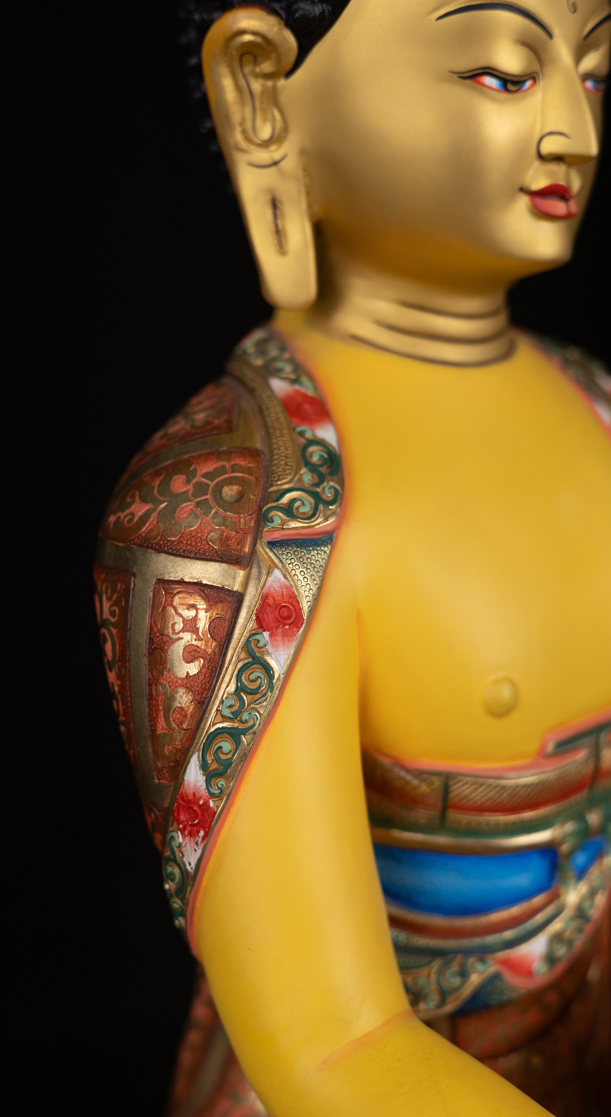 This Beautiful Tibetan Buddhism Gold Face Lord Shakyamuni Buddha Hand Painting Yellow Multi-color Copper Statue Sculpture Figure made in Nepal.