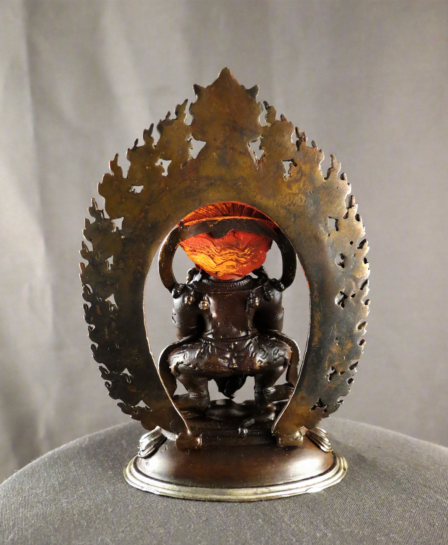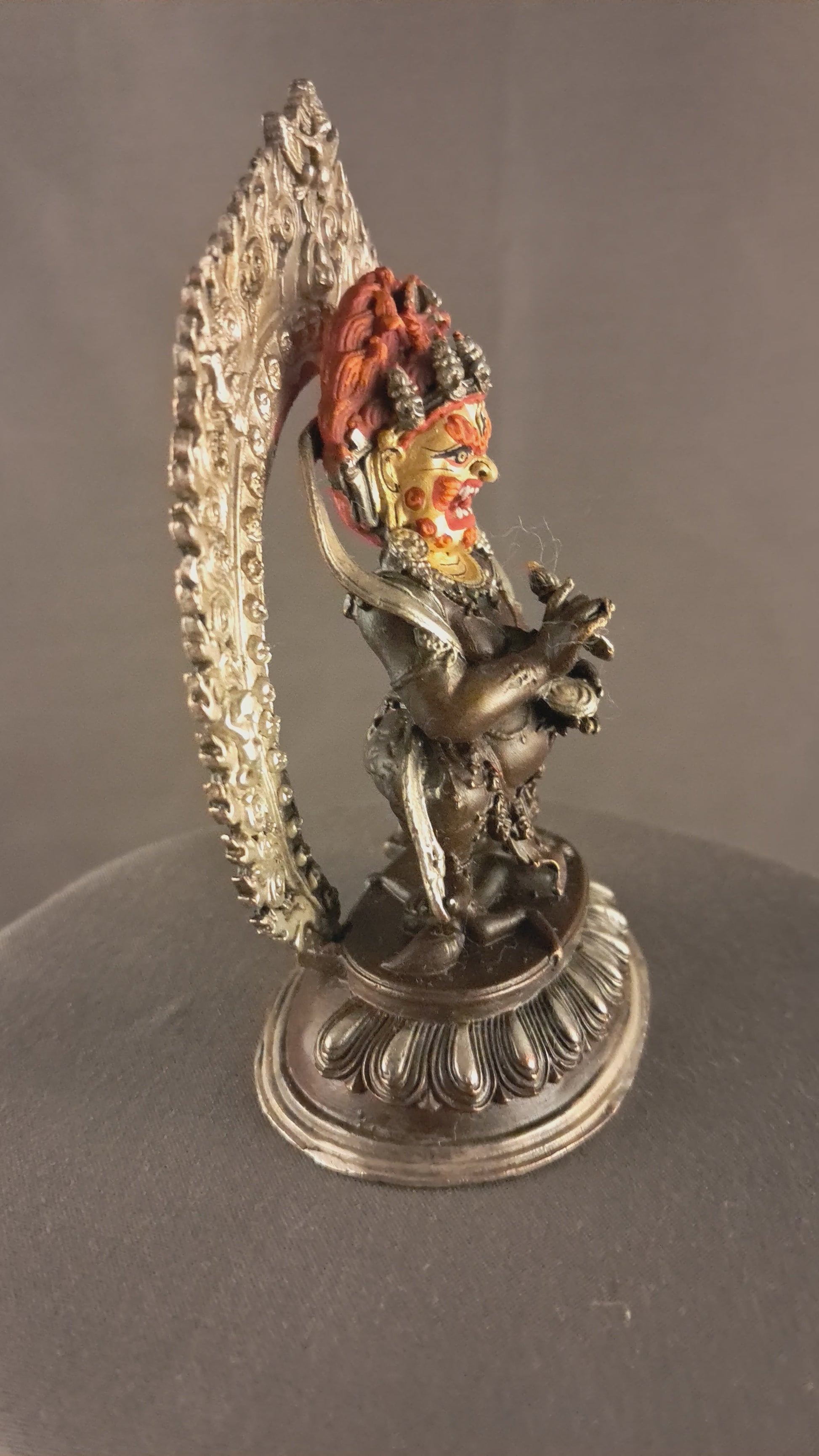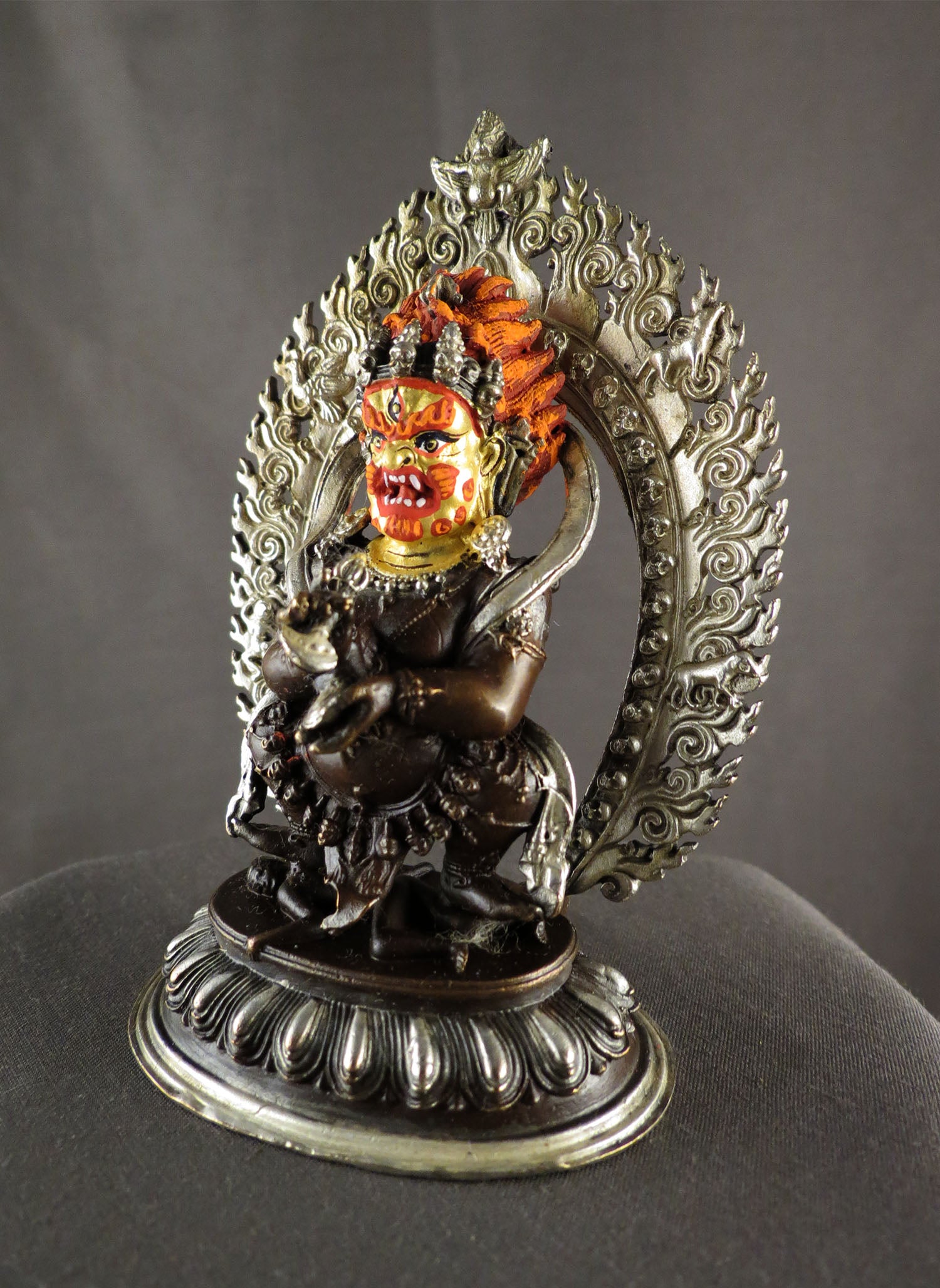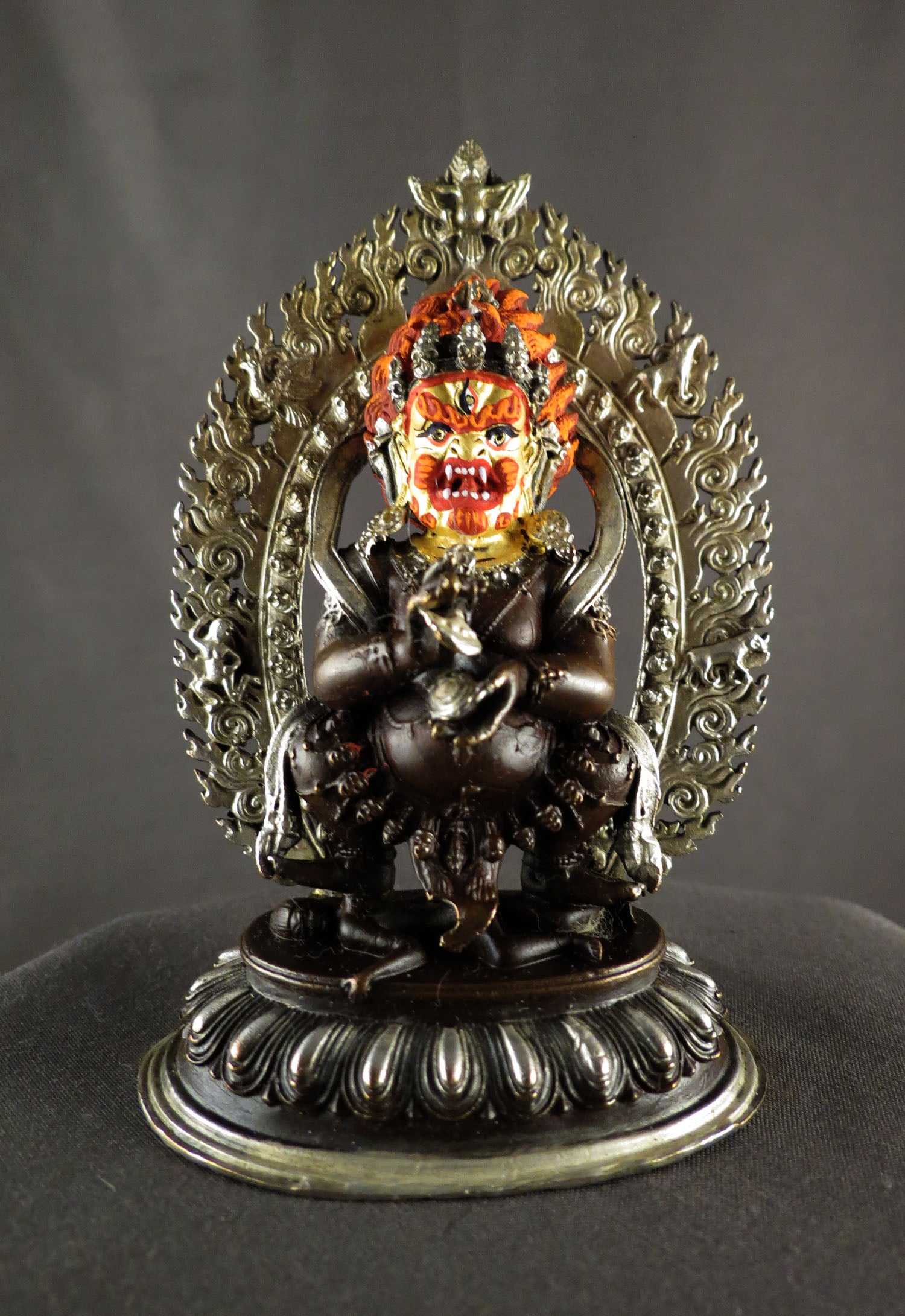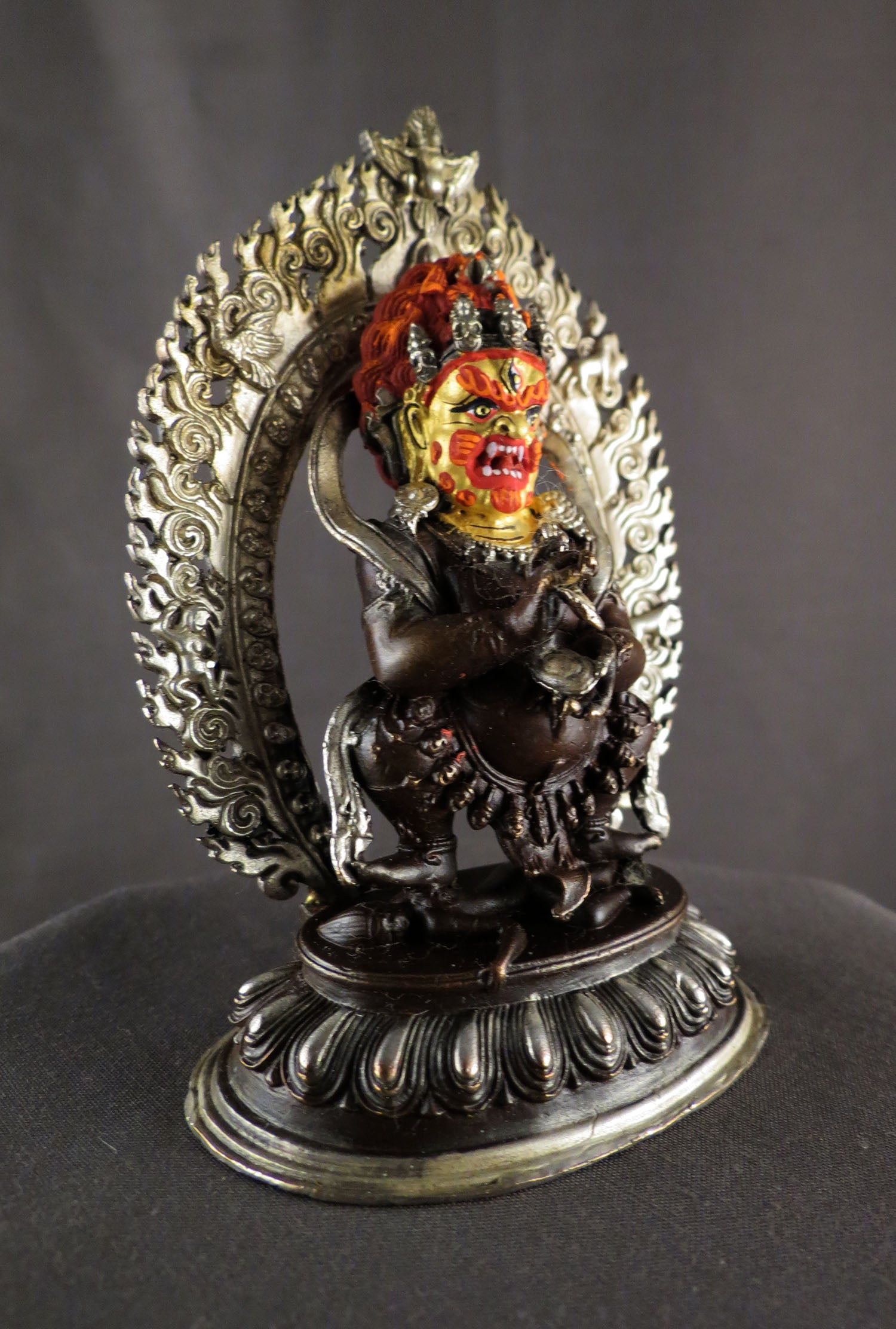 This Beautiful Handmade Hand craved Tibetan Buddhism Gold Face Hand Painting Protecter Wrathful Deity God Black Mahakala Bhairav Silver Oxide Copper Statue made by Artists of Nepal.