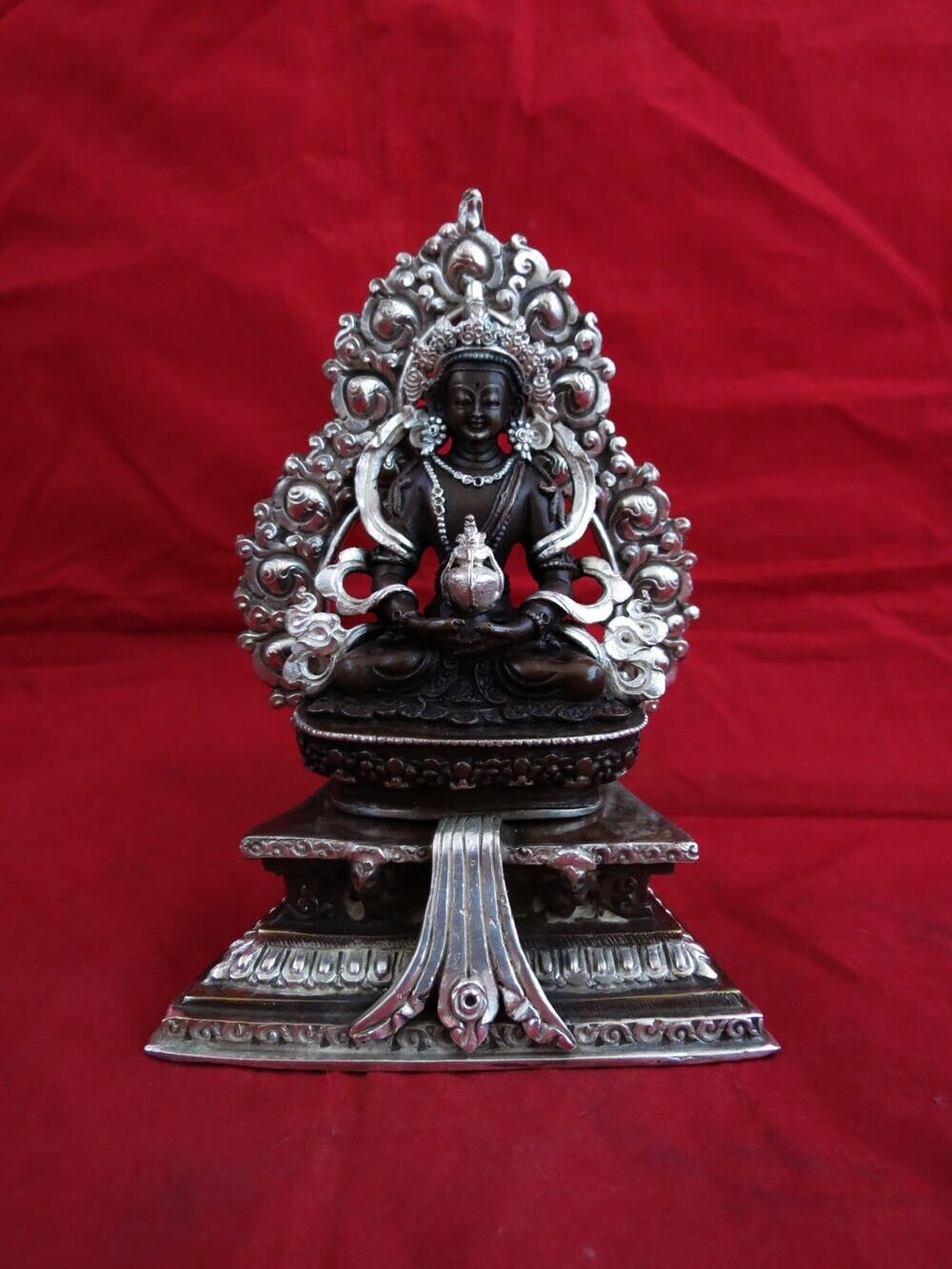 This Beautiful Handmade Buddhism Lord Aparmita (Amitayus) Fine Copper Silver Oxide Statue made by Artists of Nepal.