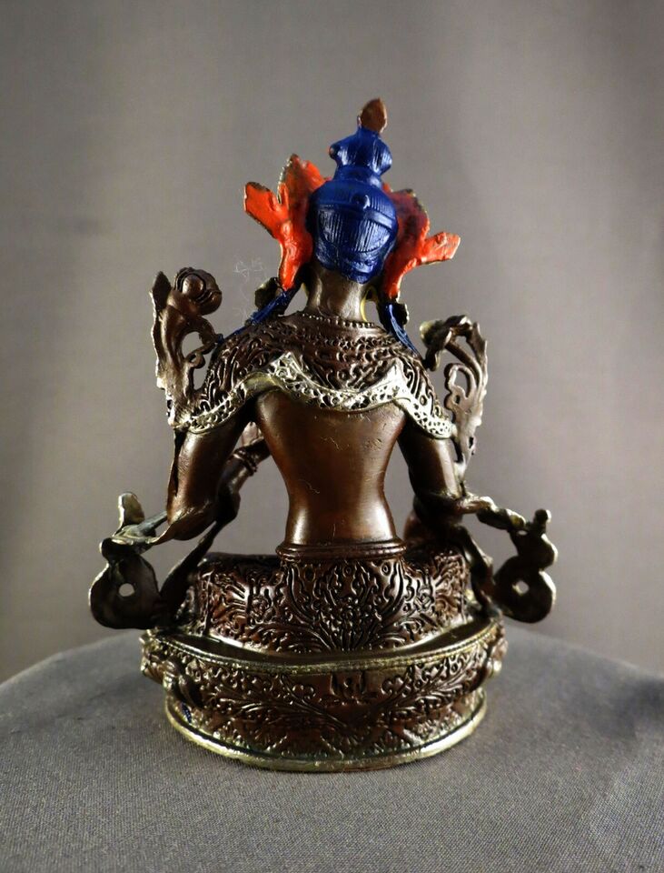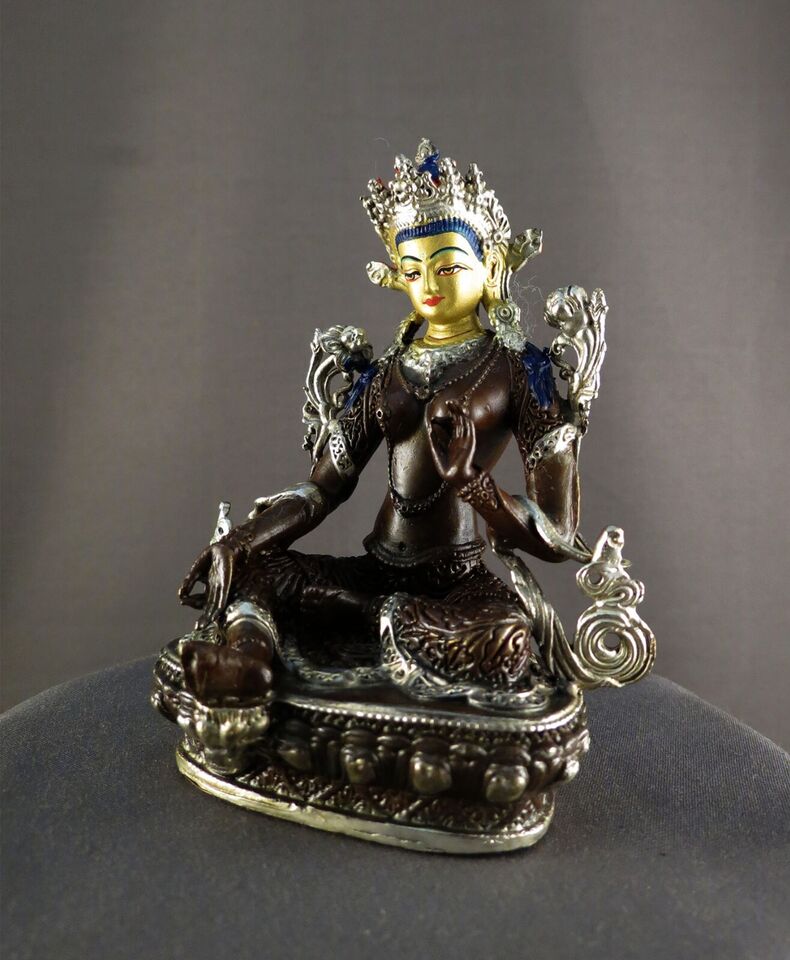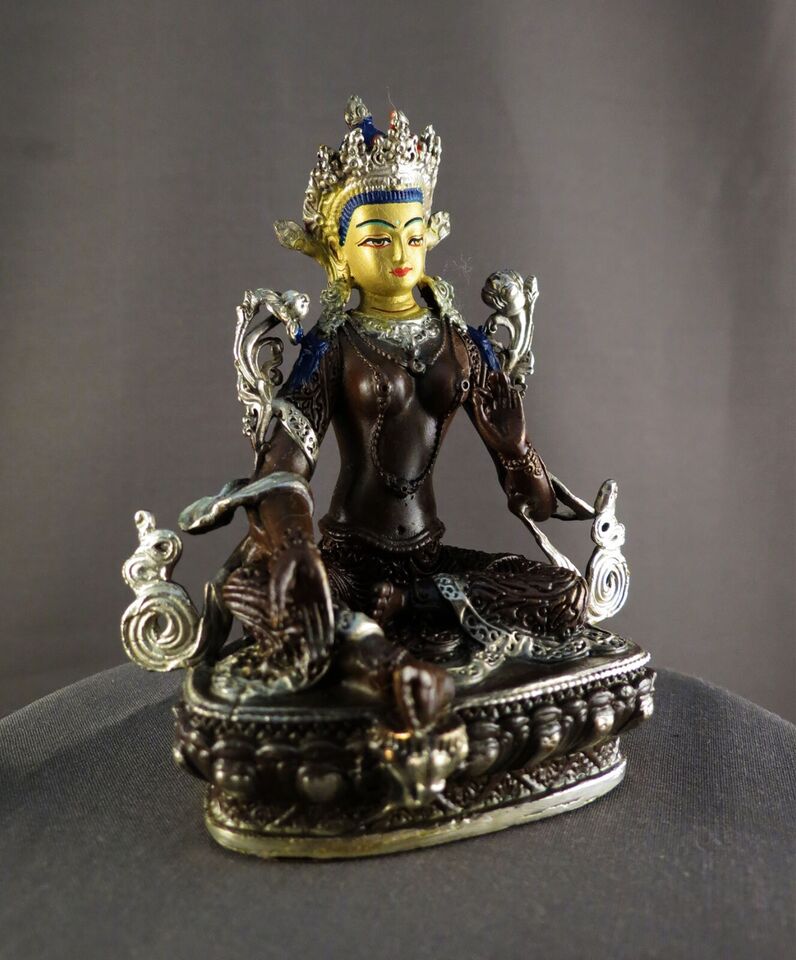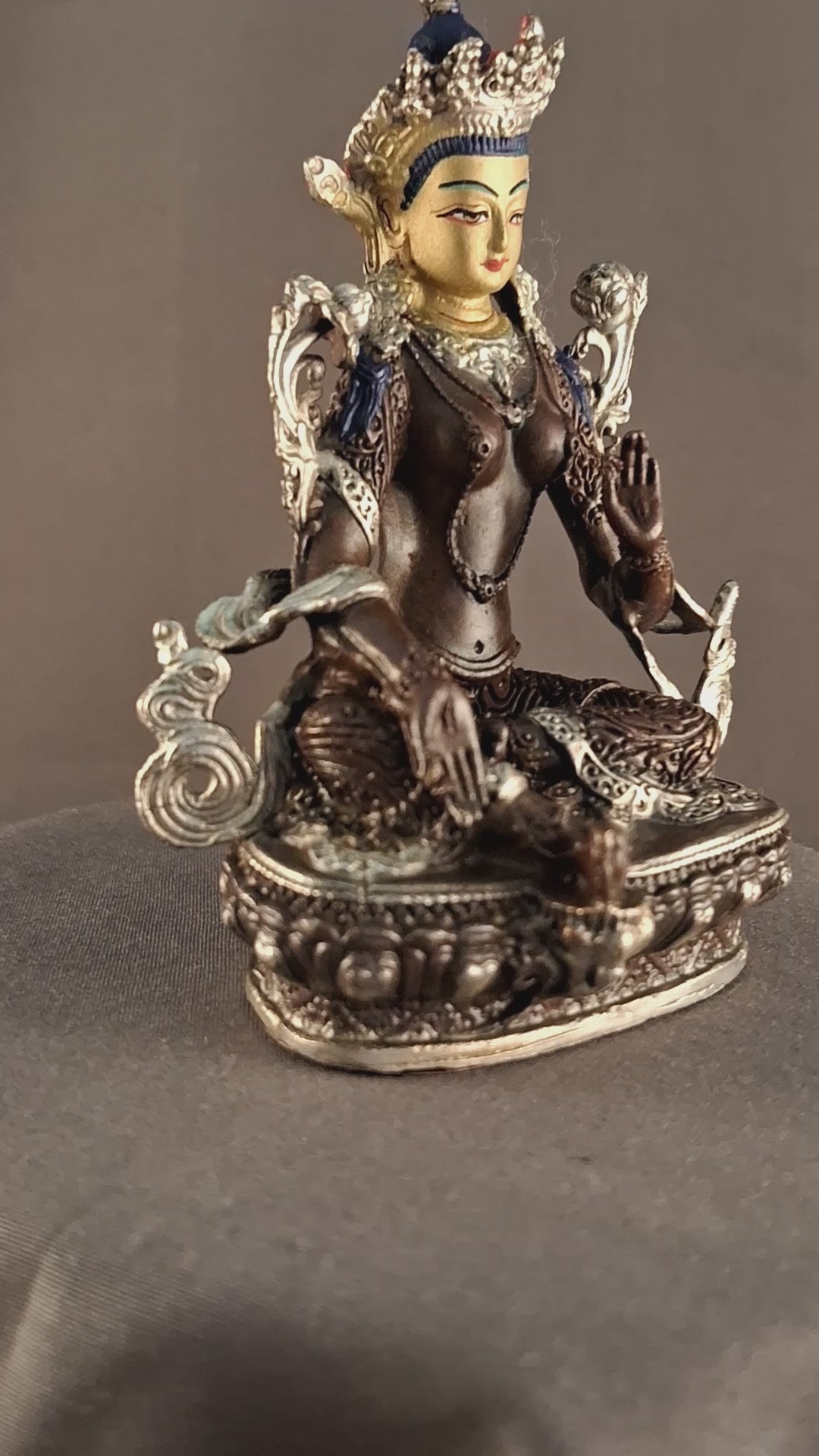 This Beautiful Handmade Buddhism Goddess Green Tara Gold Face Hand Painting Copper Oxide Silver Plated Statue made by Artists of Nepal.