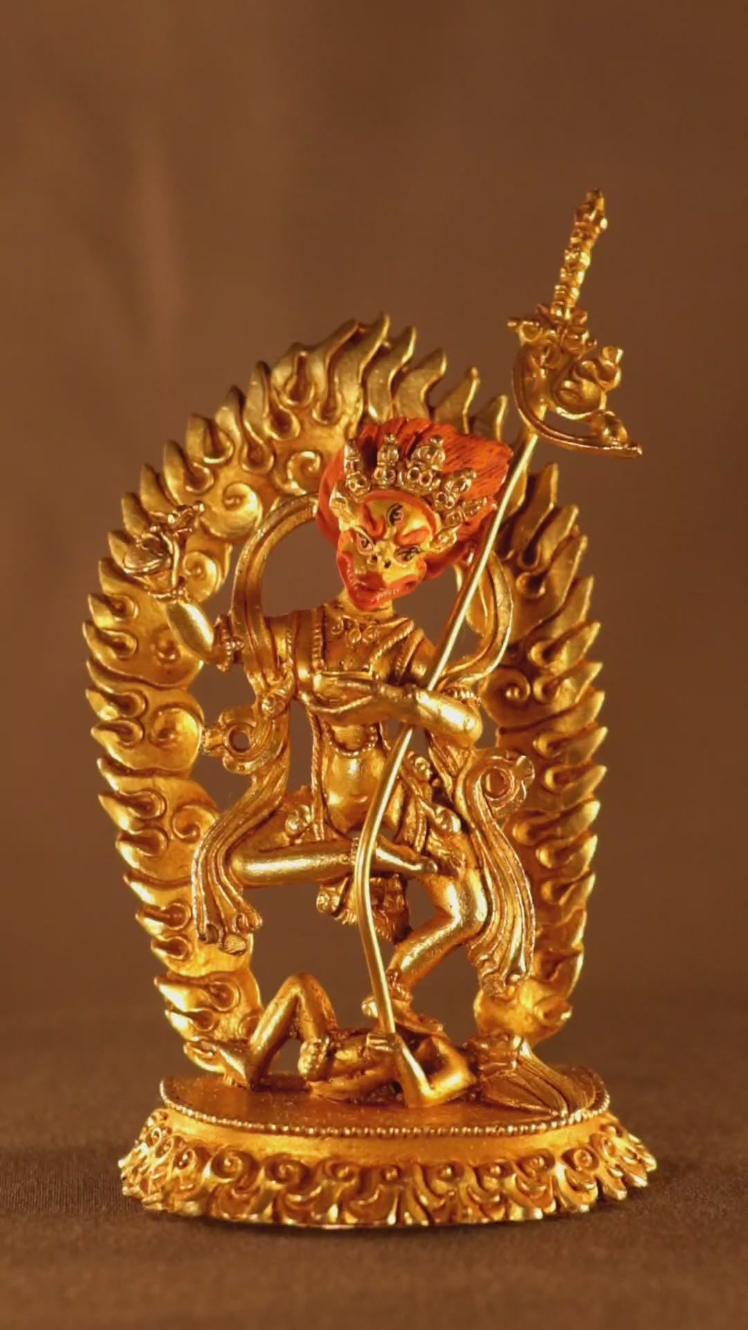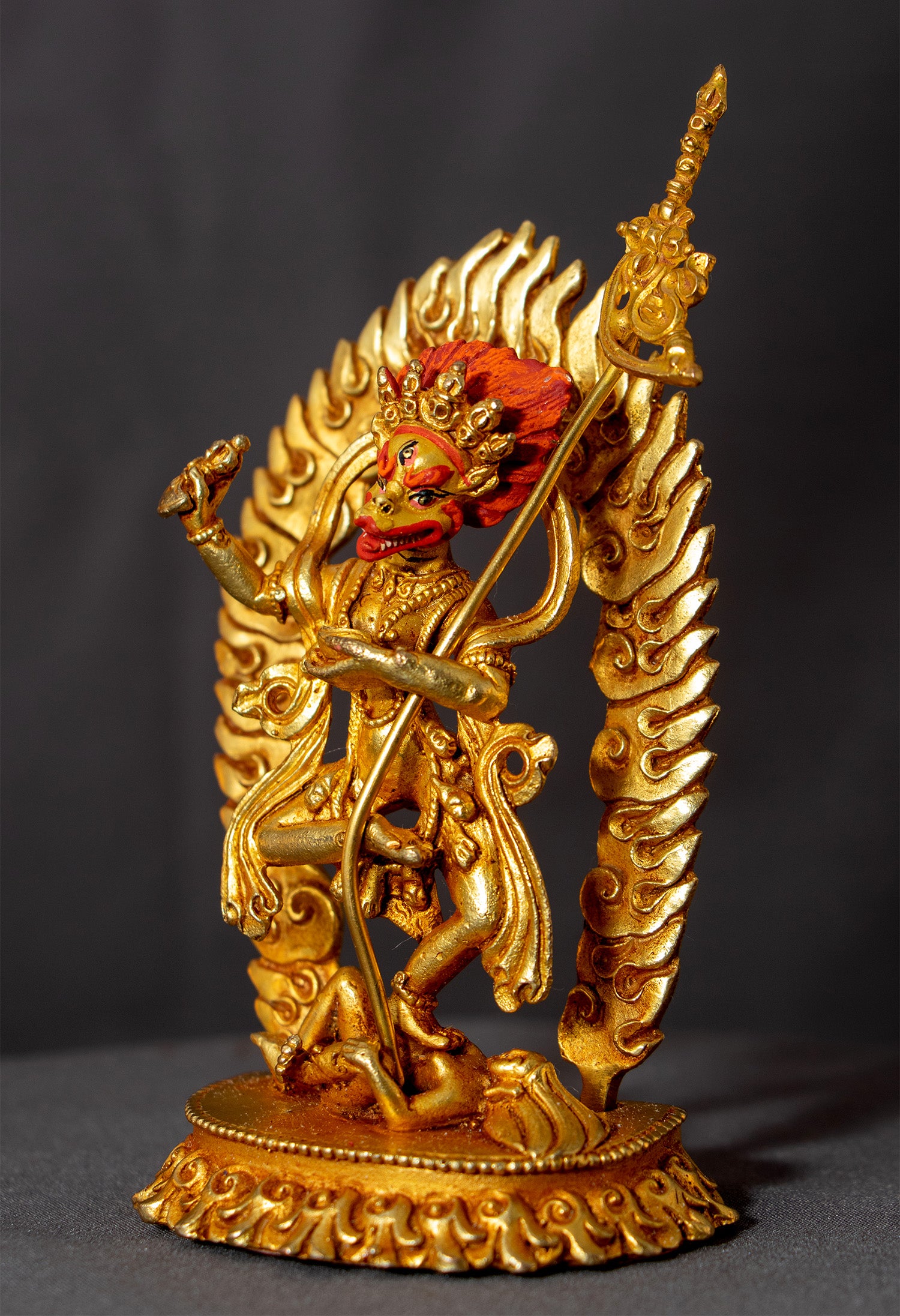 This Beautiful Handmade Hand craved Buddhism Gold Face Hand Painting Goddess Simha Mukhi Dakini Gold Plated Body Statue made by Artists of Nepal.