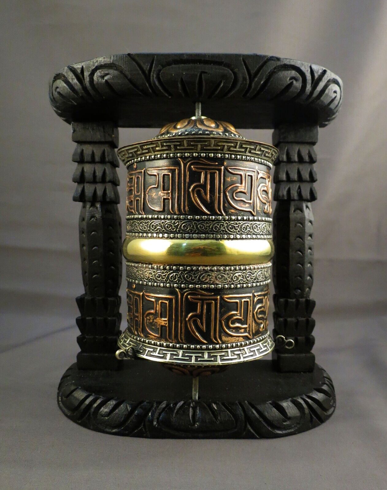 Buddhism Om Mantra Copper Meditation Offering Copper Oxide Wooden Frame Offering Prayer Wheel Nepal