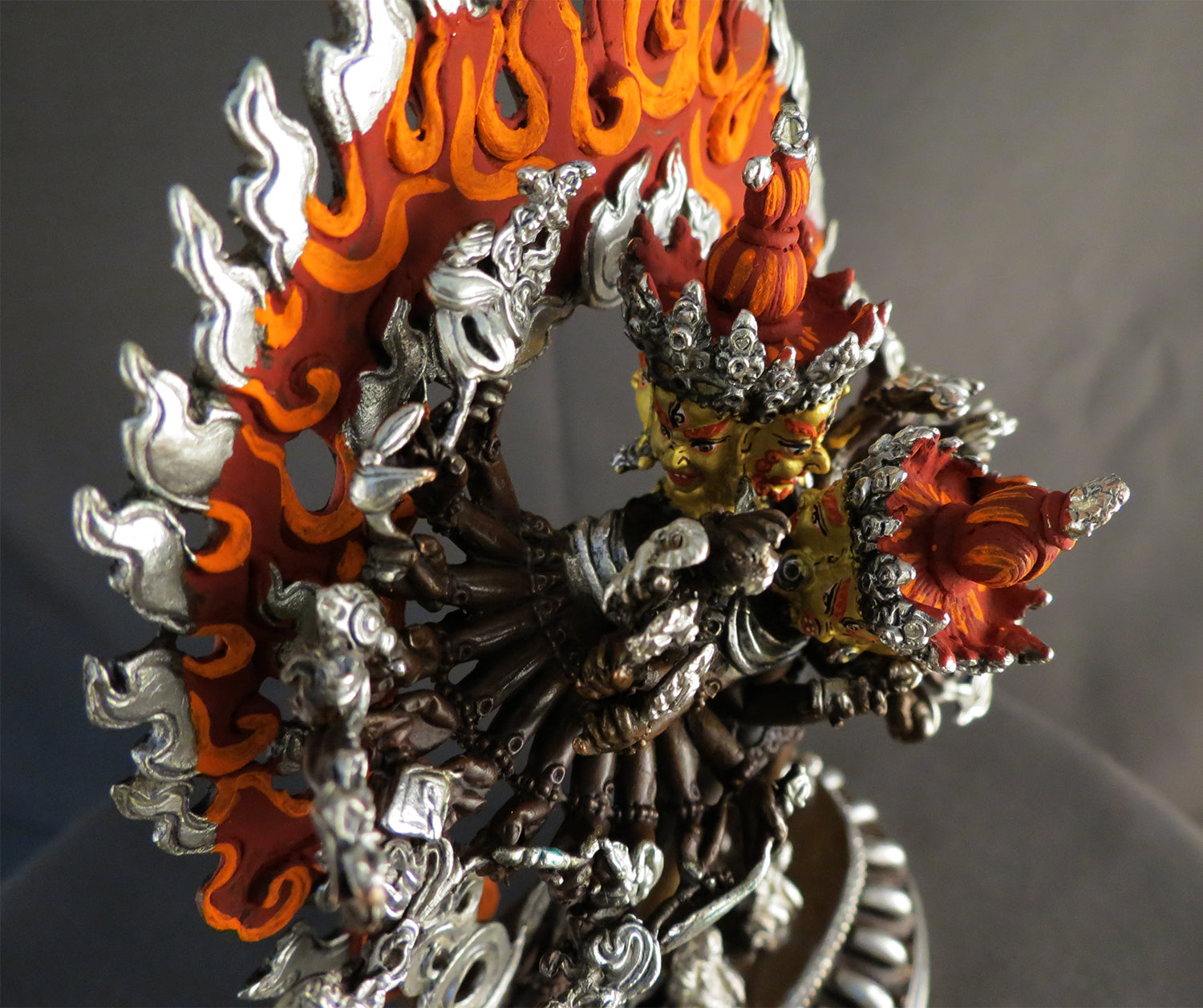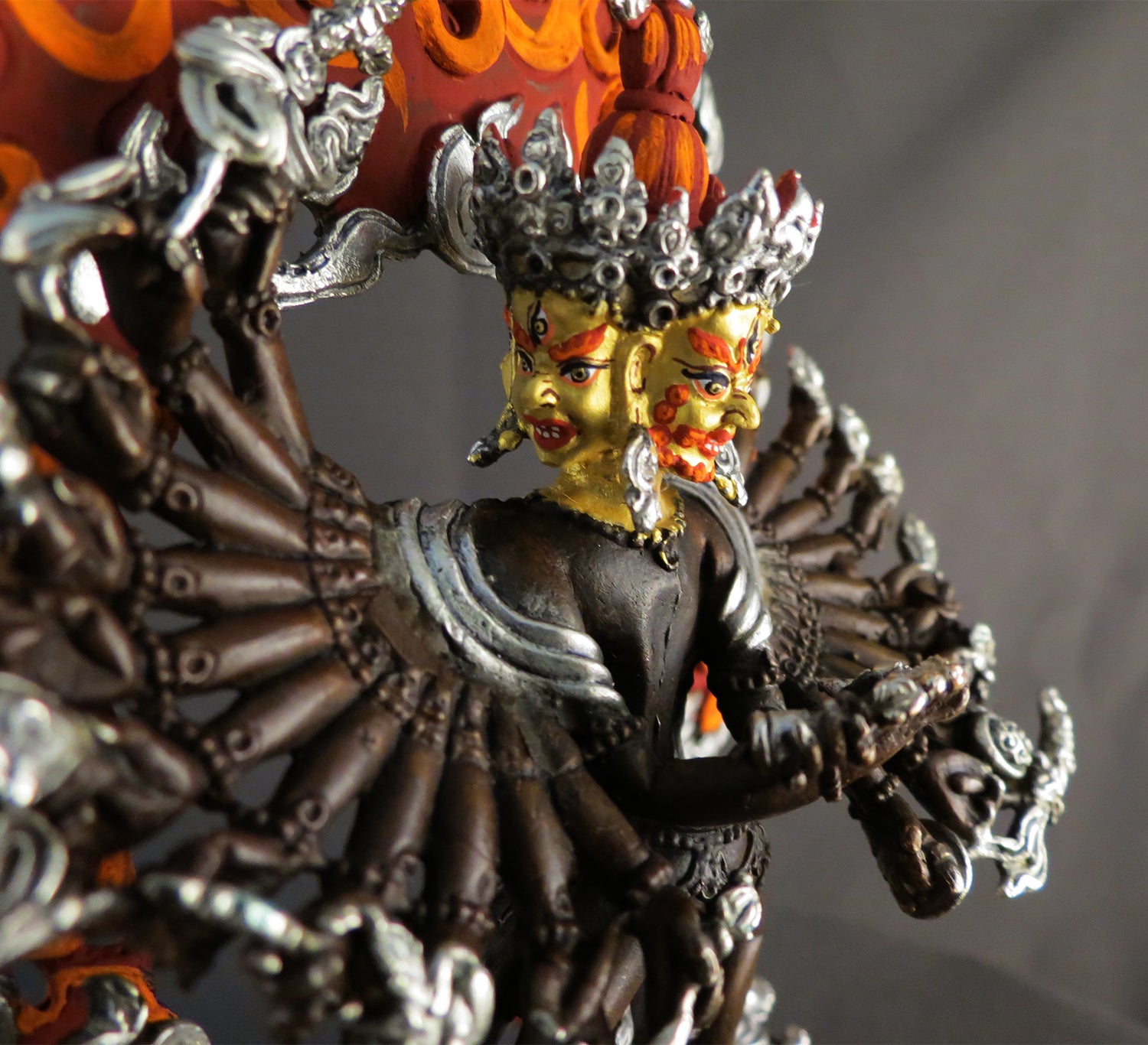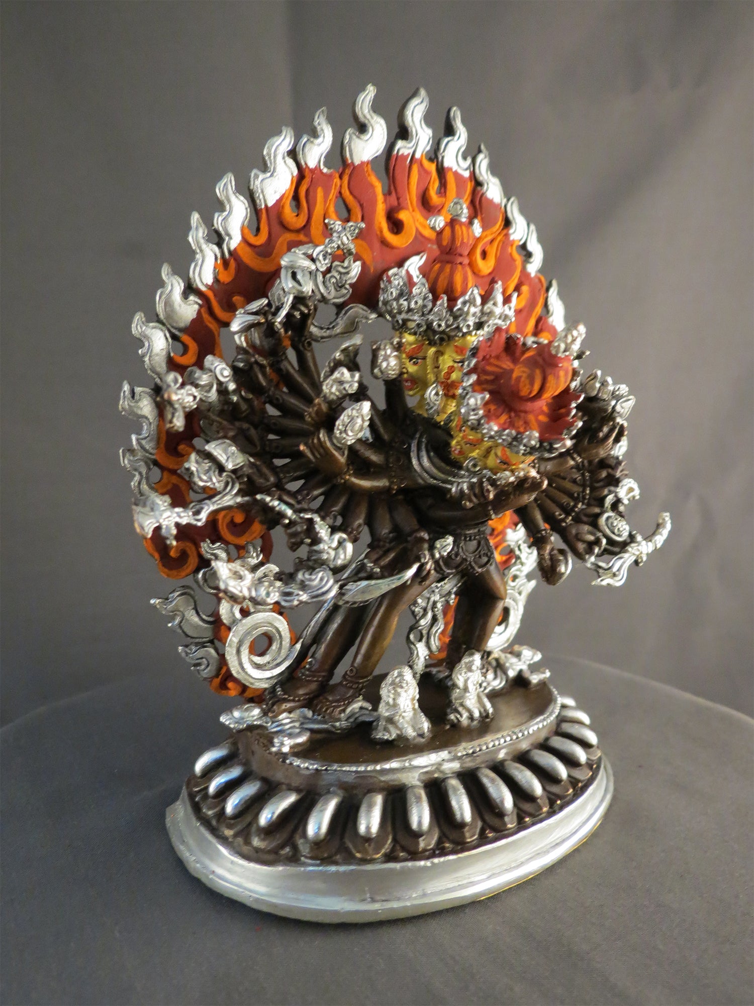 This Beautiful Handmade Hand Craved Hand Painting Gold Face Tibetan Buddhism Lord Kalachakra with Consort Copper Oxide Silver Plated Statue made in Nepal.