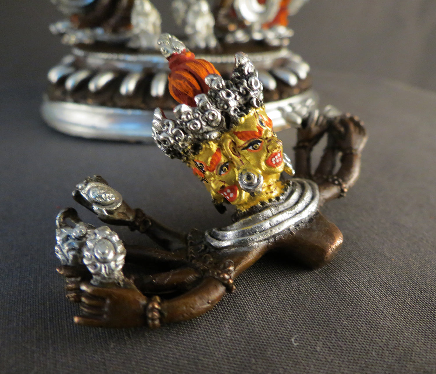 Kalachakra god protector who turns the wheel of life. Kalachakra is the title of a work in one of the divisions of the kangyur. It is possible that Kalachakra is a personification of that work. Kalachakra is usually as a Yidam with four head on each of which is a third eye. He may have twelve or twenty four arms but never has more than two legs. In his Yi-dam form he is dark blue. His body is covered by tiger skin. He wears a belt formed of vajras. He is always represented stepping to the left on two prostrate personages or demon, with four arms. The personage under the right foot holds a bow and arrow the once under the left a Trident and Khatvanga.