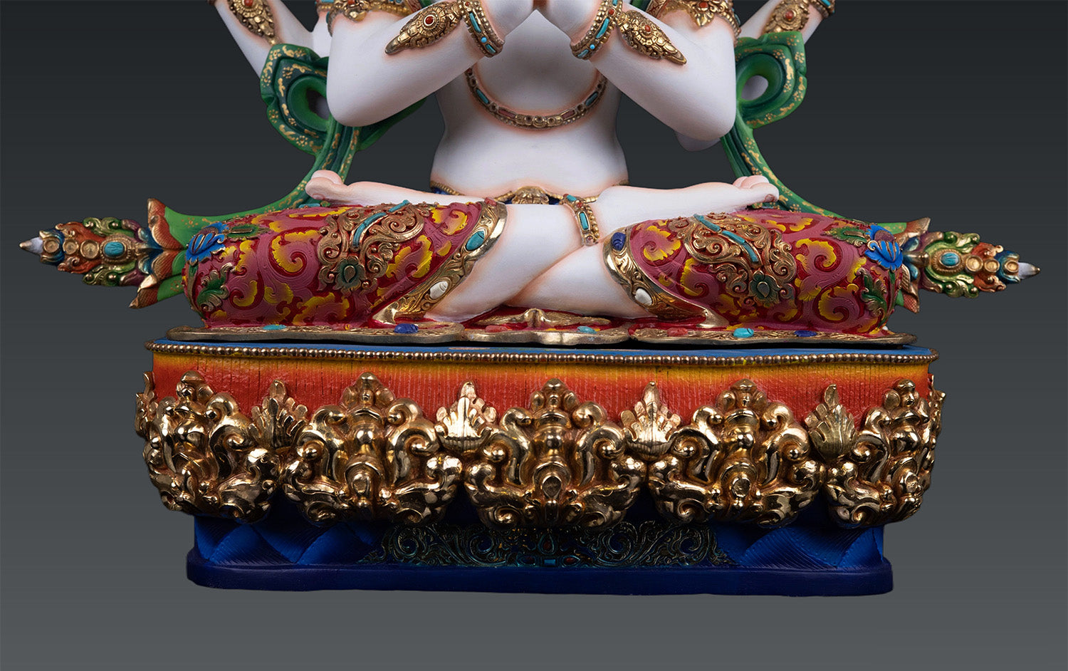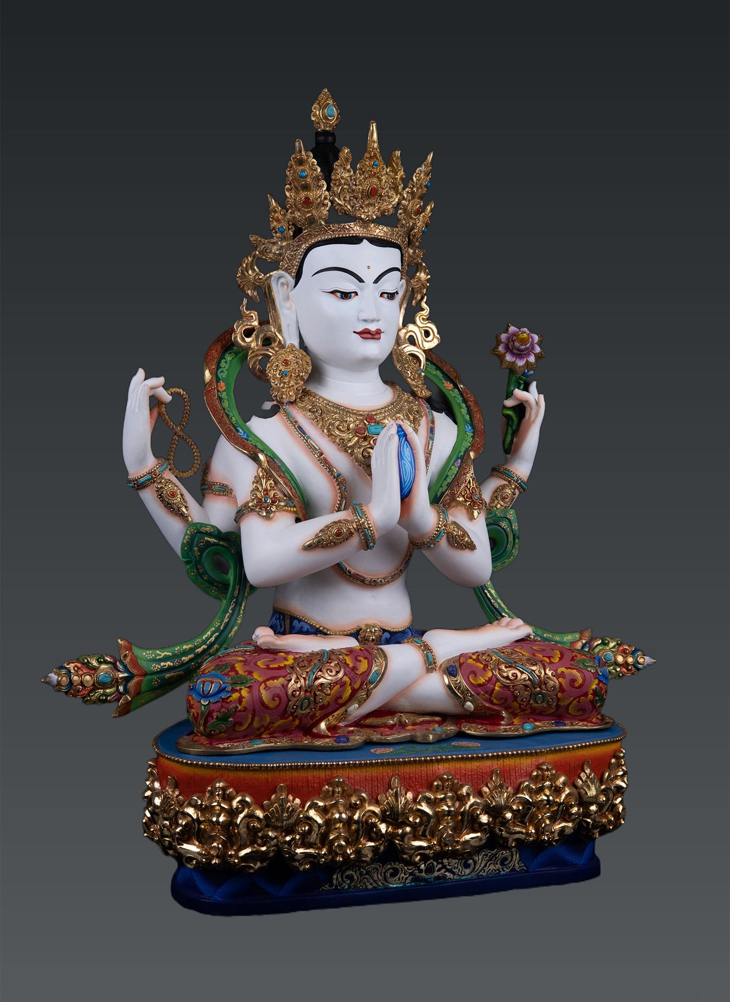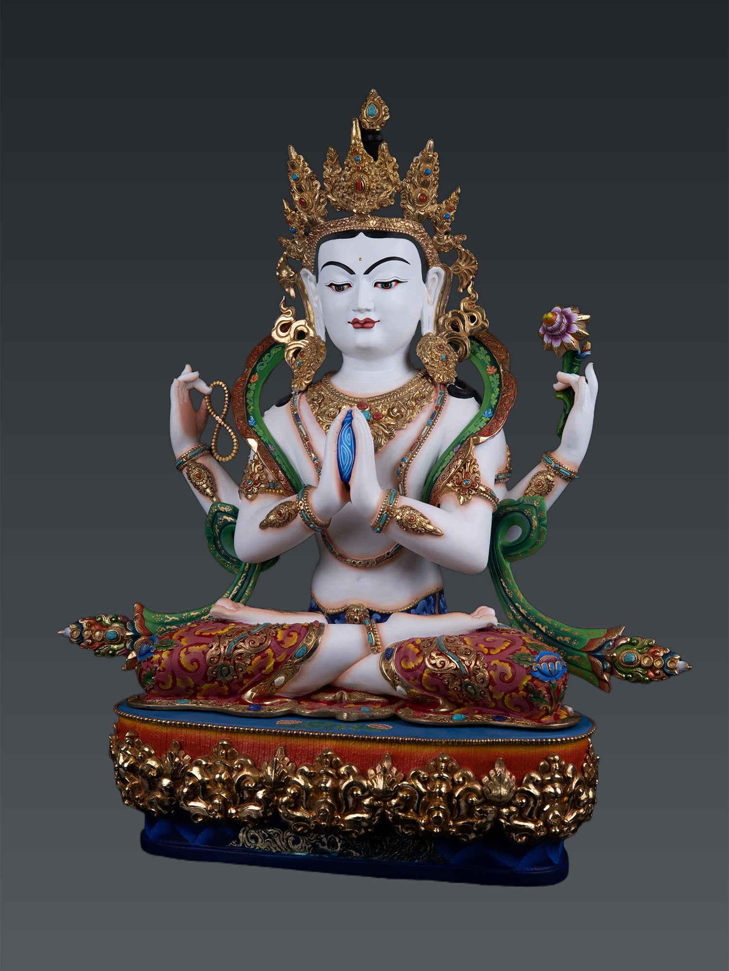 In the Tibetan Buddhist pantheon of enlightened beings, Chenrezig is renowned as the embodiment of the compassion of all the Buddhas, the Bodhisattva of Compassion. Avalokiteshvara is the earthly manifestation of the self born, eternal Buddha, Amitabha. He guards this world in the interval between the historical Sakyamuni Buddha, and the next Buddha of the Future Maitreya.