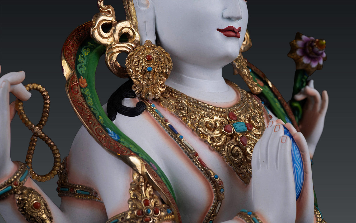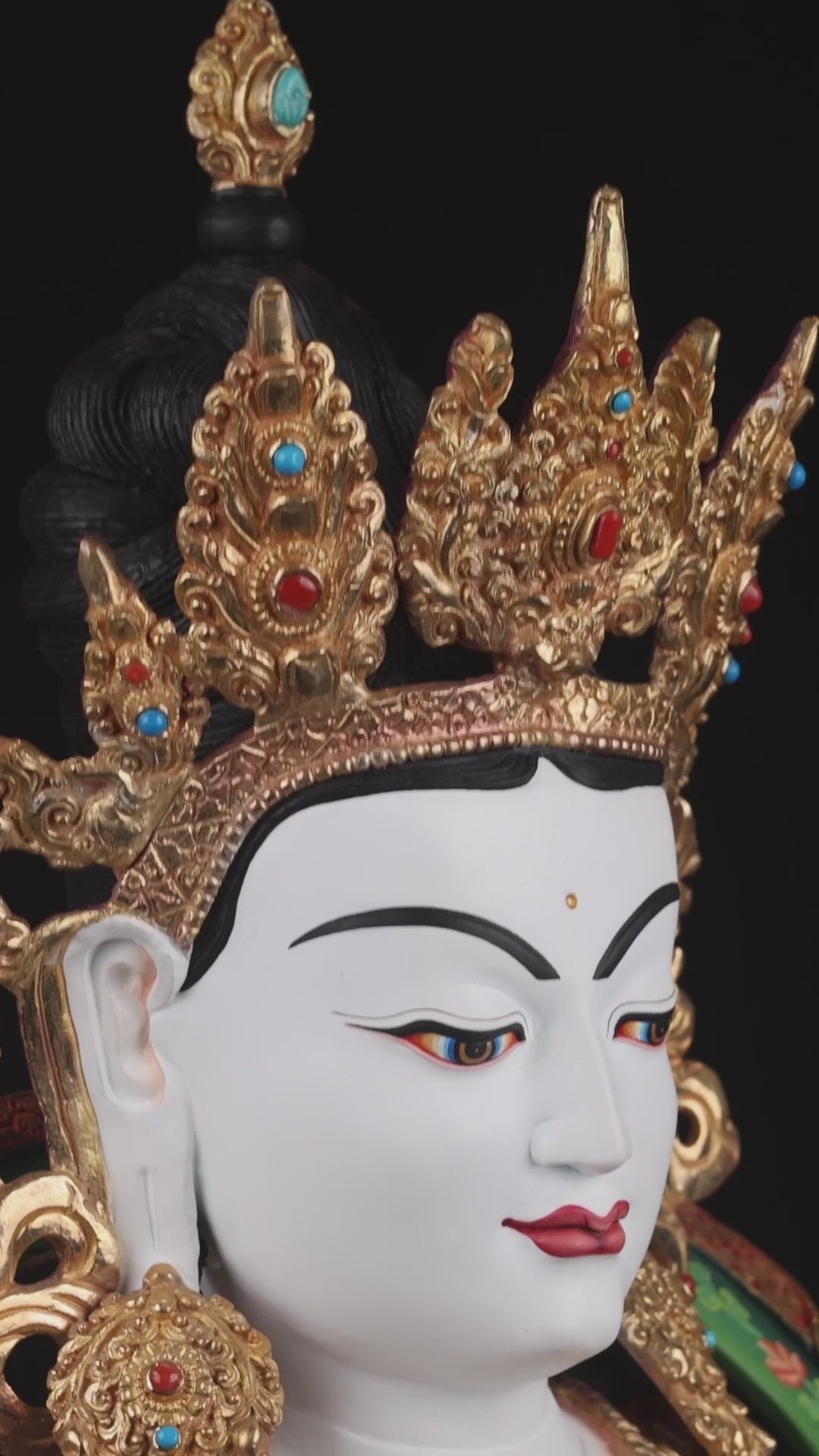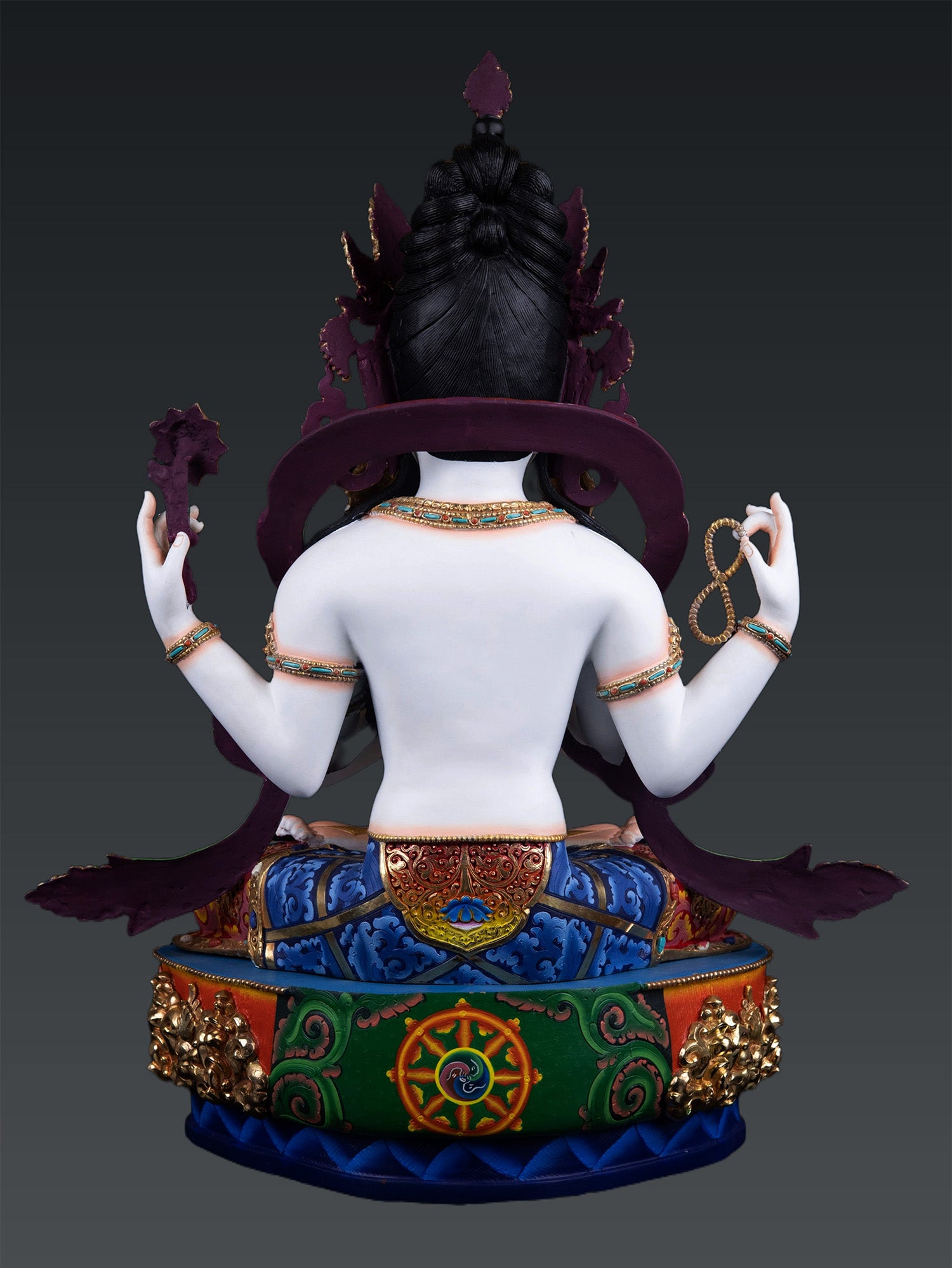 In the Tibetan Buddhist pantheon of enlightened beings, Chenrezig is renowned as the embodiment of the compassion of all the Buddhas, the Bodhisattva of Compassion. Avalokiteshvara is the earthly manifestation of the self born, eternal Buddha, Amitabha. He guards this world in the interval between the historical Sakyamuni Buddha, and the next Buddha of the Future Maitreya.
