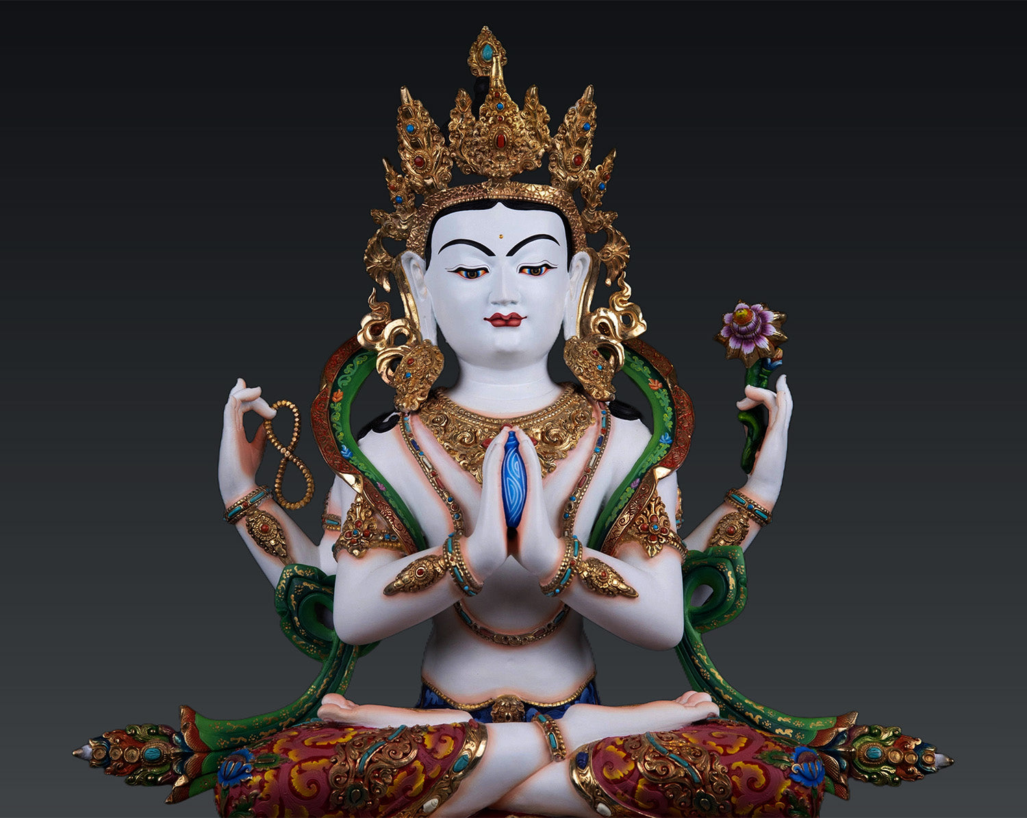 Chenrezig may be the most popular of all Buddhist deities, except for Buddha himself -- he is beloved throughout the Buddhist world. He is known by different names in different lands: as Avalokiteshvara in the ancient Sanskrit language of India, as Kuan-yin in China, as Kannon in Japan. As Chenrezig, he is considered the patron Bodhisattva of Tibet, and his meditation is practiced in all the great lineages of Tibetan Buddhism. The beloved king Songtsen Gampo was believed to be an emanation of Chenrezig, and some of the most respected meditation masters (lamas), like the Dalai Lamas and Karmapa's, who are considered living Buddhas, are also believed to be emanations of Chenrezig.