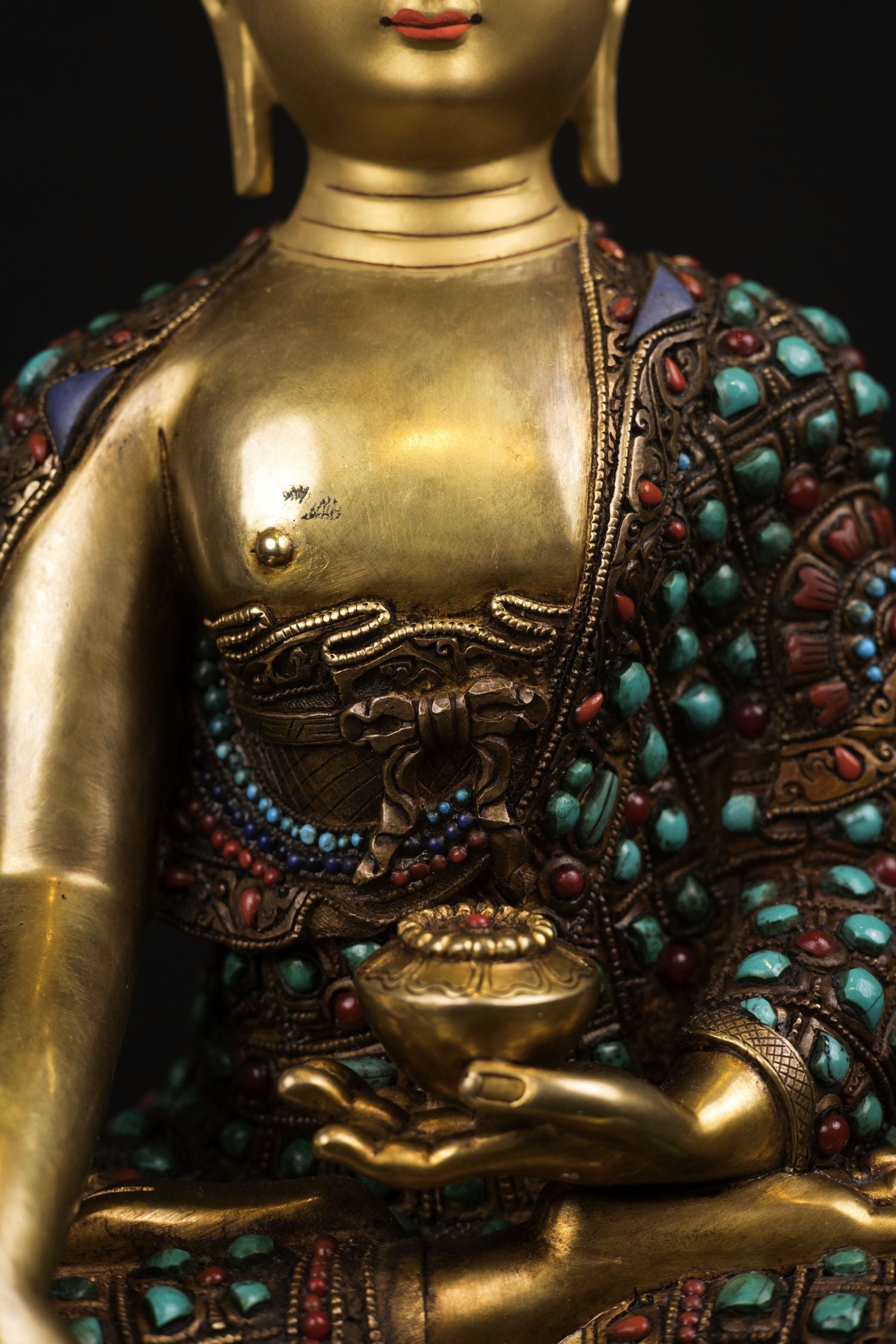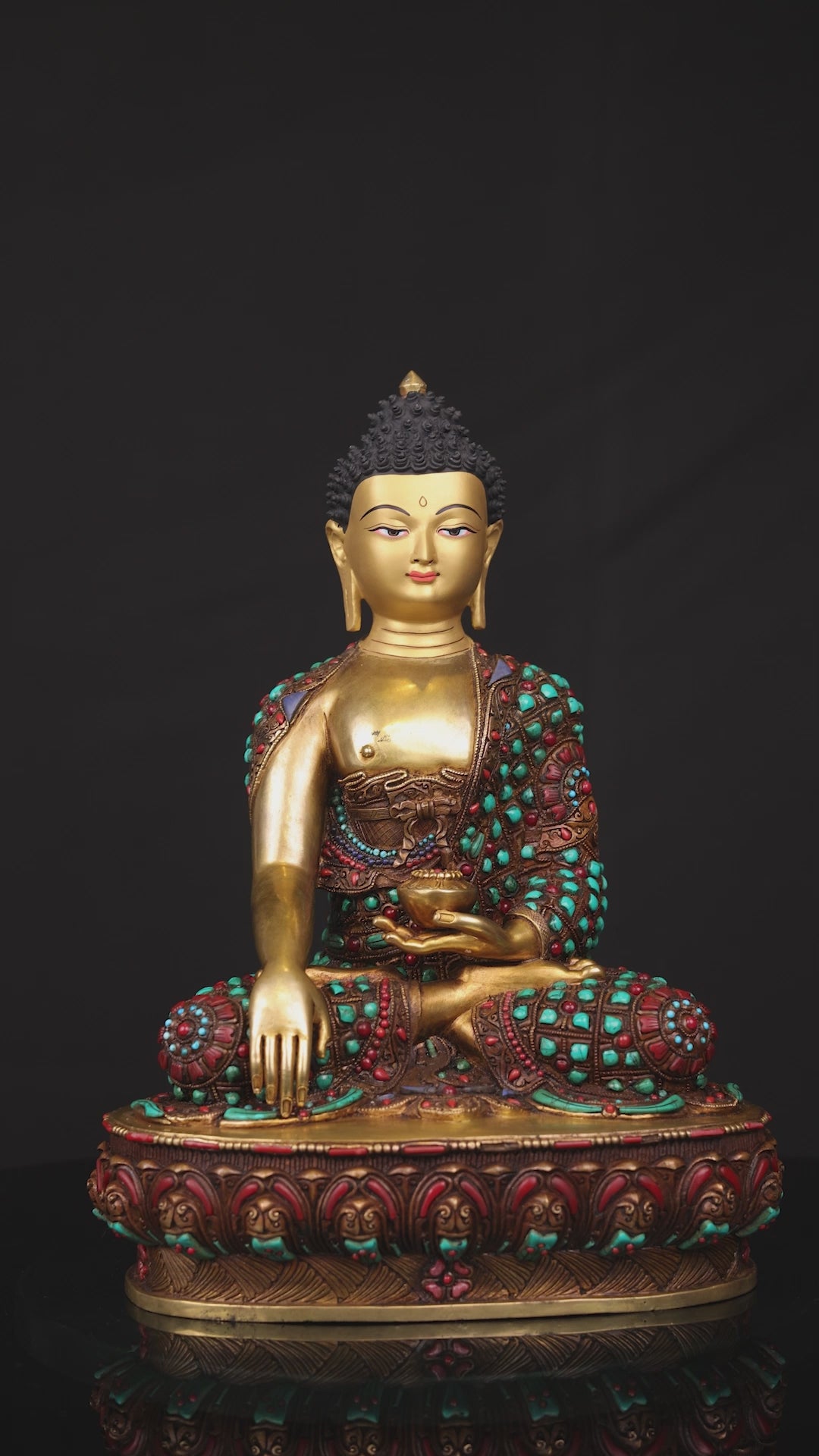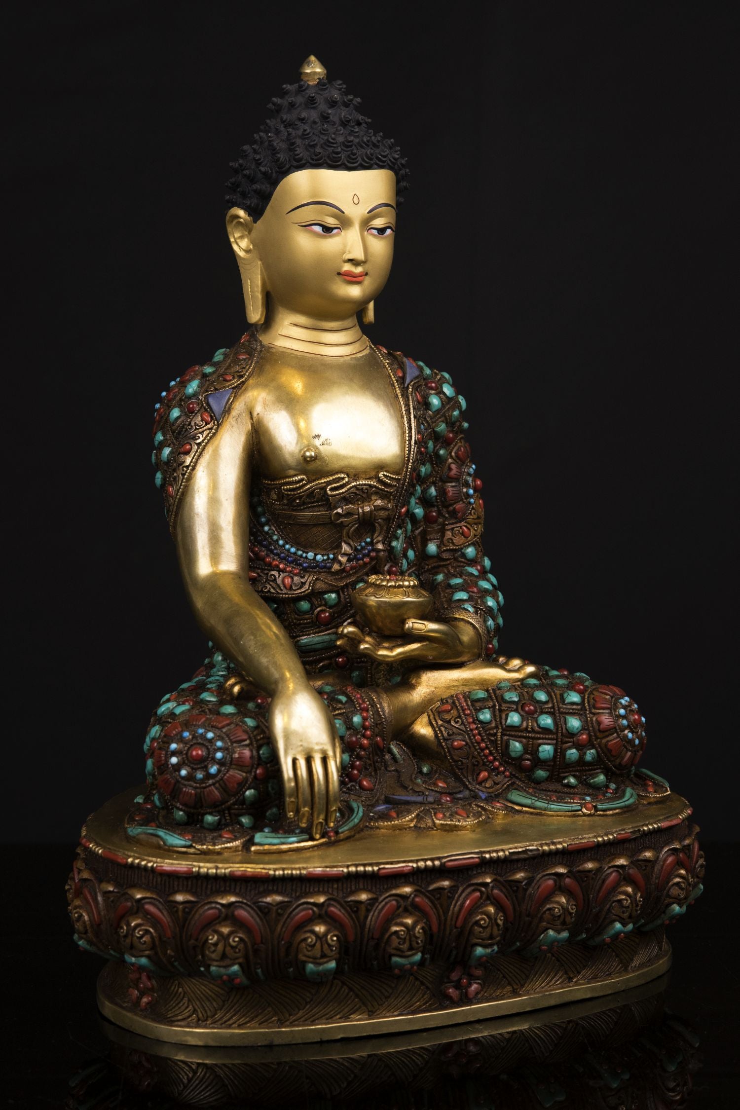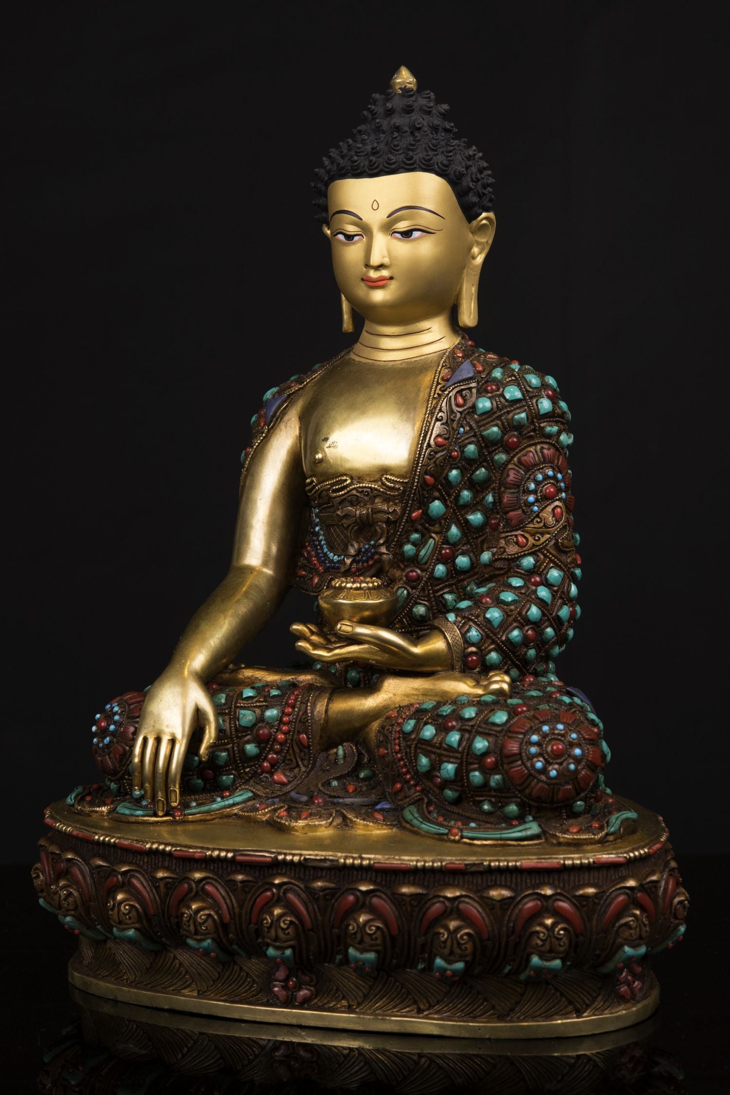 This Beautiful Handmade Gold Hand Painting Fac Shakyamuni Buddha Rare Stone Turquoise, Coral, Lapiz Lord Copper Statue made by Artists of Nepal.