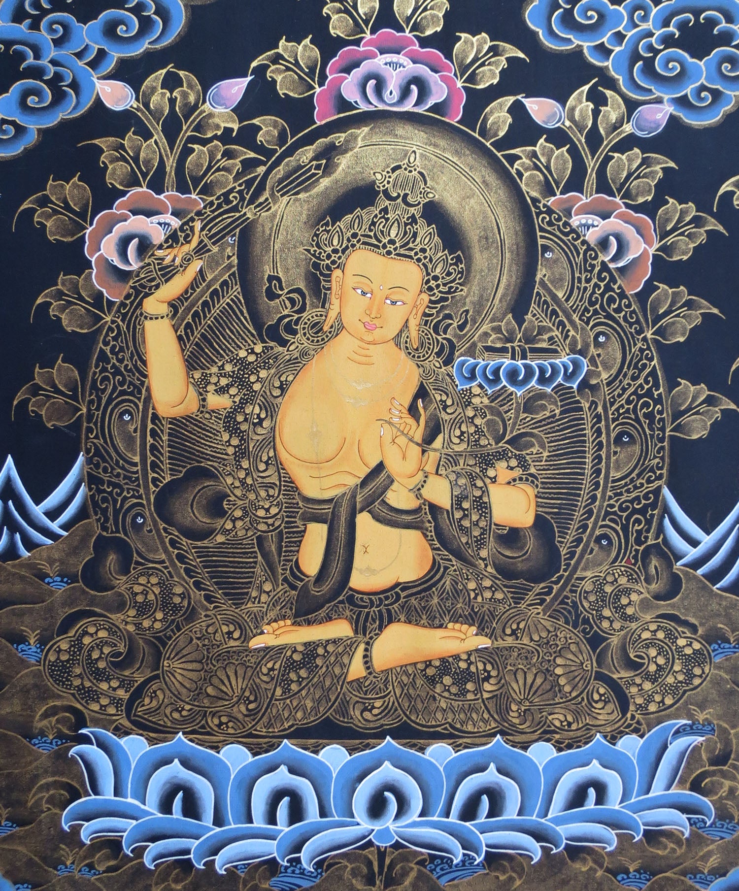 This Beautiful Finest 3 in 1 Lama Hand Painting in Handmade Canvas Cloth Tibetan Buddhism Lord Maha Manjushri, Chenrezig and Vajrapani Thangka Hand Painting Natural Color made in Nepal.