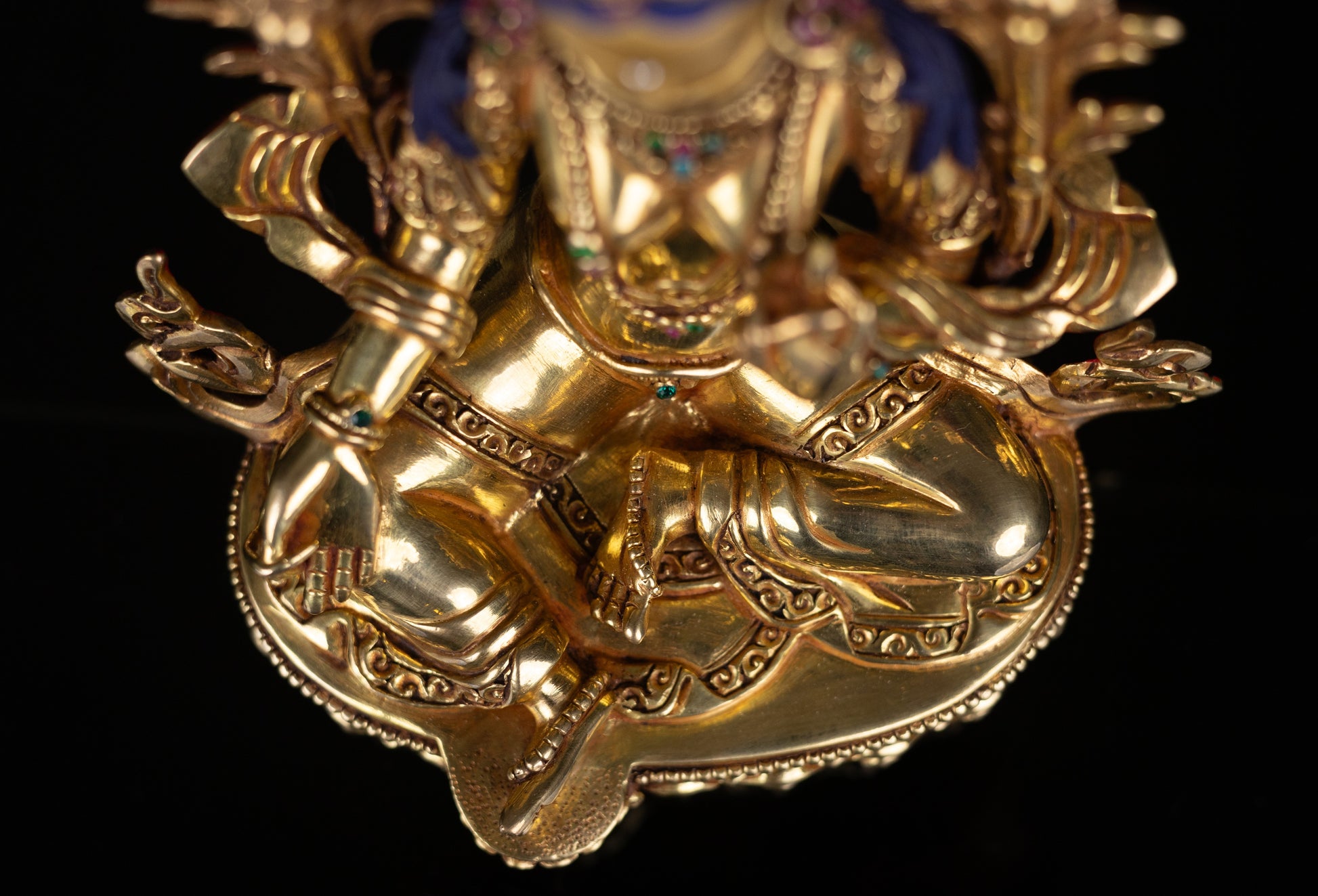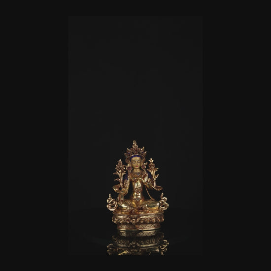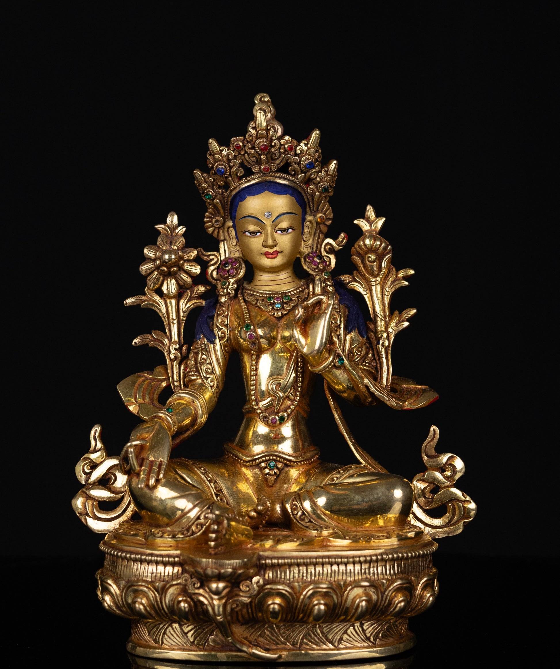 This Beautiful Fine Handmade Gold Face Hand Painting Tibetan Buddhism Gold Face Hand Painting Goddess Green Tara Rupa with Turquoise Coral Stone Copper Statue made by Artists of Nepal.