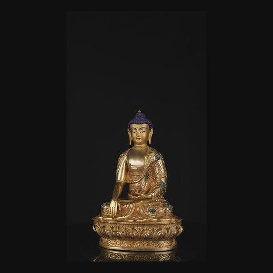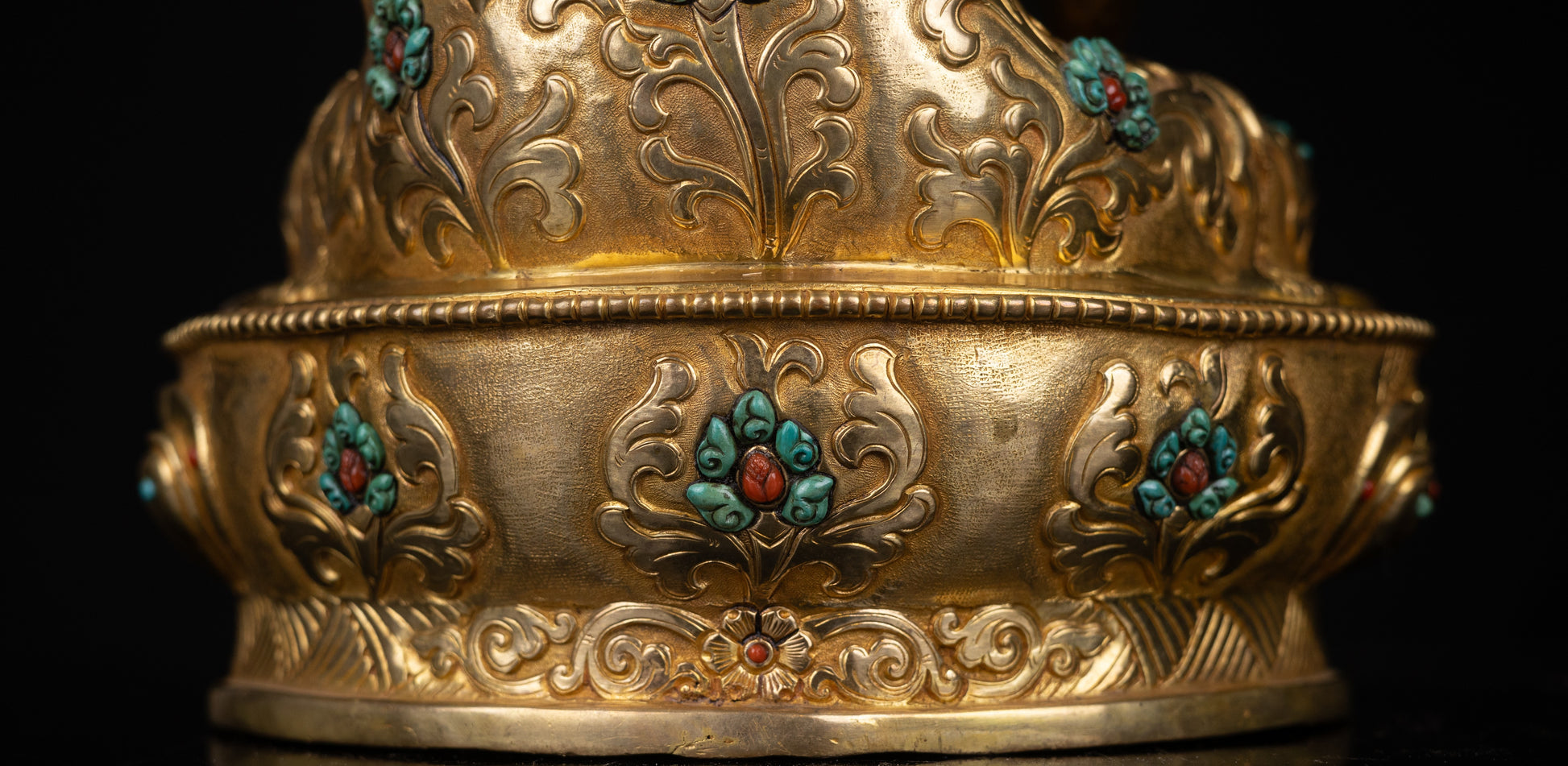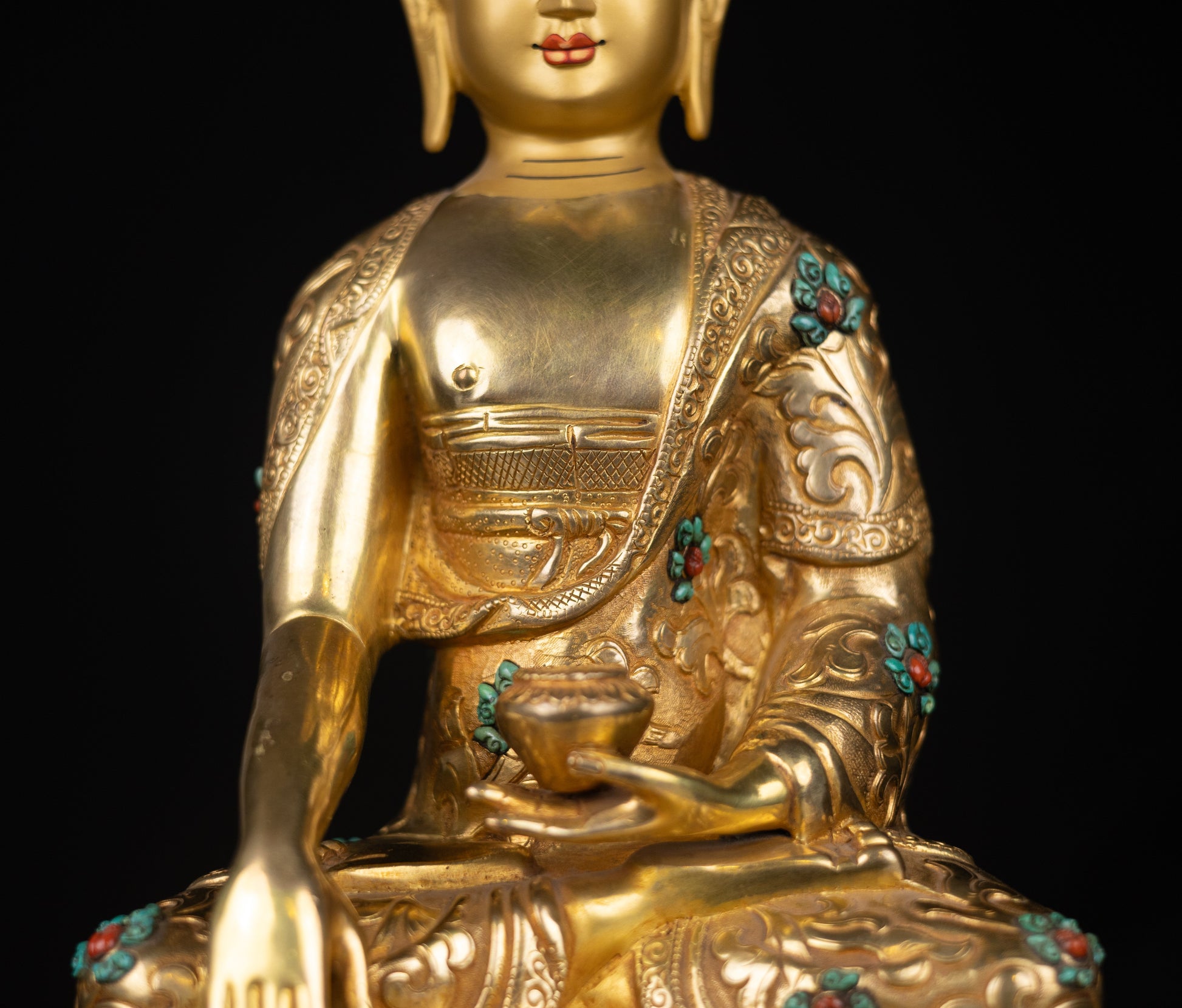 Tibetan Buddhism Gold Face Lord Shakyamuni Buddha Shakya Thubp Hand Craved Gold-Plated Coral Turquoise Stone Copper Statue Sculpture Figure