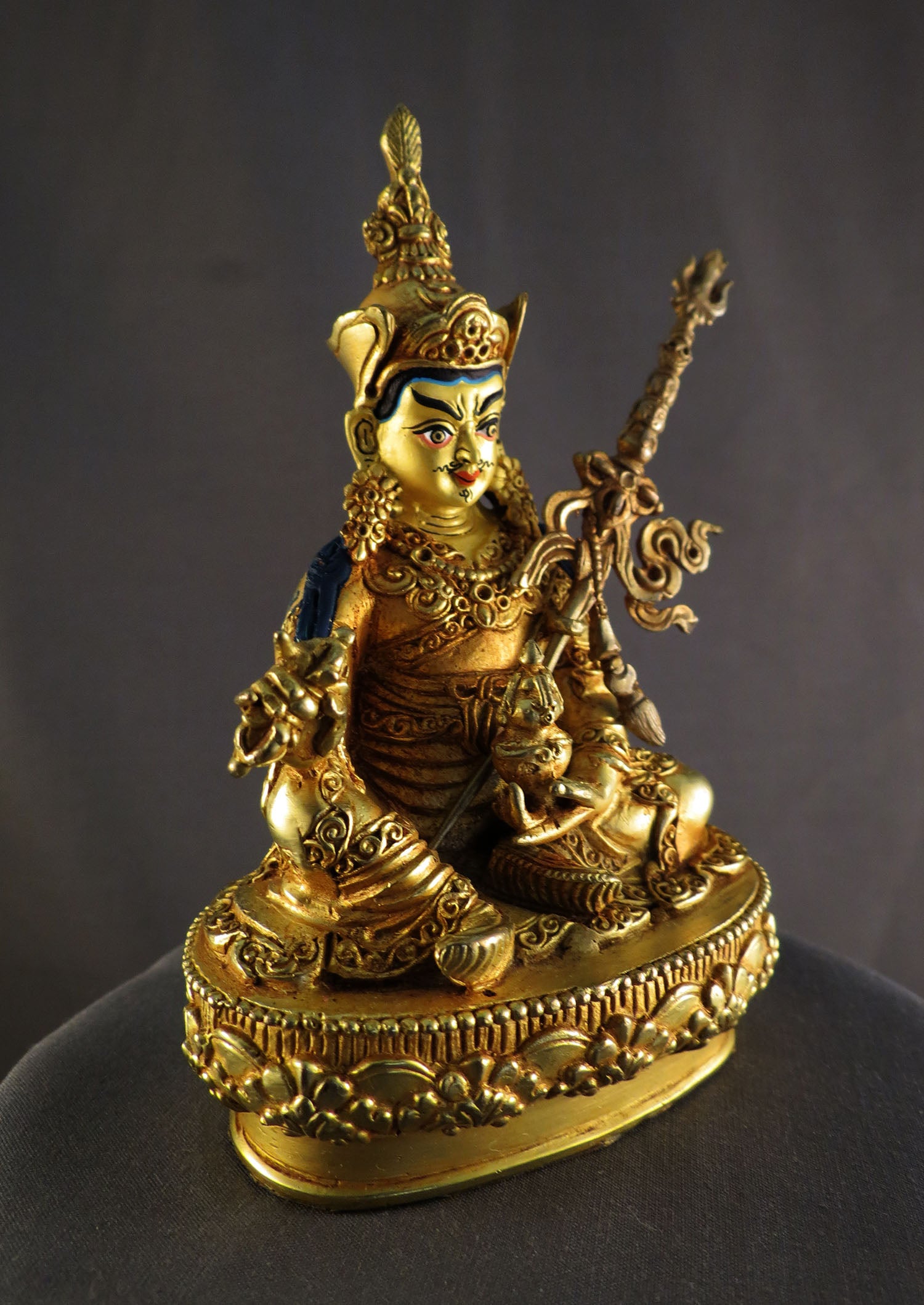 Guru Rinpoche, regarded as an emanation of Buddha Amitabha, was born miraculously from a lotus blossom in the land of Oddiyana located in present-day Pakistan. He was known far and wide for his miracle powers, including his ability to subdue spirits. At the request of the king, Guru Rinpoche journeyed to Tibet and engaged the local nature spirits in magical combat. Conquering these spirits, he bound them by oath to protect the Dharma for all time. Evidence of his victories in these battles can still be seen throughout the valleys and villages of Tibet, where he is affectionately known as "Guru Rinpoche," meaning "Precious Master."