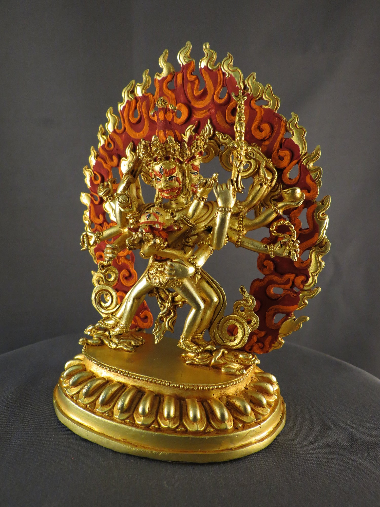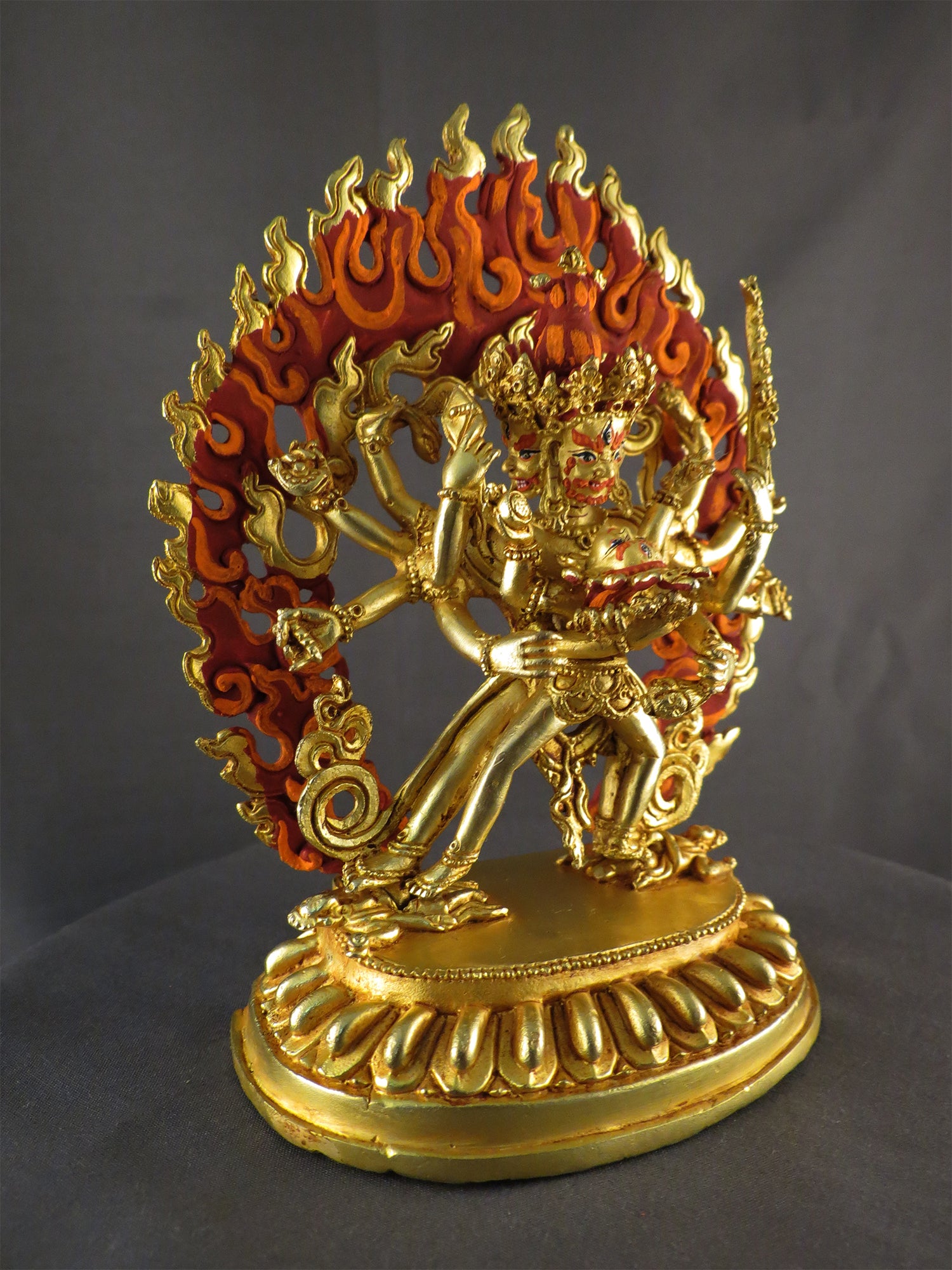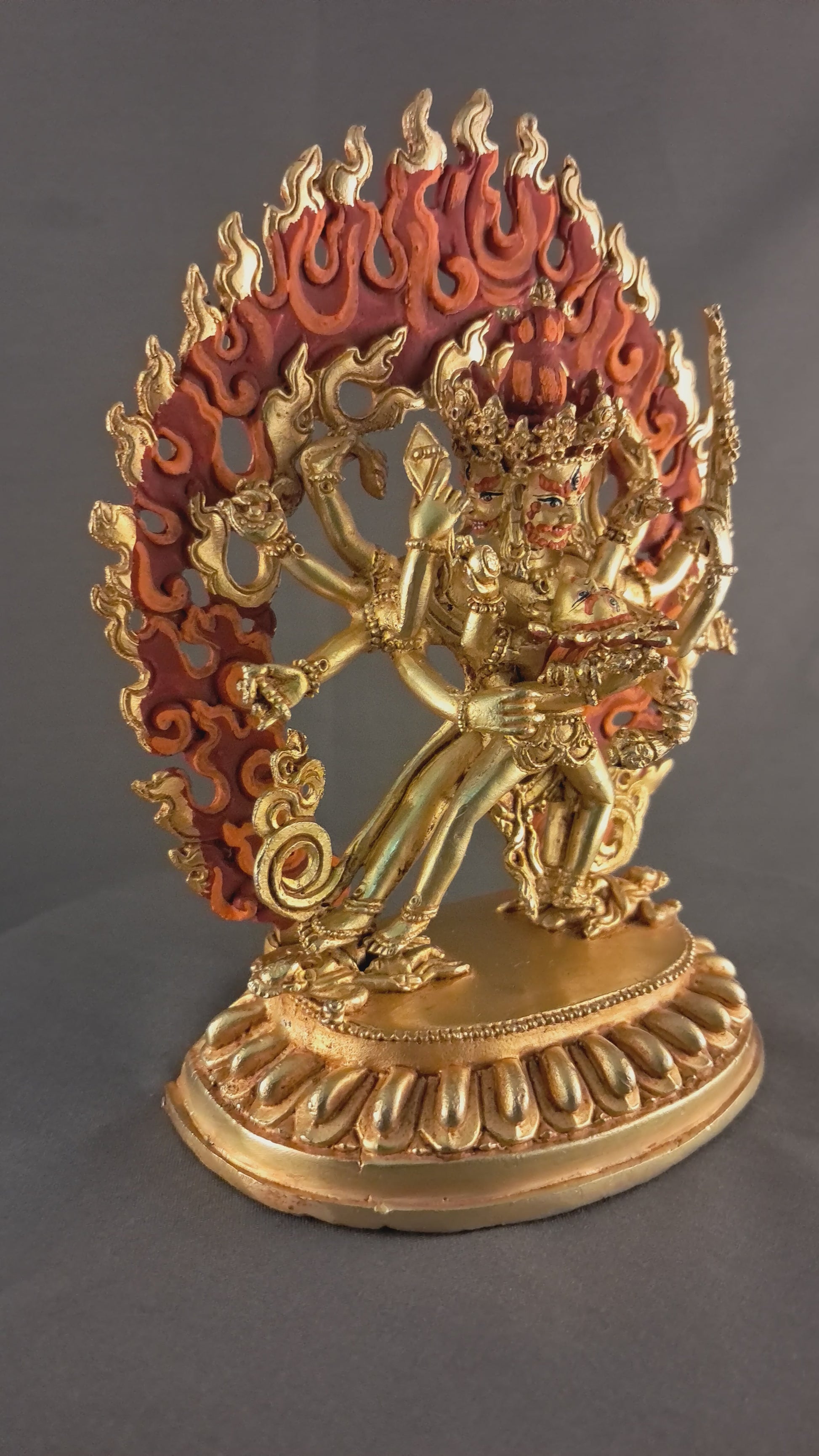 This Beautiful Handmade Hand Craved Hand Painting Gold Face Tibetan Buddhism Lord Cakrasamvara with Consort (Heruka) Copper Full Body Gold Plated Statue made in Nepal.