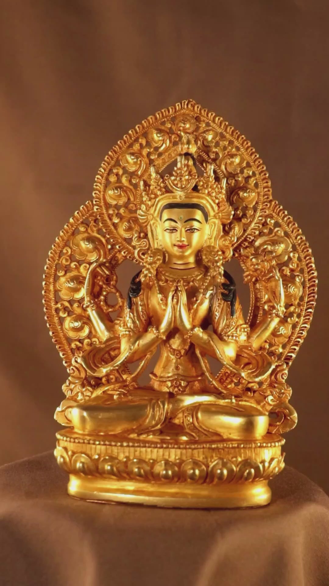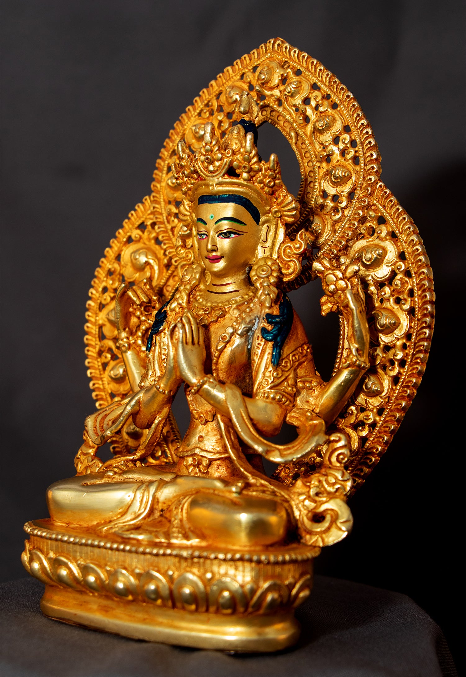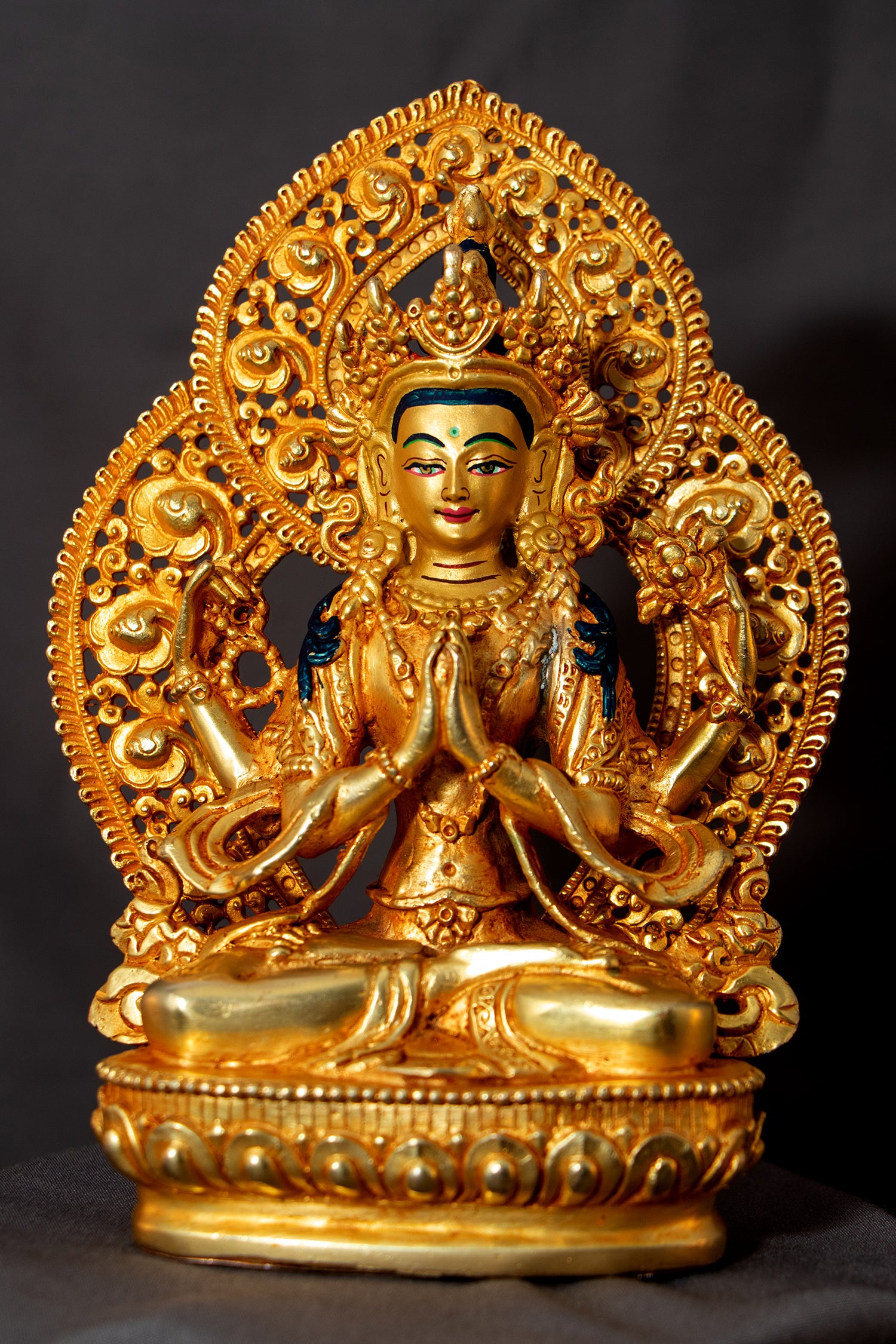 This Beautiful Handmade Hand Craved Gold Face Hand Painting Tibetan Buddhism Lord Chenrezig Gold Plated Copper Statue made by Artists of Nepal.