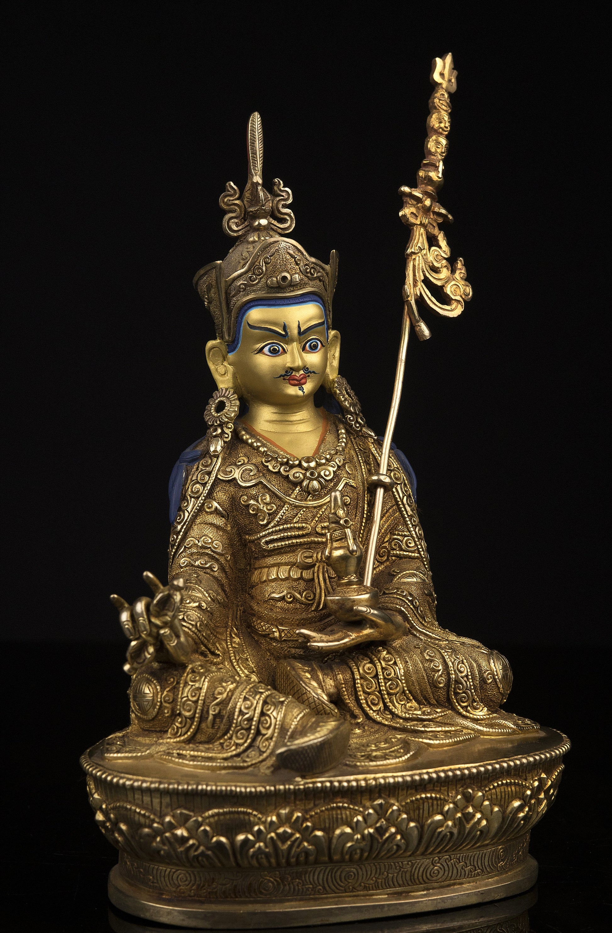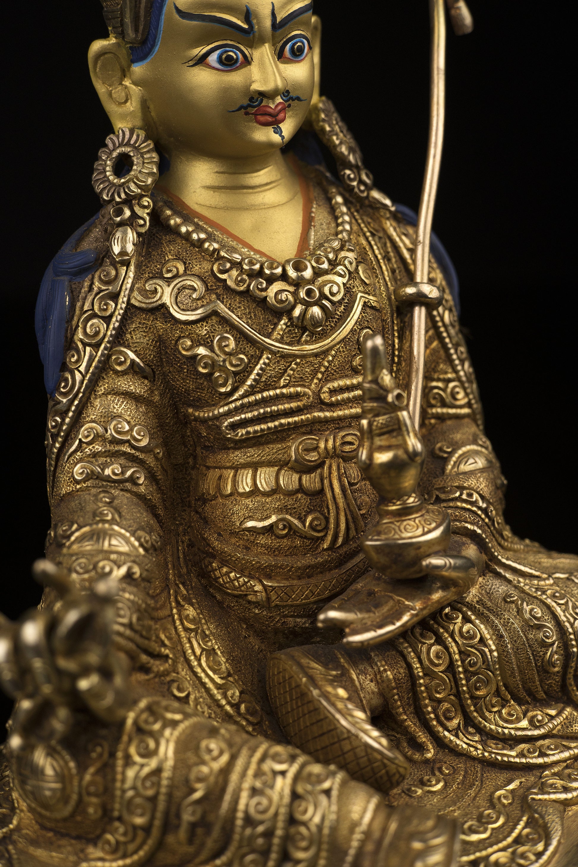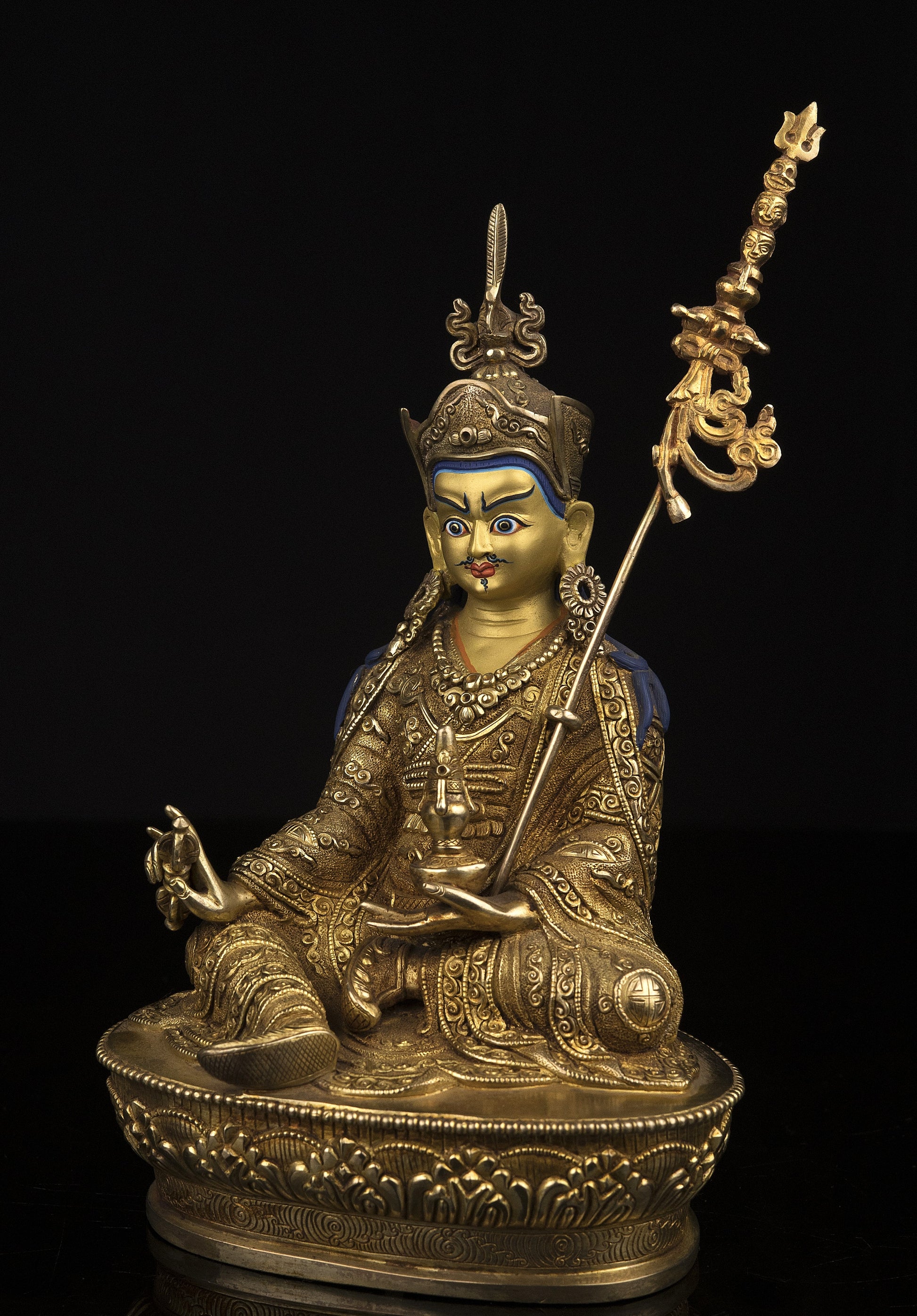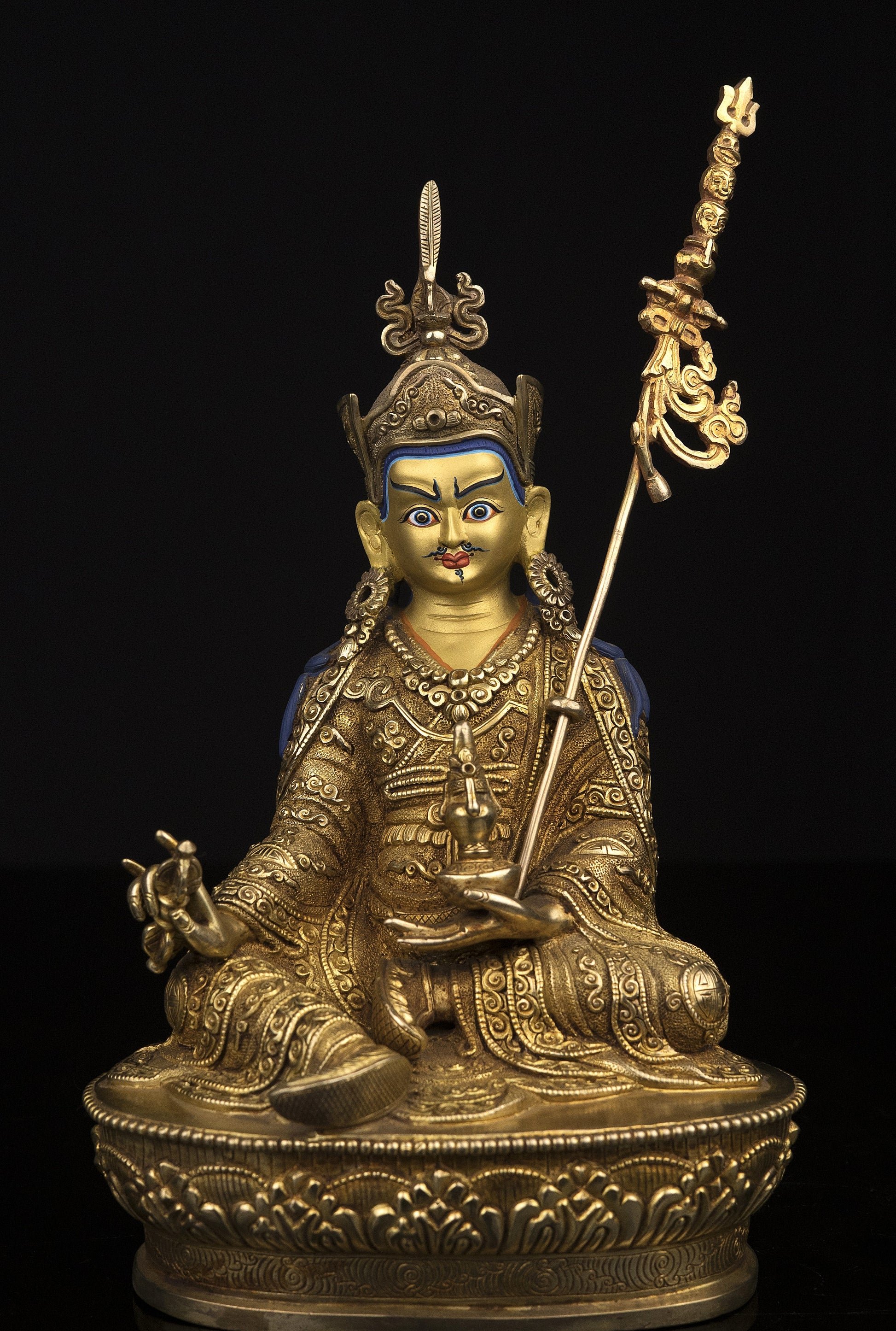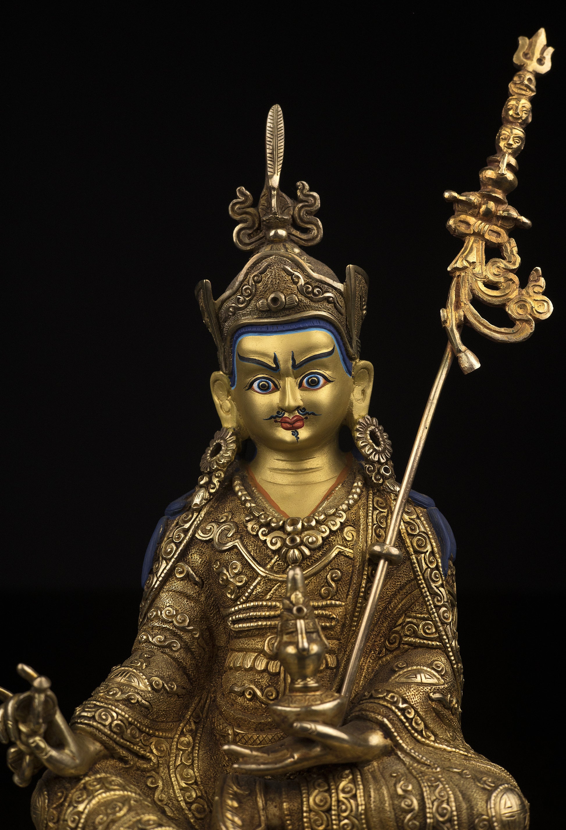 Guru Rinpoche, regarded as an emanation of Buddha Amitabha, was born miraculously from a lotus blossom in the land of Oddiyana located in present-day Pakistan. He was known far and wide for his miracle powers, including his ability to subdue spirits. At the request of the king, Guru Rinpoche journeyed to Tibet and engaged the local nature spirits in magical combat. Conquering these spirits, he bound them by oath to protect the Dharma for all time. Evidence of his victories in these battles can still be seen throughout the valleys and villages of Tibet, where he is affectionately known as "Guru Rinpoche," meaning "Precious Master."