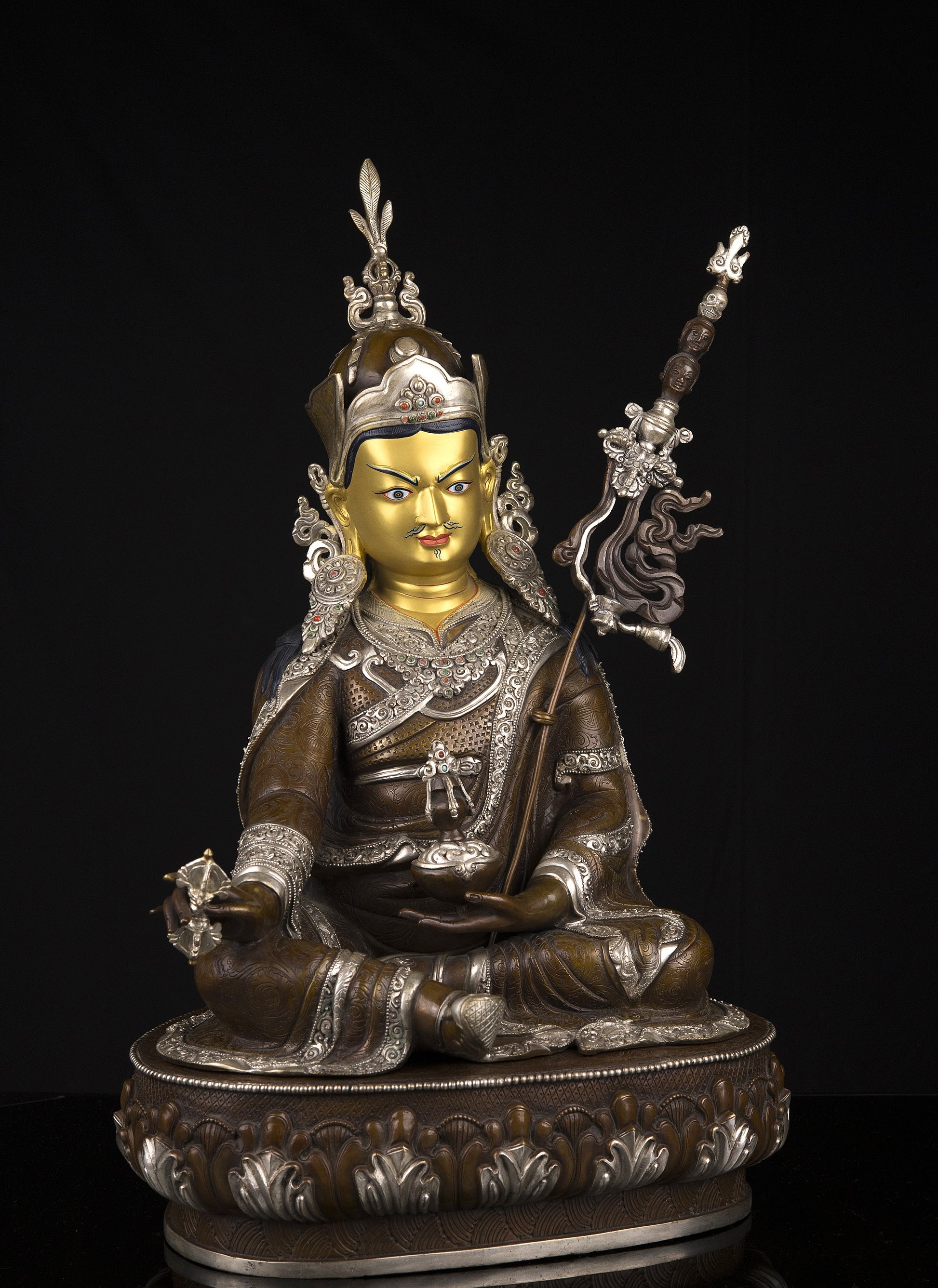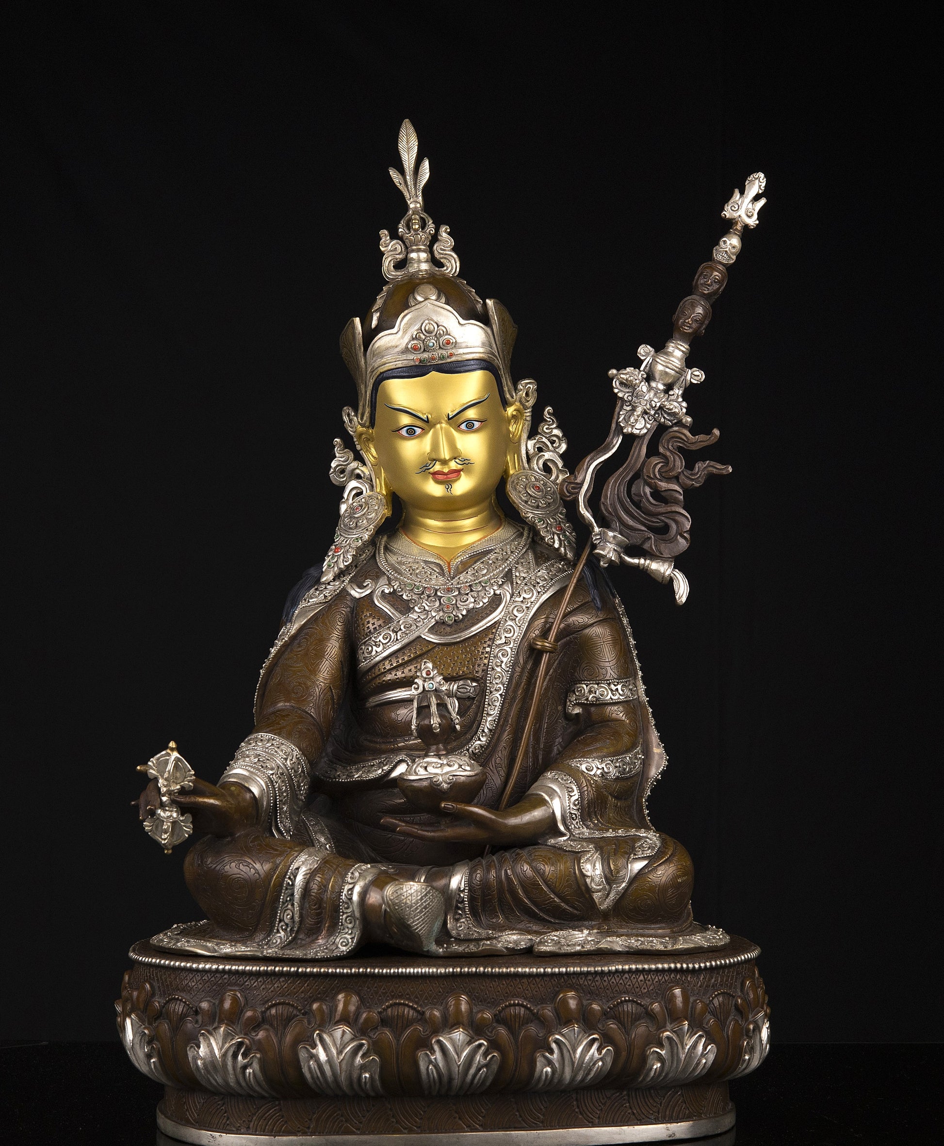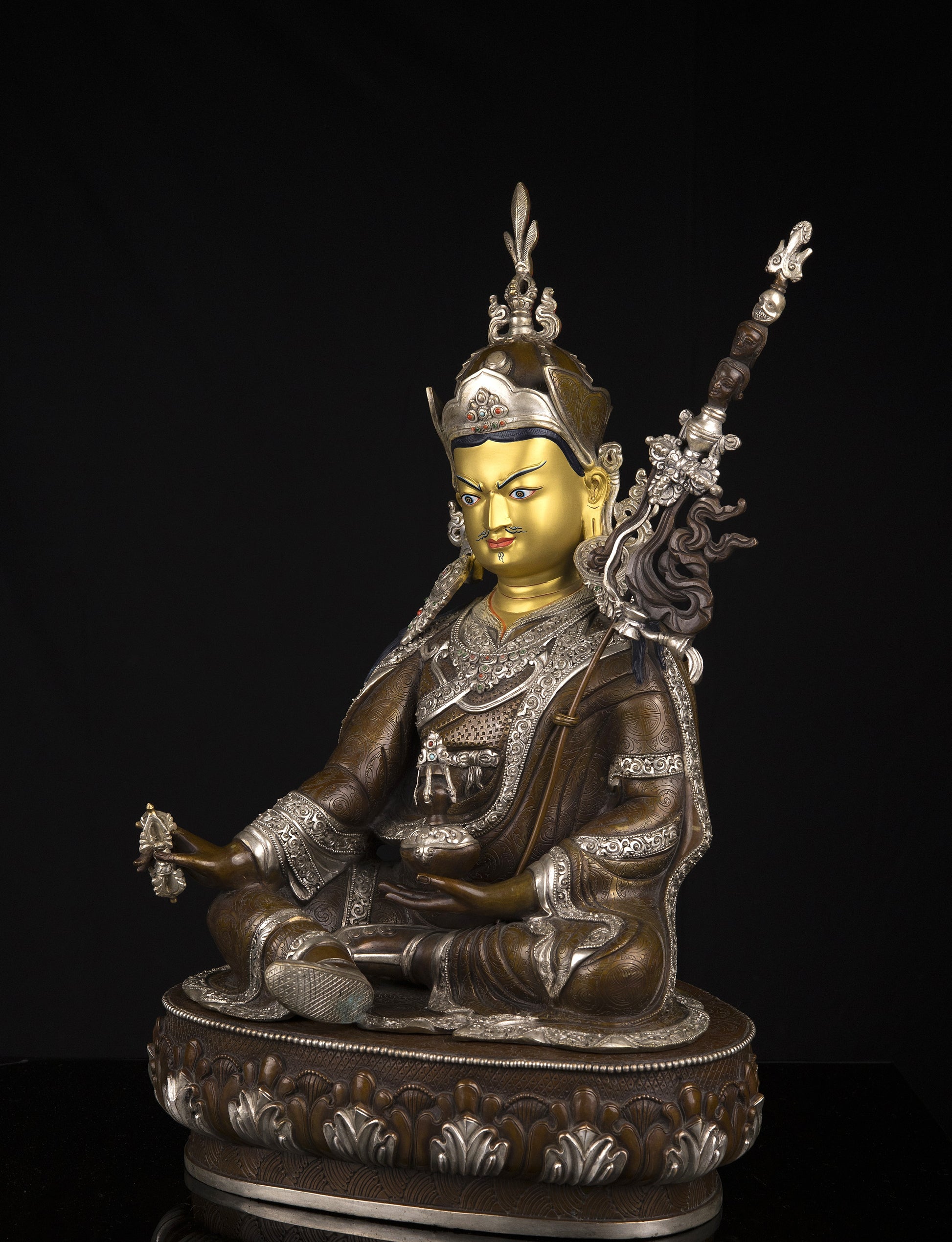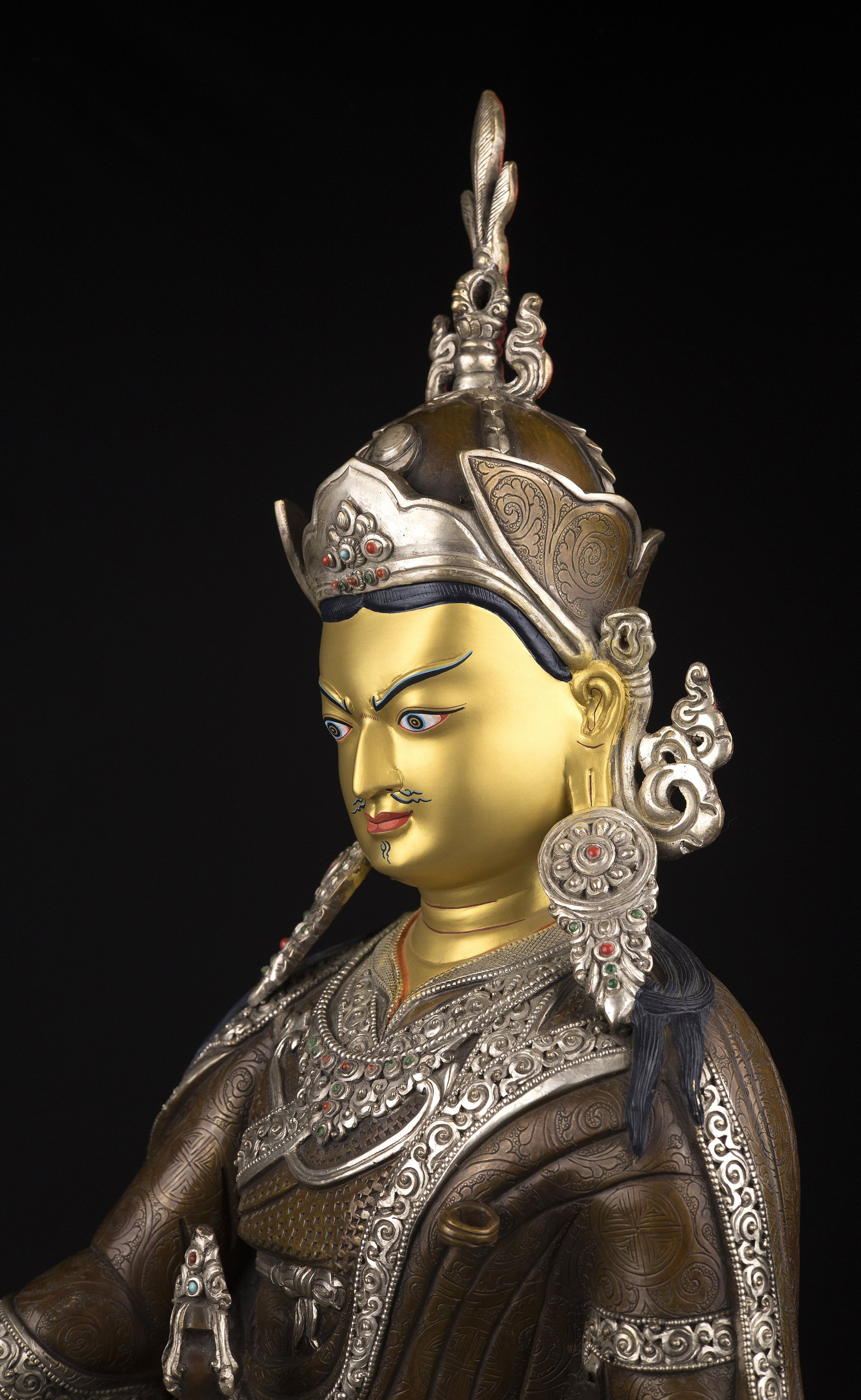 This Beautiful Finest Handmade Tibetan Buddhism Guru Rinpoche Gold Painting Face (Padmasambhava) Copper Silver Oxide Handmade Statue in Nepal.
