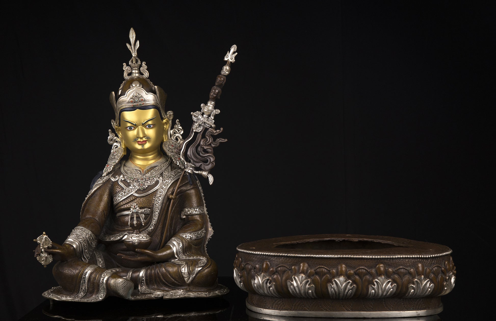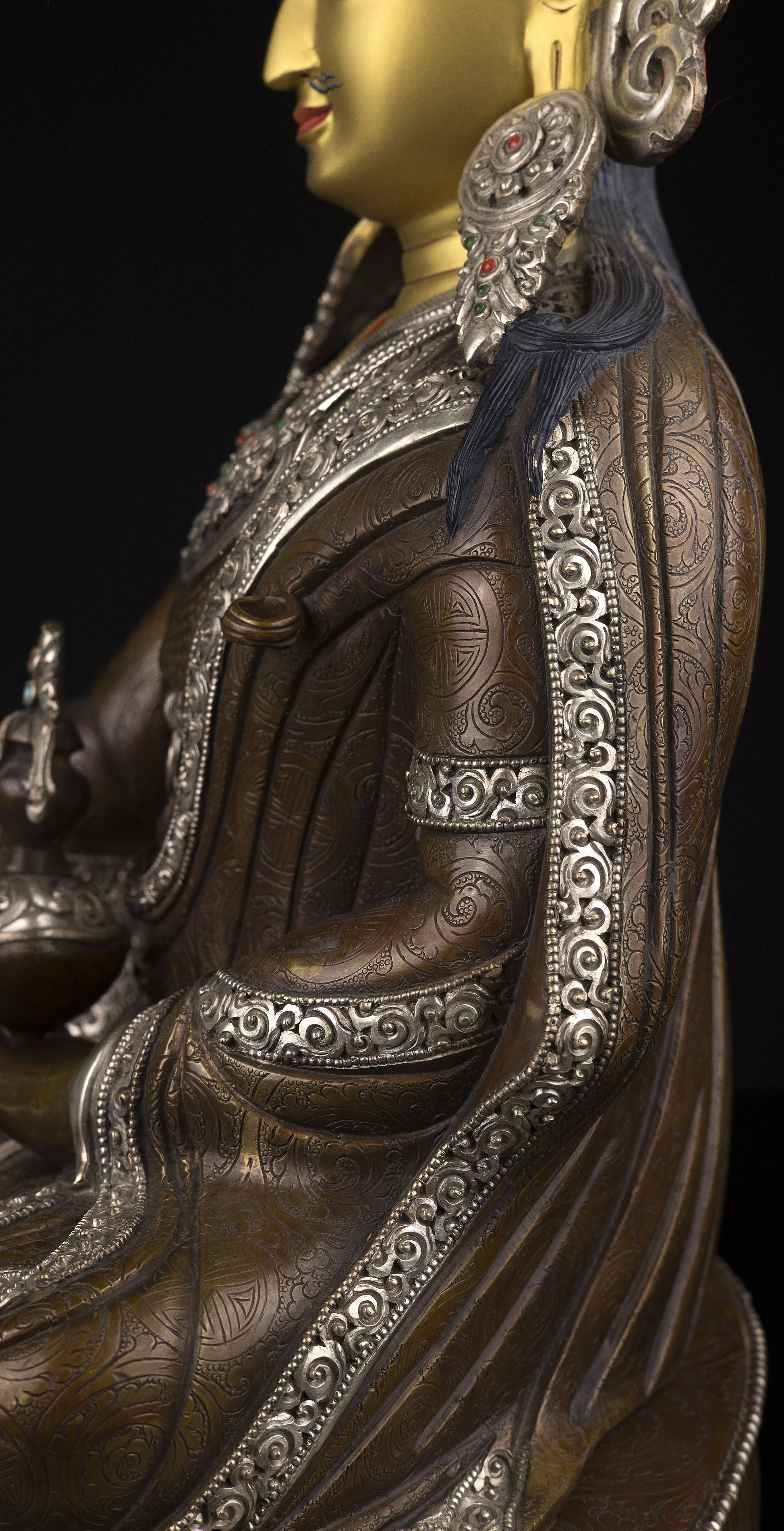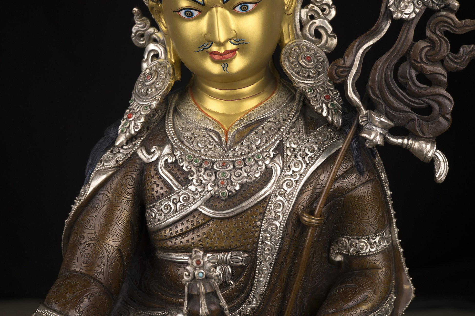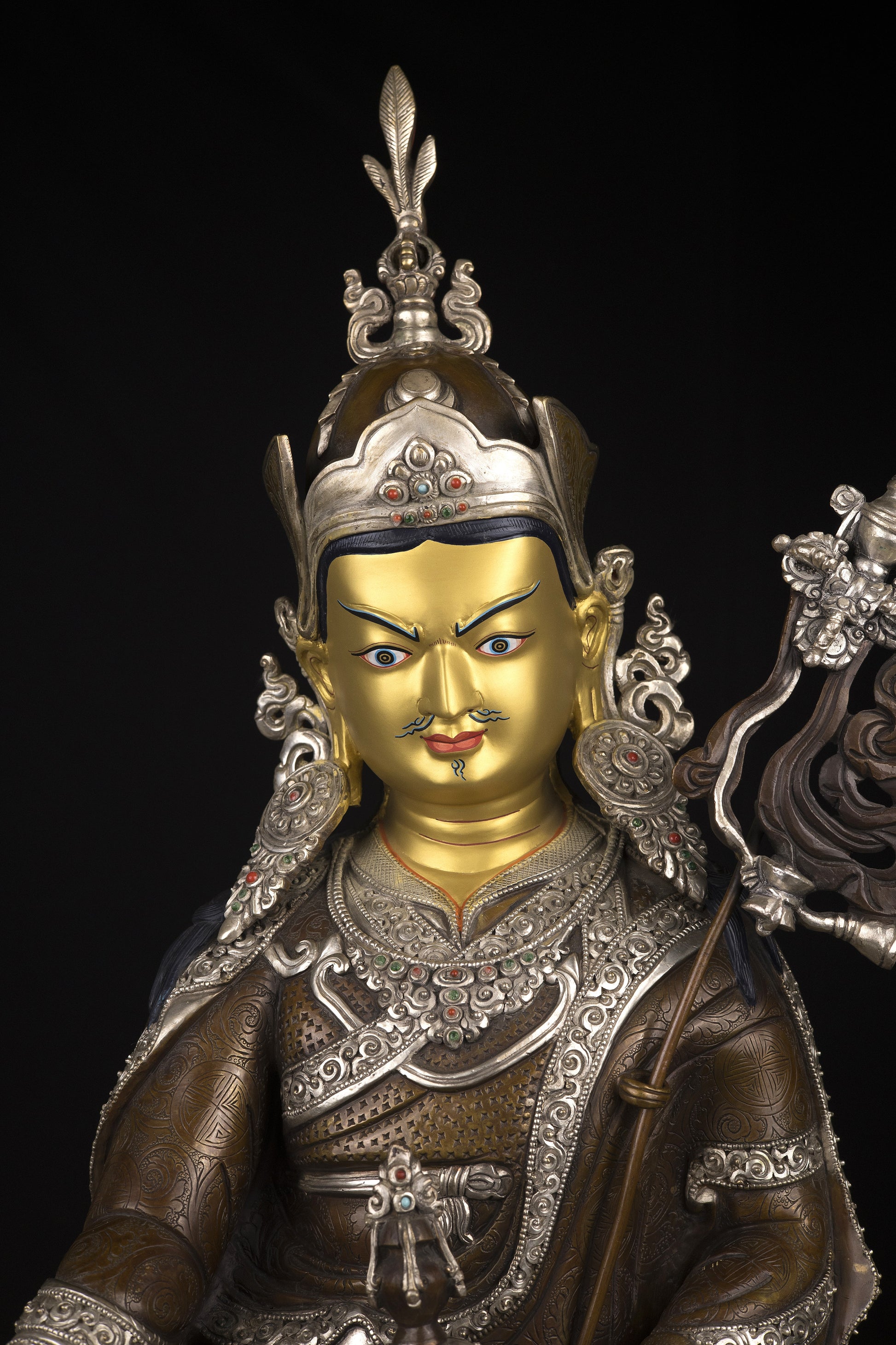 This Beautiful Finest Handmade Tibetan Buddhism Guru Rinpoche Gold Painting Face (Padmasambhava) Copper Silver Oxide Handmade Statue in Nepal.