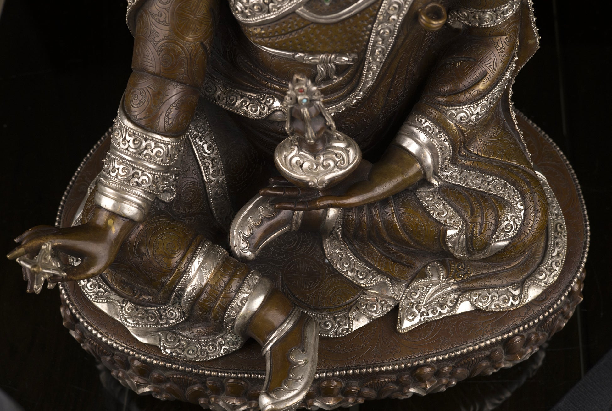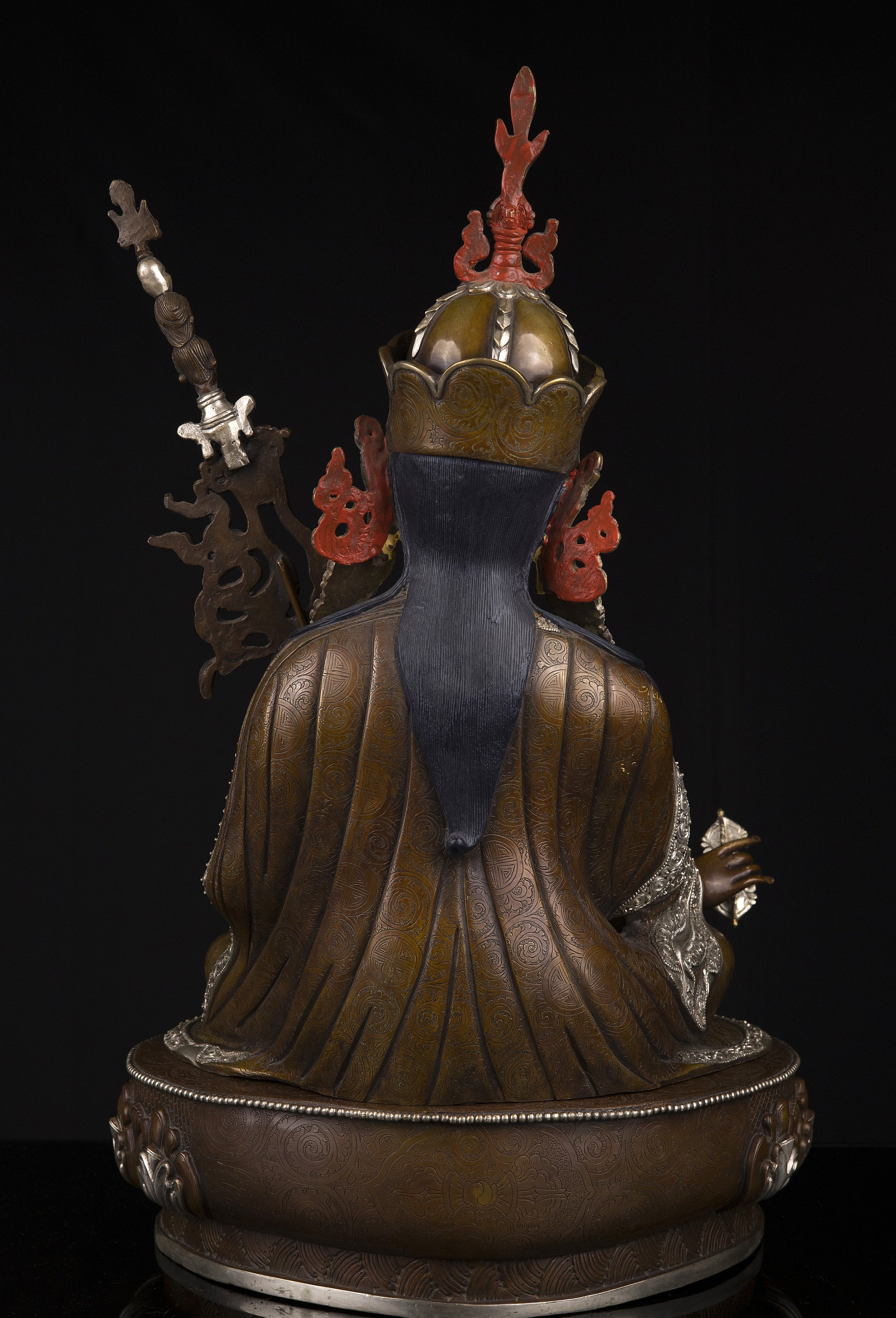 Guru Rinpoche, regarded as an emanation of Buddha Amitabha, was born miraculously from a lotus blossom in the land of Oddiyana located in present-day Pakistan. He was known far and wide for his miracle powers, including his ability to subdue spirits. At the request of the king, Guru Rinpoche journeyed to Tibet and engaged the local nature spirits in magical combat. Conquering these spirits, he bound them by oath to protect the Dharma for all time. Evidence of his victories in these battles can still be seen throughout the valleys and villages of Tibet, where he is affectionately known as "Guru Rinpoche," meaning "Precious Master."