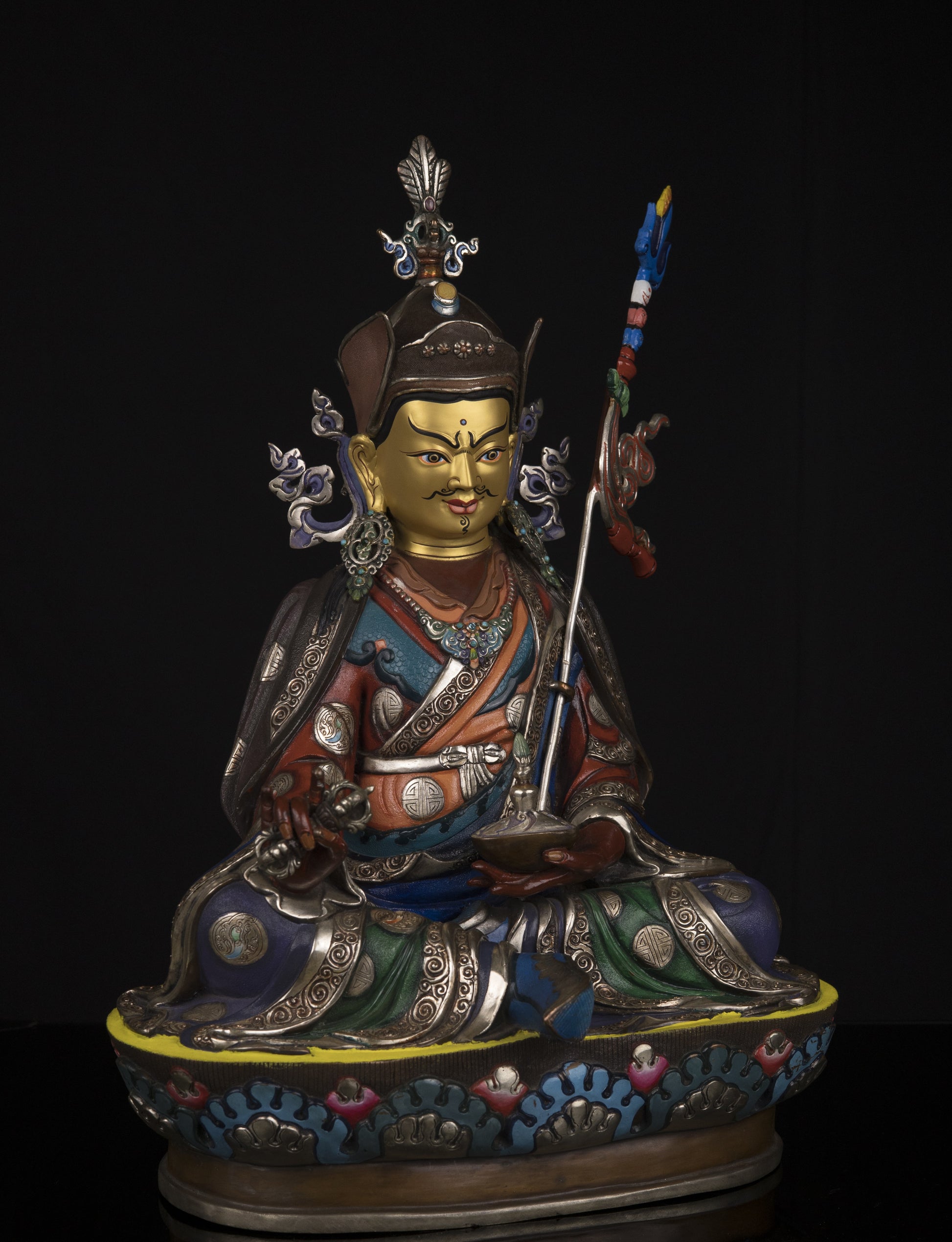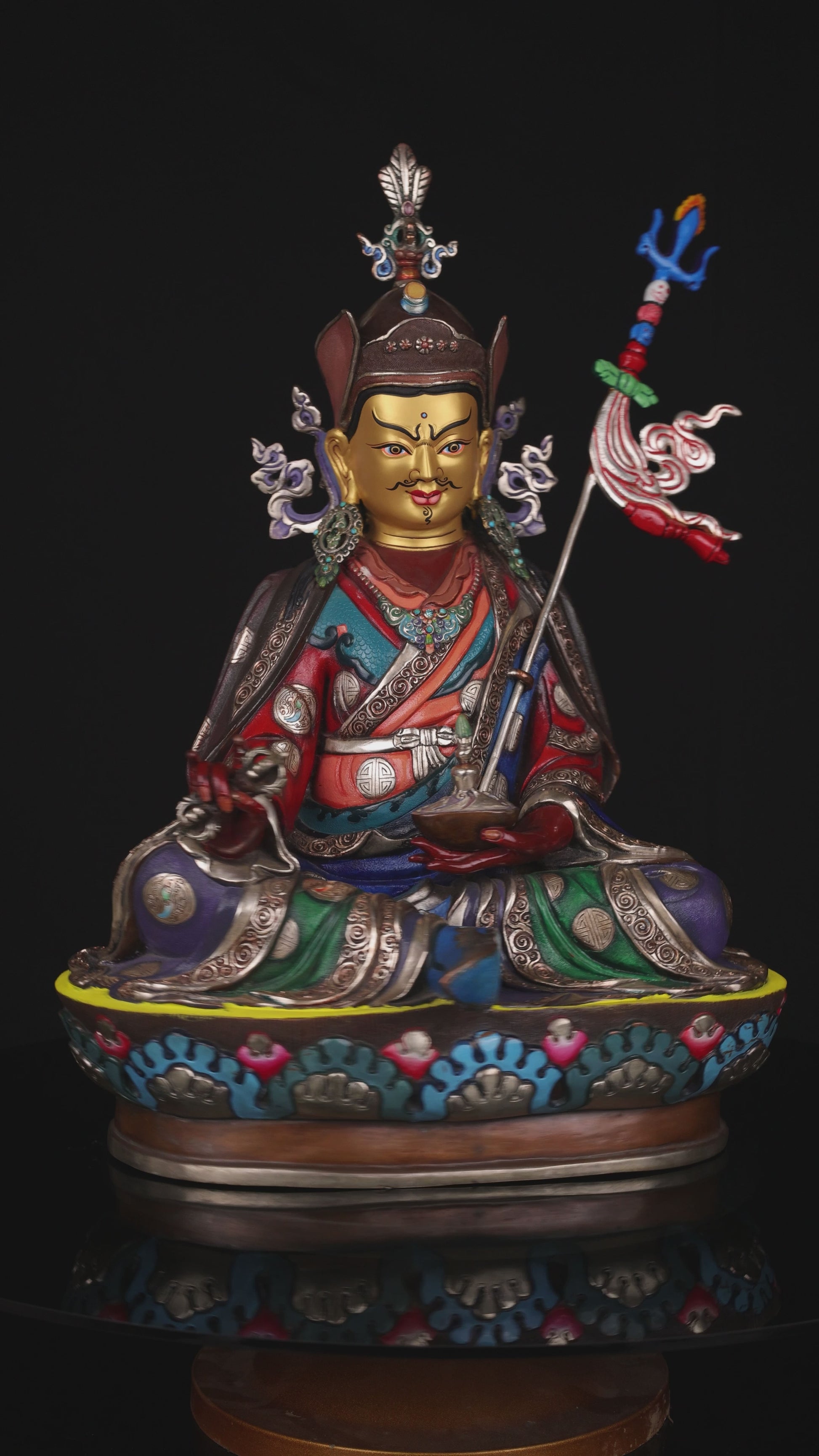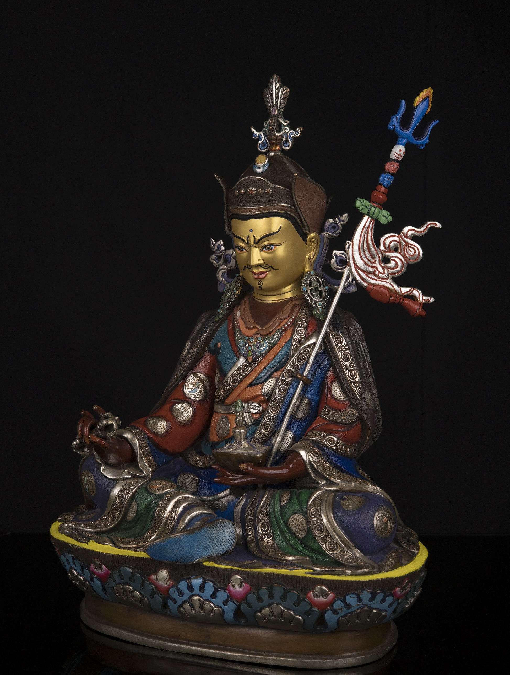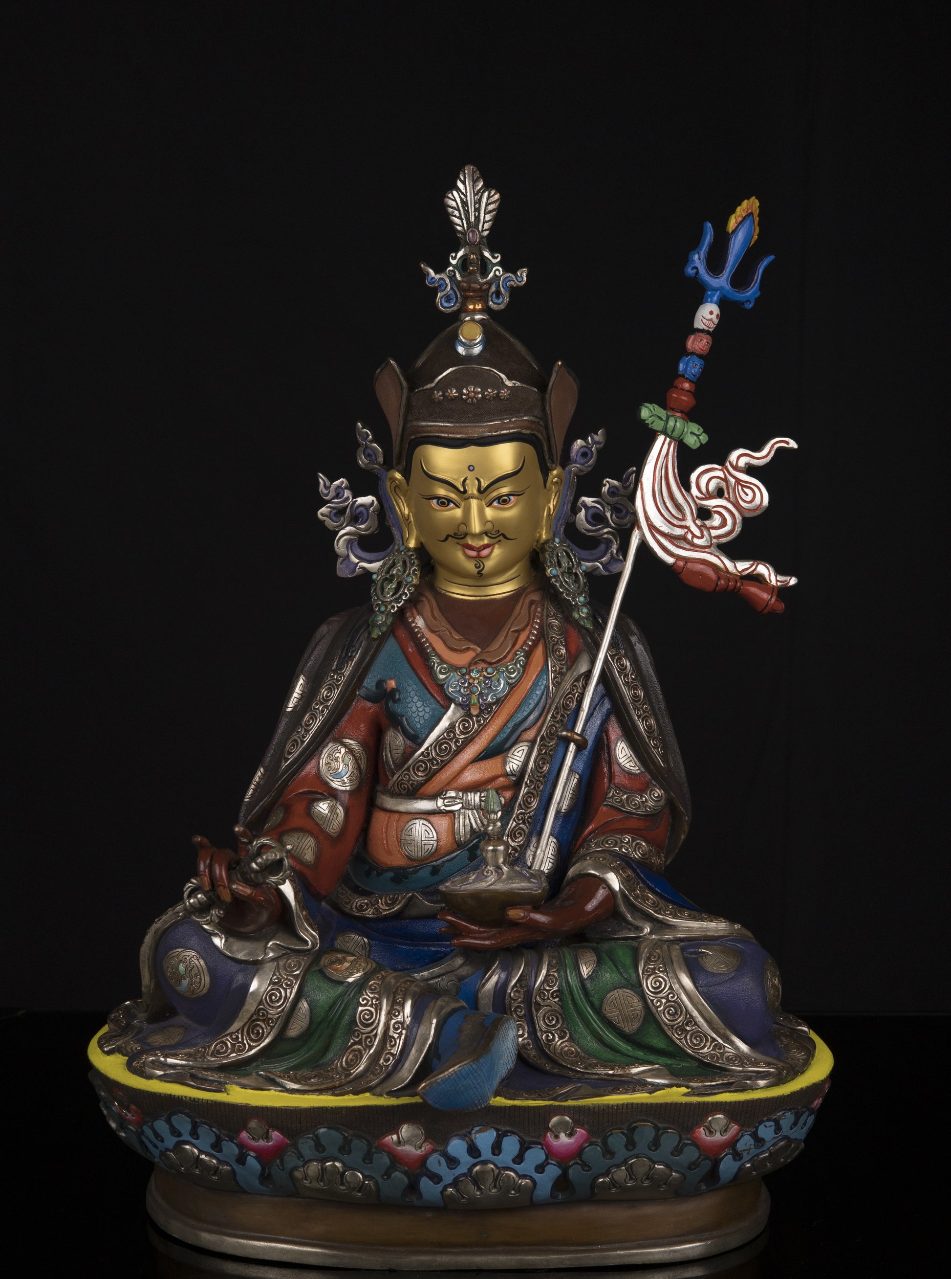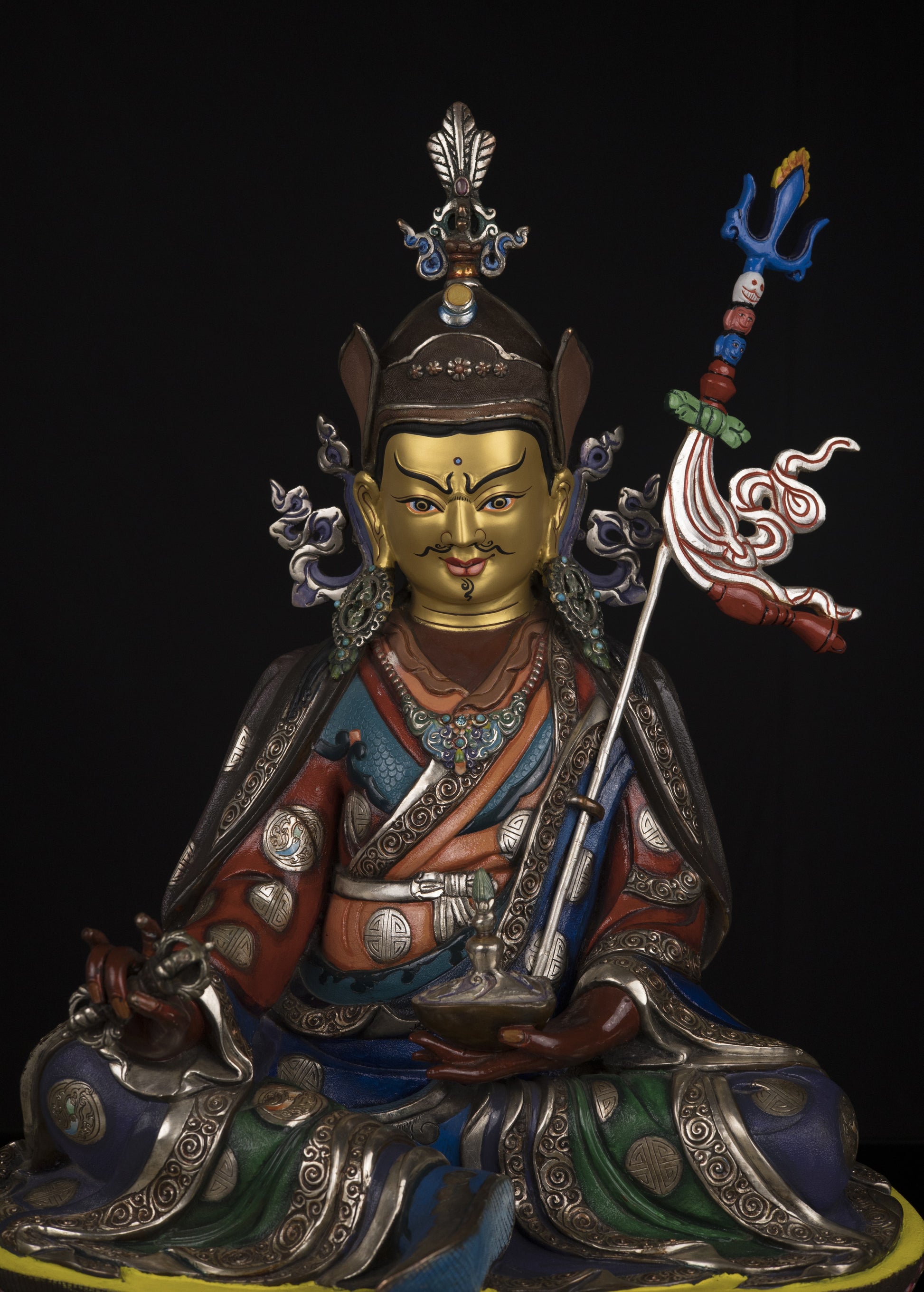 Guru Rinpoche, regarded as an emanation of Buddha Amitabha, was born miraculously from a lotus blossom in the land of Oddiyana located in present-day Pakistan. He was known far and wide for his miracle powers, including his ability to subdue spirits. At the request of the king, Guru Rinpoche journeyed to Tibet and engaged the local nature spirits in magical combat. Conquering these spirits, he bound them by oath to protect the Dharma for all time. Evidence of his victories in these battles can still be seen throughout the valleys and villages of Tibet, where he is affectionately known as "Guru Rinpoche," meaning "Precious Master."
