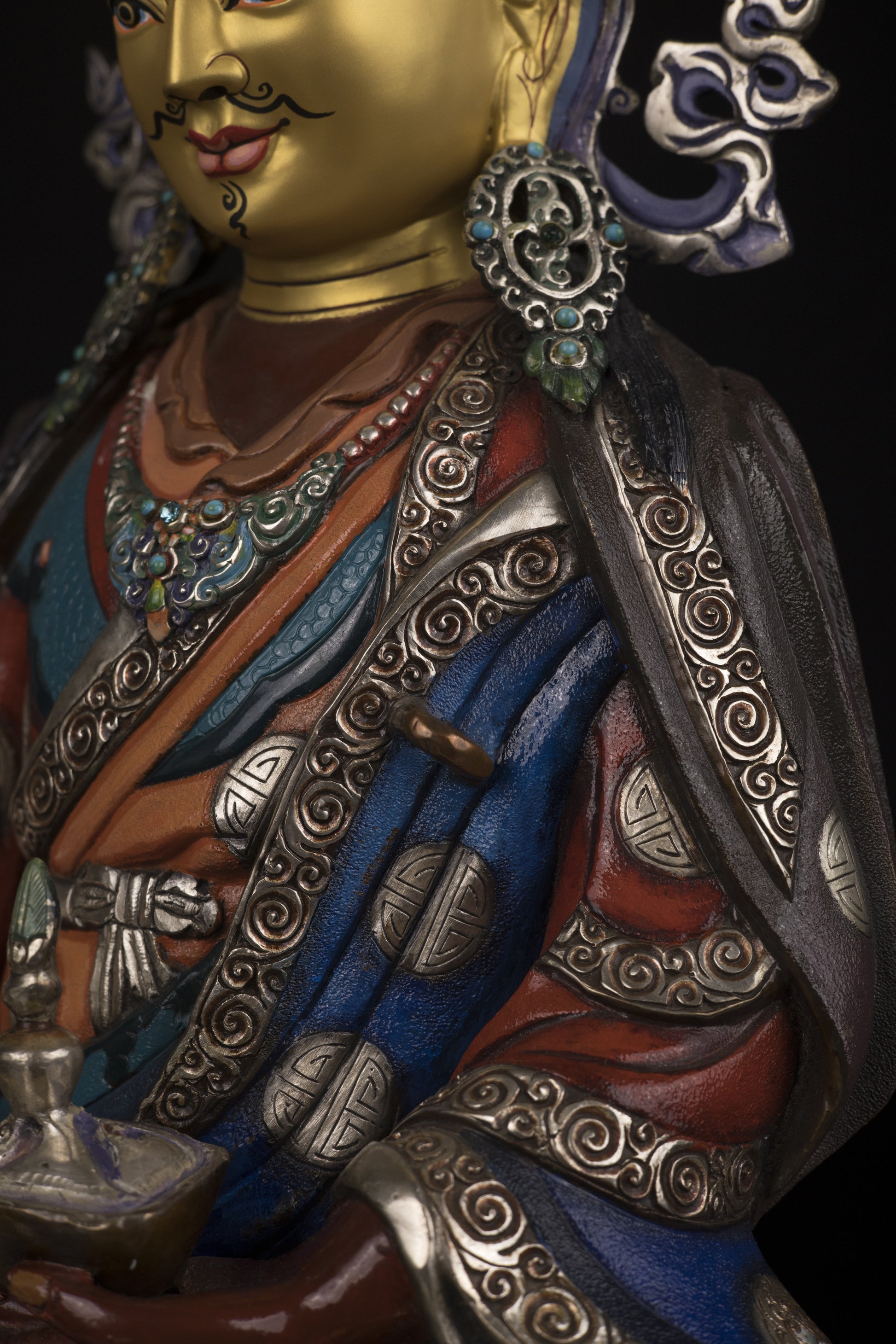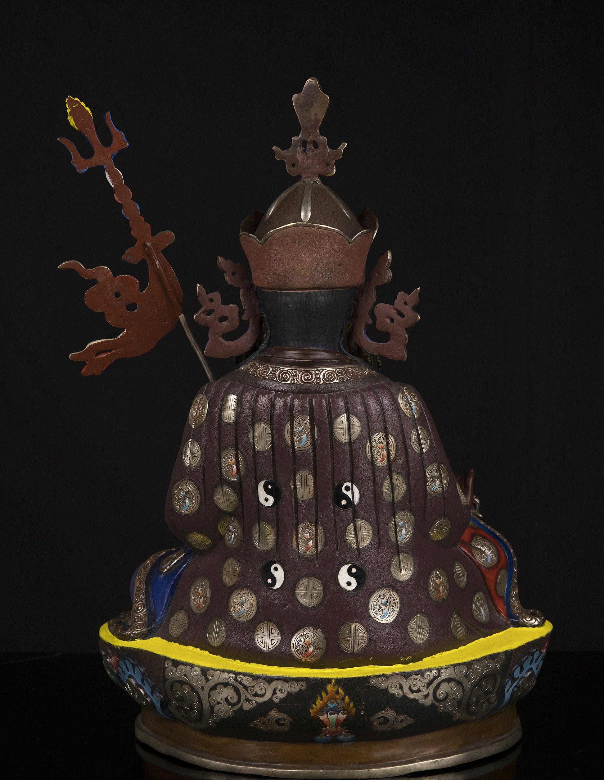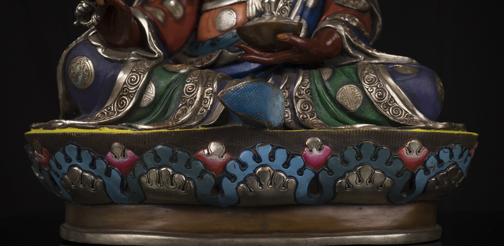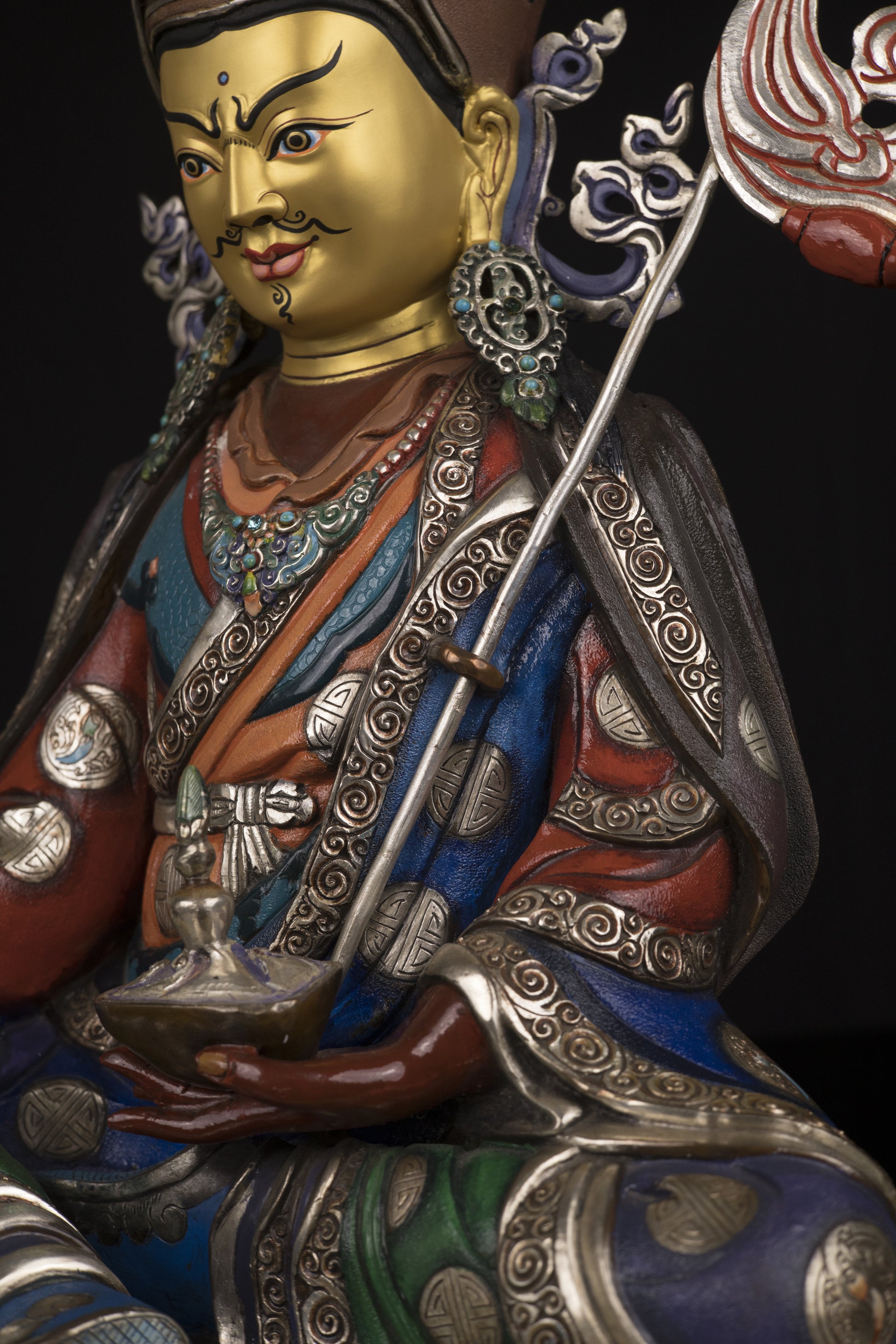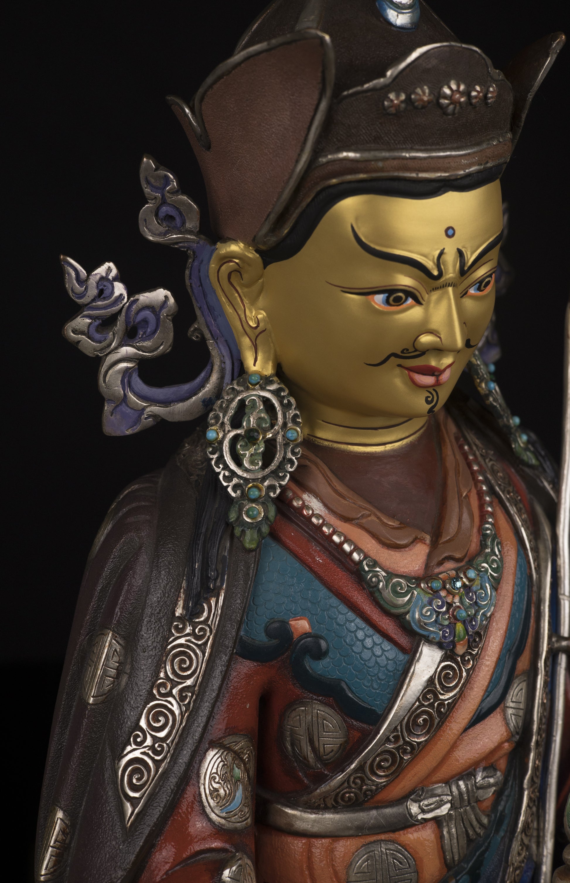 Guru Rinpoche, regarded as an emanation of Buddha Amitabha, was born miraculously from a lotus blossom in the land of Oddiyana located in present-day Pakistan. He was known far and wide for his miracle powers, including his ability to subdue spirits. At the request of the king, Guru Rinpoche journeyed to Tibet and engaged the local nature spirits in magical combat. Conquering these spirits, he bound them by oath to protect the Dharma for all time. Evidence of his victories in these battles can still be seen throughout the valleys and villages of Tibet, where he is affectionately known as "Guru Rinpoche," meaning "Precious Master."