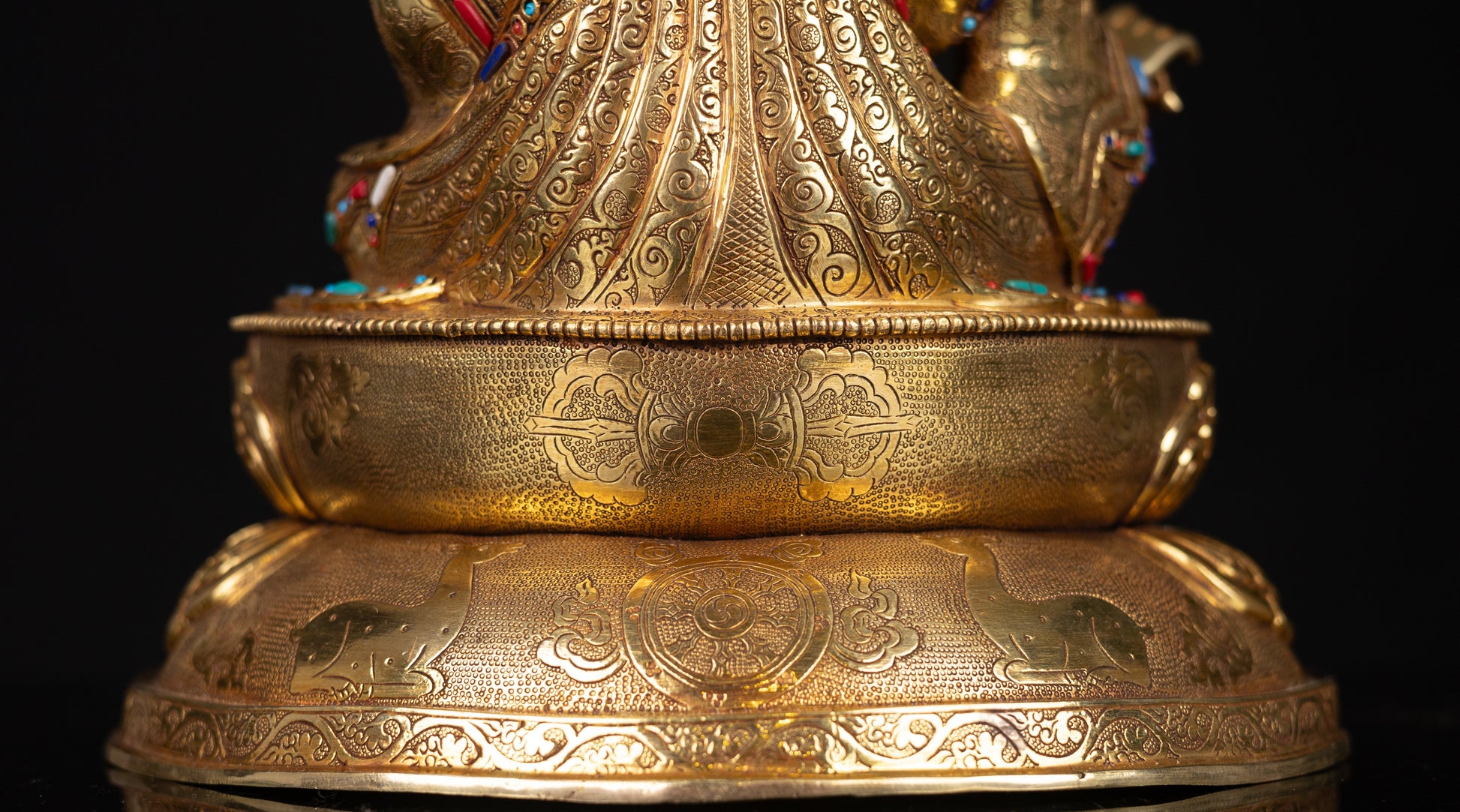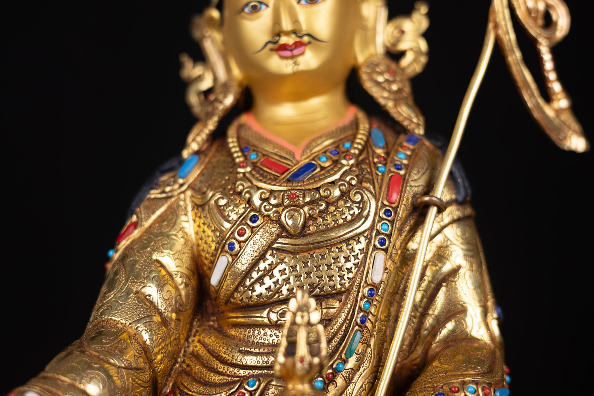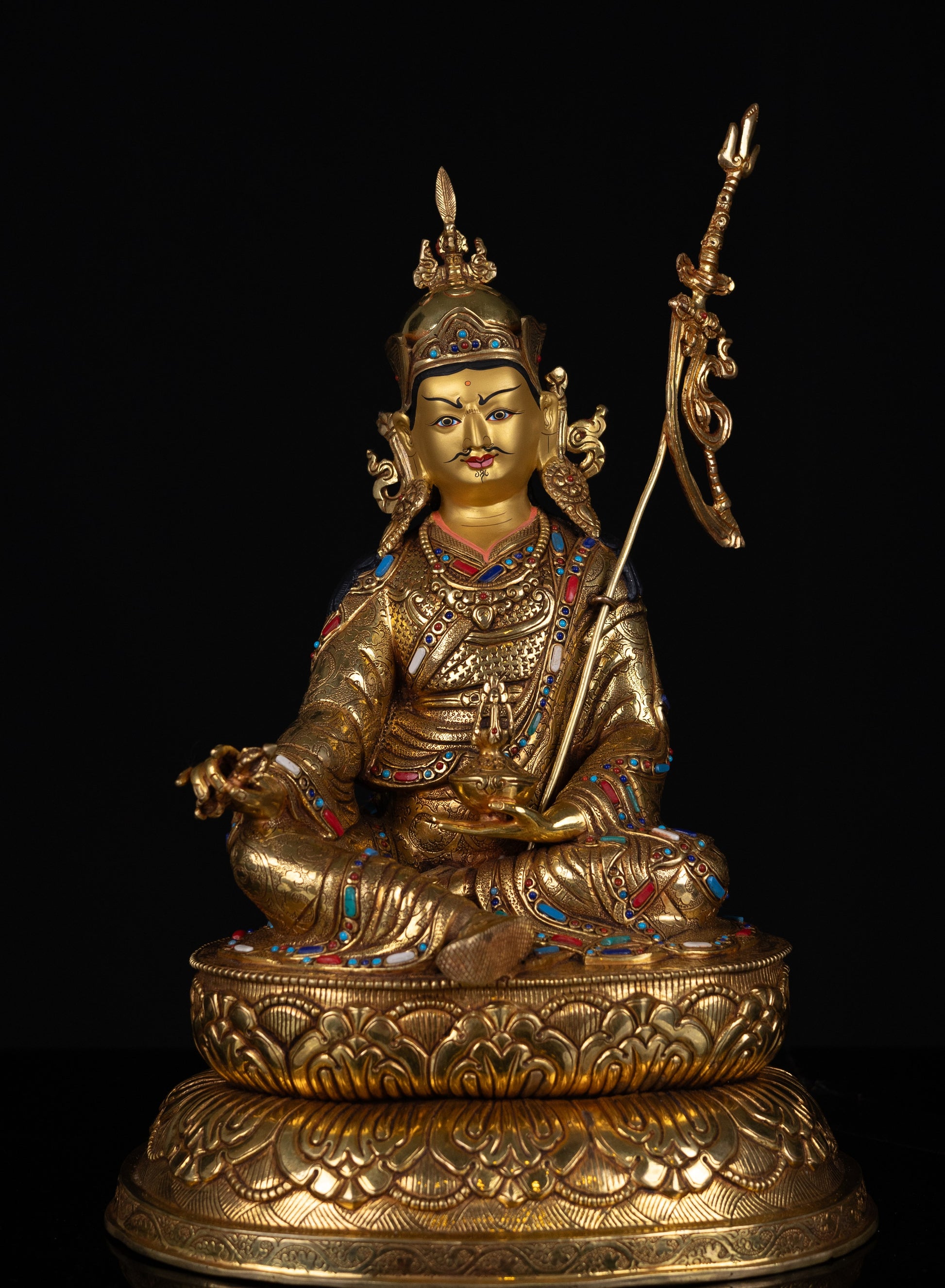 Guru Rinpoche, regarded as an emanation of Buddha Amitabha, was born miraculously from a lotus blossom in the land of Oddiyana located in present-day Pakistan. He was known far and wide for his miracle powers, including his ability to subdue spirits. At the request of the king, Guru Rinpoche journeyed to Tibet and engaged the local nature spirits in magical combat. Conquering these spirits, he bound them by oath to protect the Dharma for all time. Evidence of his victories in these battles can still be seen throughout the valleys and villages of Tibet, where he is affectionately known as "Guru Rinpoche," meaning "Precious Master."