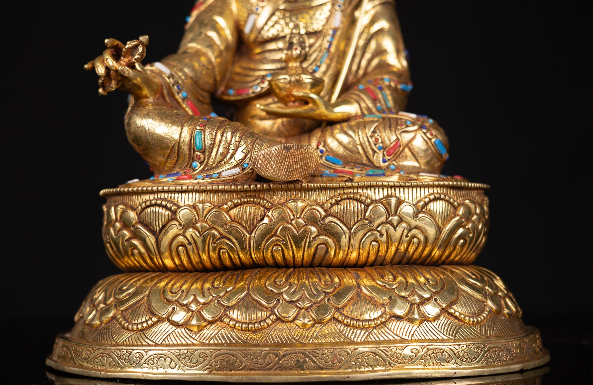 Tibetan Buddhism Gold Face Guru Rinpoche Padmasambhava Turquoise Coral Lapiz Stone Gold Plated Copper Statue Sculpture Figure Nepal free