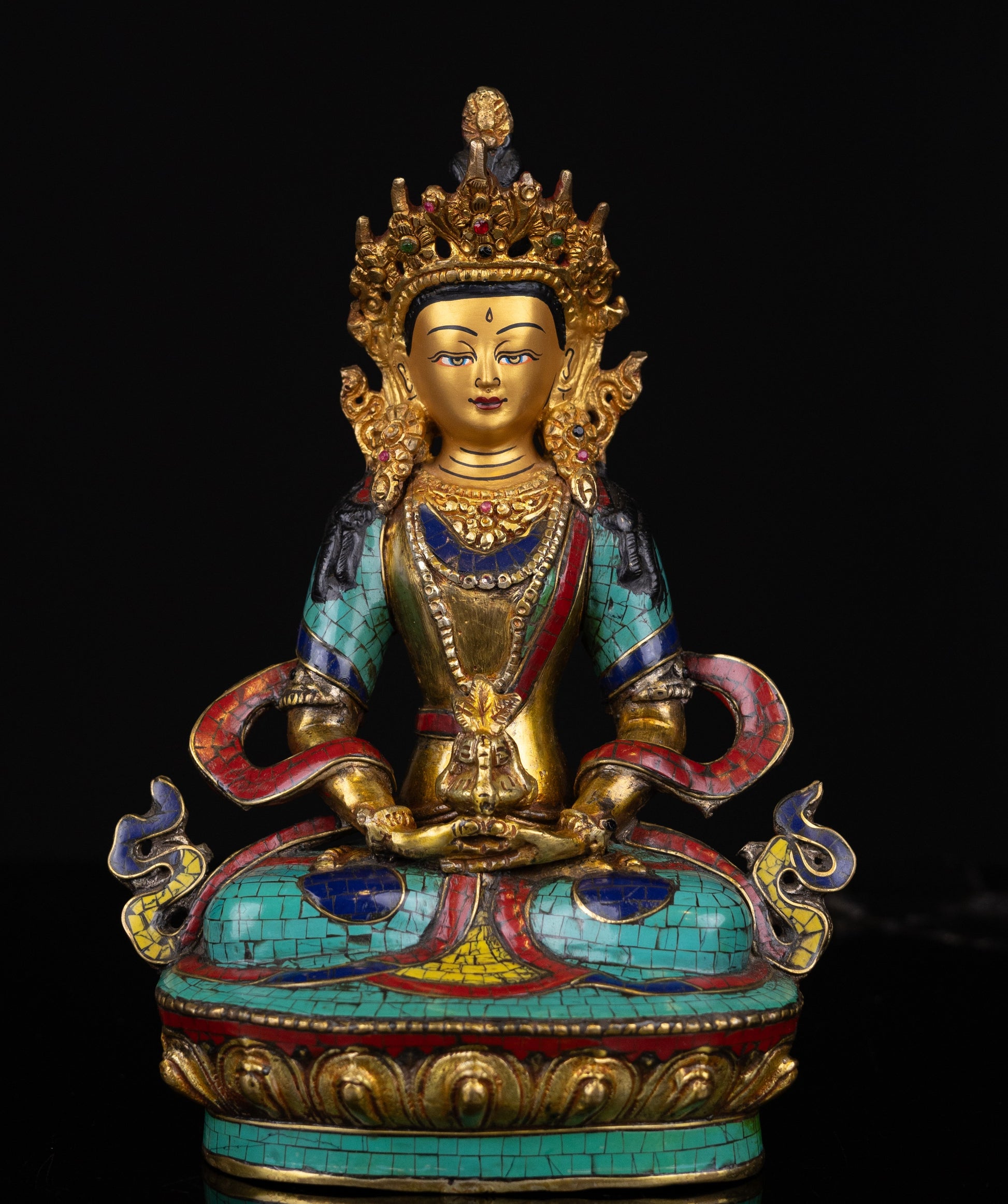 Tibetan Buddhism Hand Painting Lord Aparimita Aparamita Amitayus Buddha Copper Turquoise Coral Stone Statue Sculpture Figure free