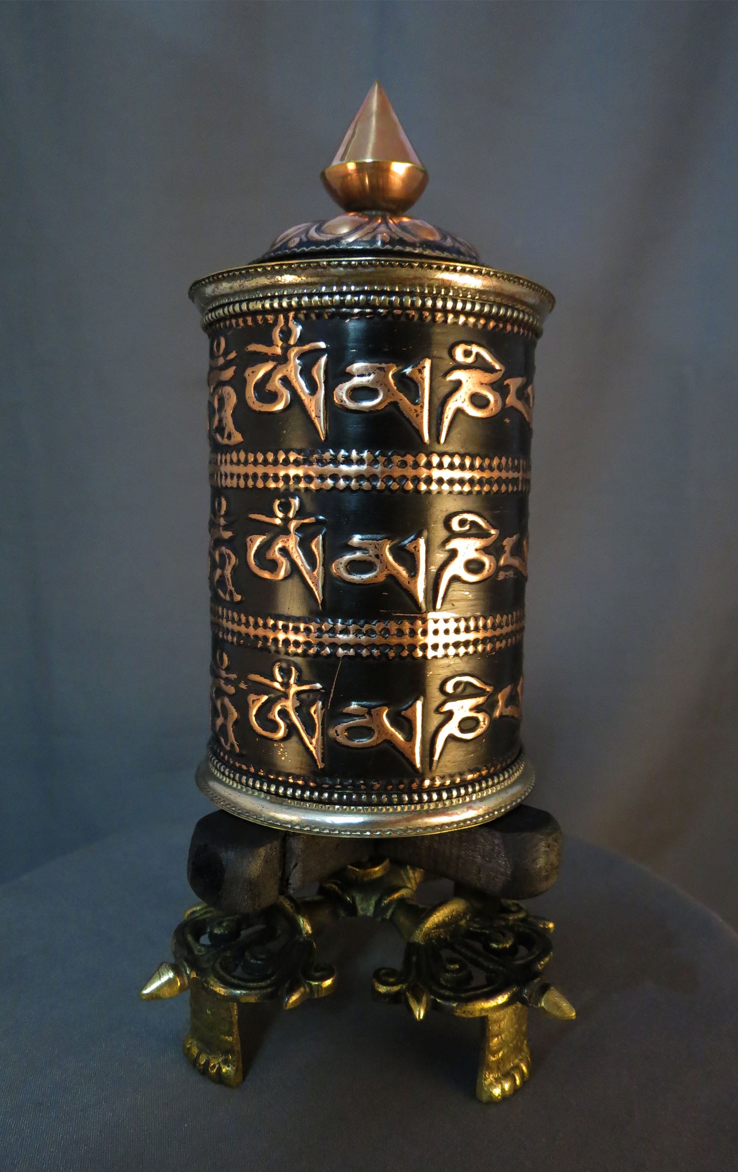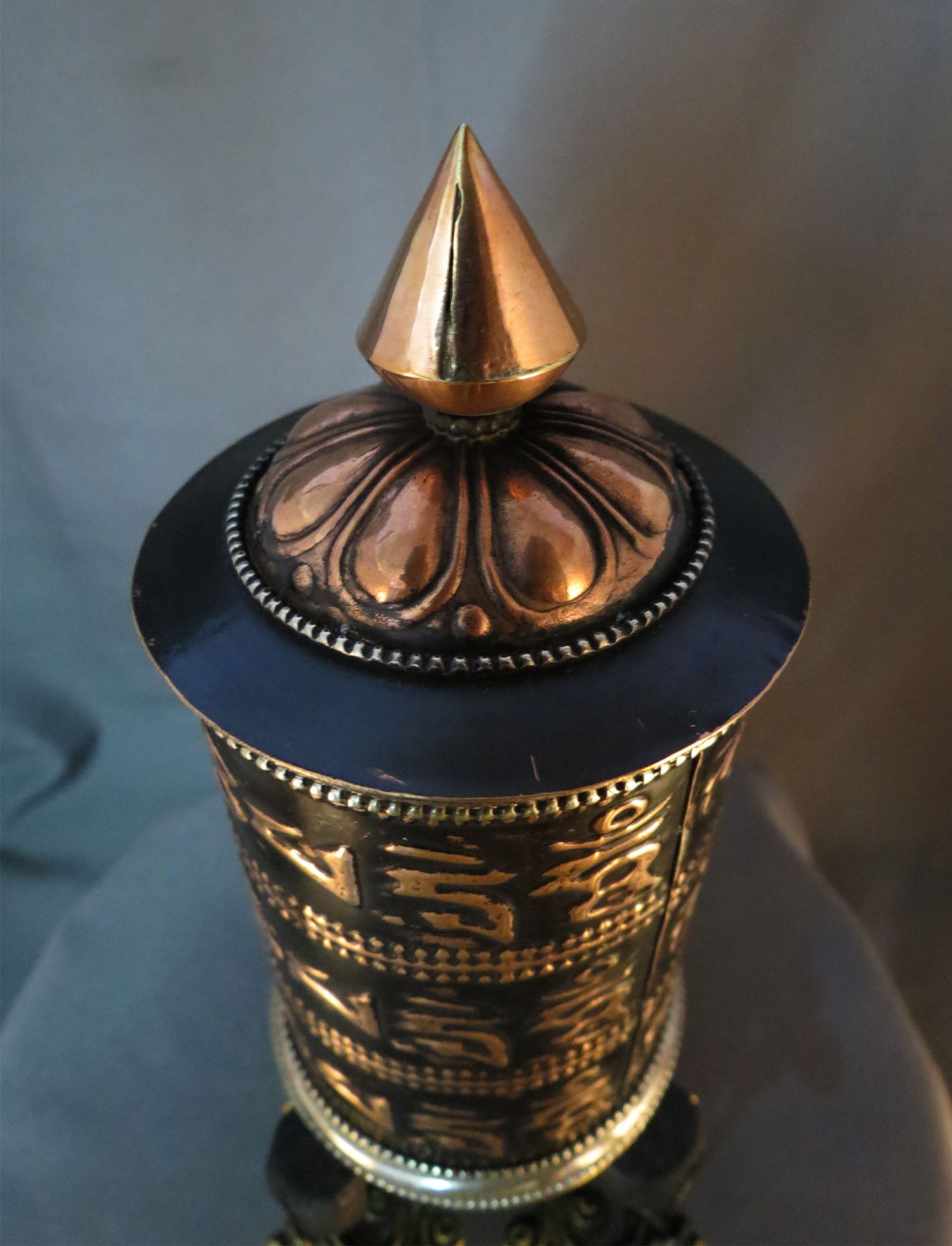 This Beautiful Handmade Table Stand/Top Ritual Offering Tibetan Buddhism "Om Mane Padme Hum" Mantra Vishwa Vajra/Double Dorje Brass Stand Copper Oxide Prayer Wheel made in Nepal.