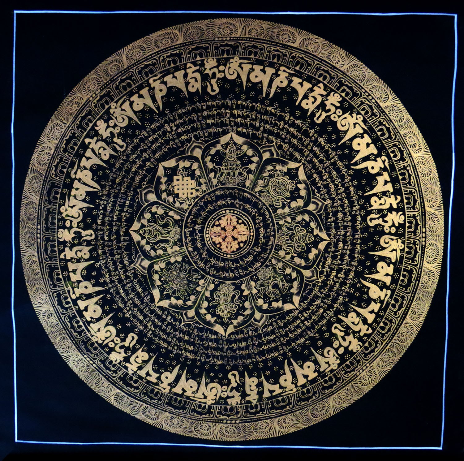 This Beautiful Handmade in Canvas Cloth Tibetan Buddhism Mandala Om Mani Padme Hum Mantra Mandala with 8 Auspicious Ritual Sign Lama Handwritten Painting Thangka made by Artists of Nepal.