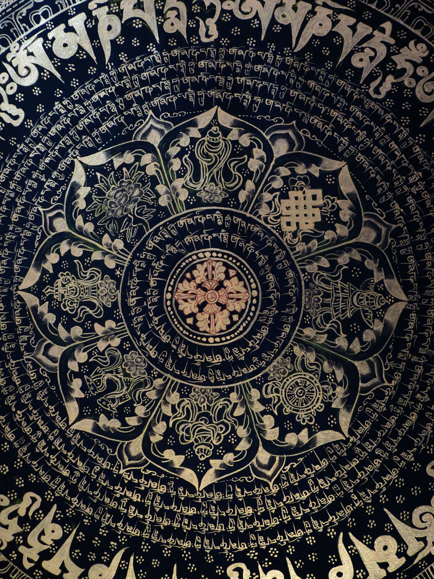Tibetan Buddhism Ritual Vishwa Vajra/Dorje Om Mani Padme Hum Mantra Mandala with 8 Auspicious Lucky Sign Handwritten Painting Thangka Art Nepal free