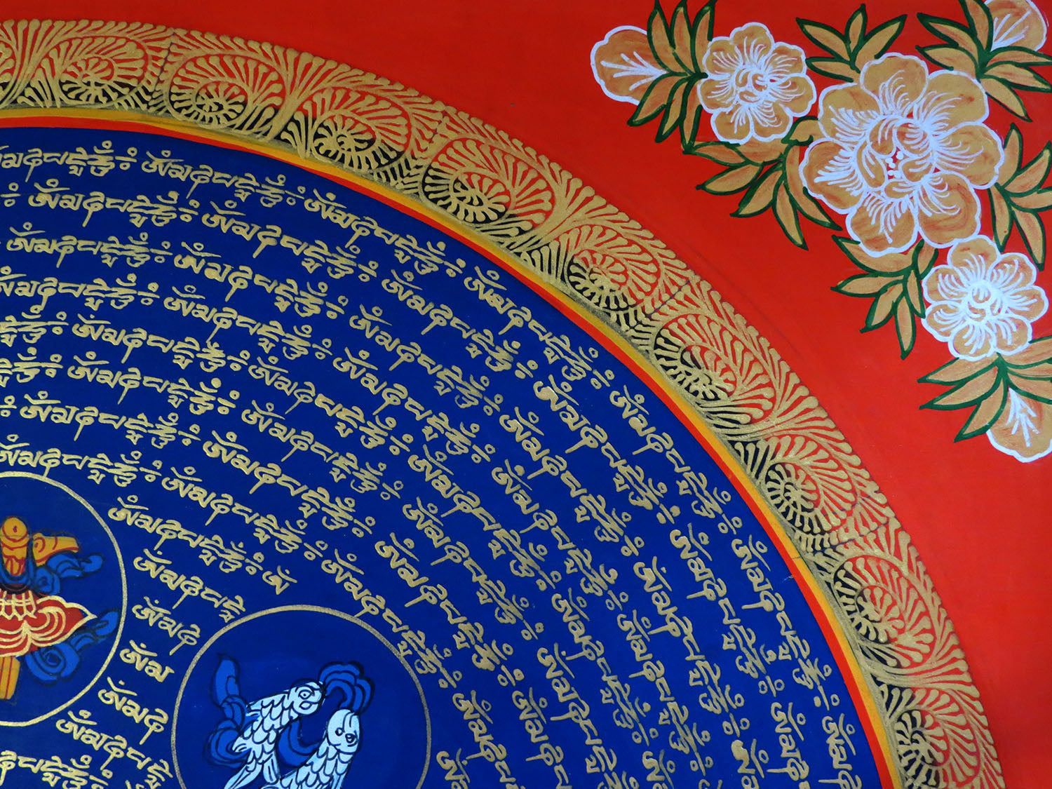 Mandalas are works of sacred art in Tantric Tibetan Buddhism. The word "mandala" comes from a Sanskrit word that generally means "circle," and mandalas are indeed primarily recognizable by their concentric circles and other geometric figures. Mandalas are far more than geomatical figures, however. For Tantric Buddhists, they are rich with symbolism and sacred meaning. In fact, the etymology of the word "mandala" suggests not just a circle but a "container of essence."