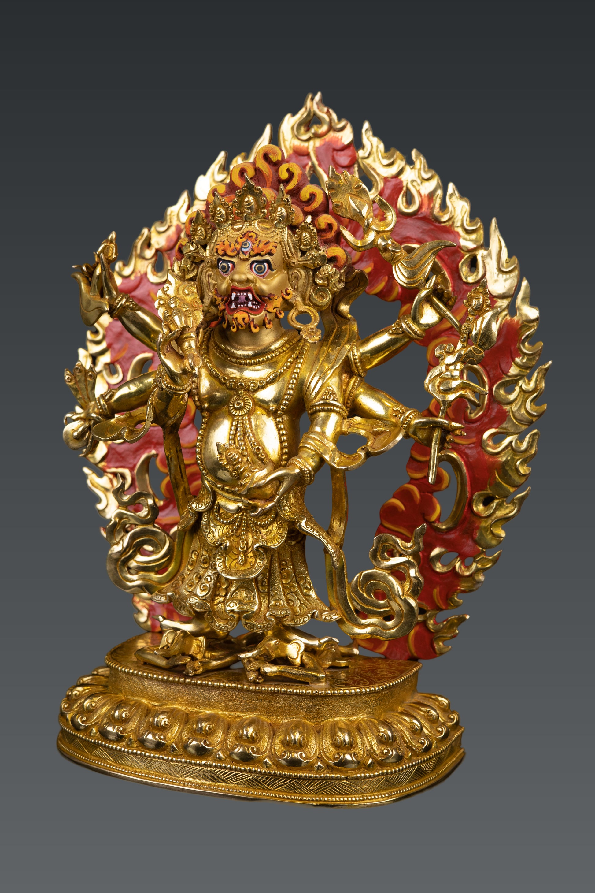 Mahakala is a mythical creature in the religion of Buddha. Mahakala almost always is shown with a crown of five skulls, but there are many different depictions with six, four, or two arms.