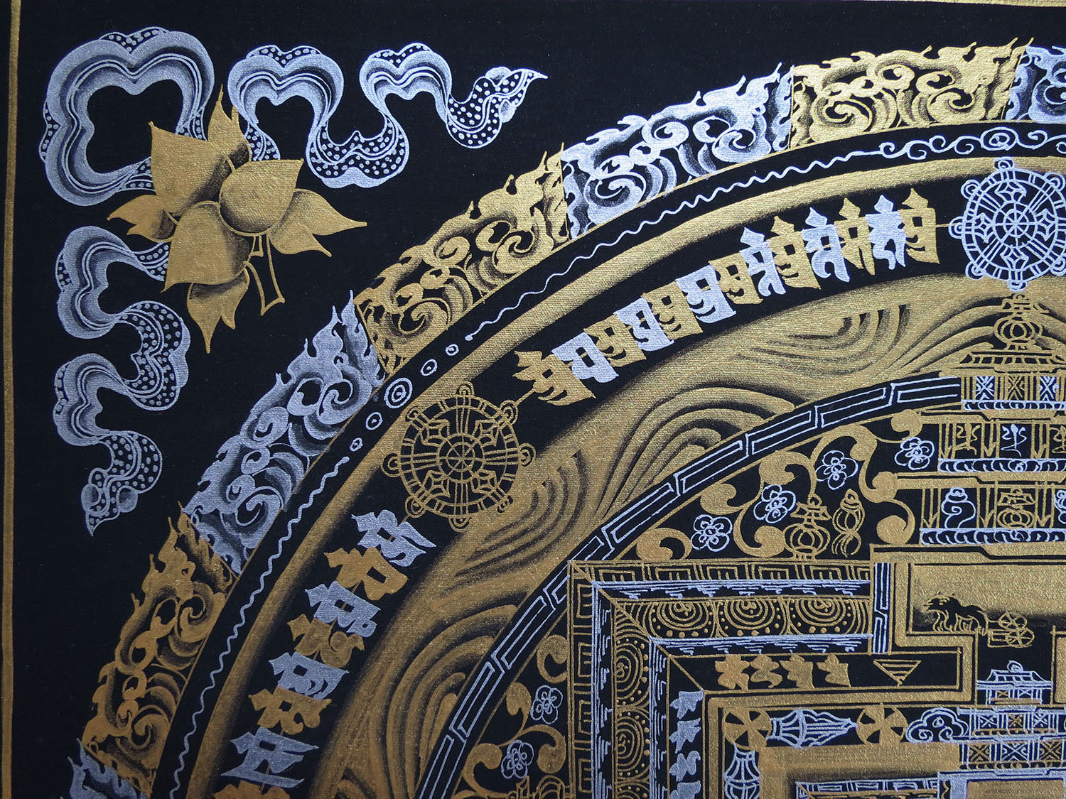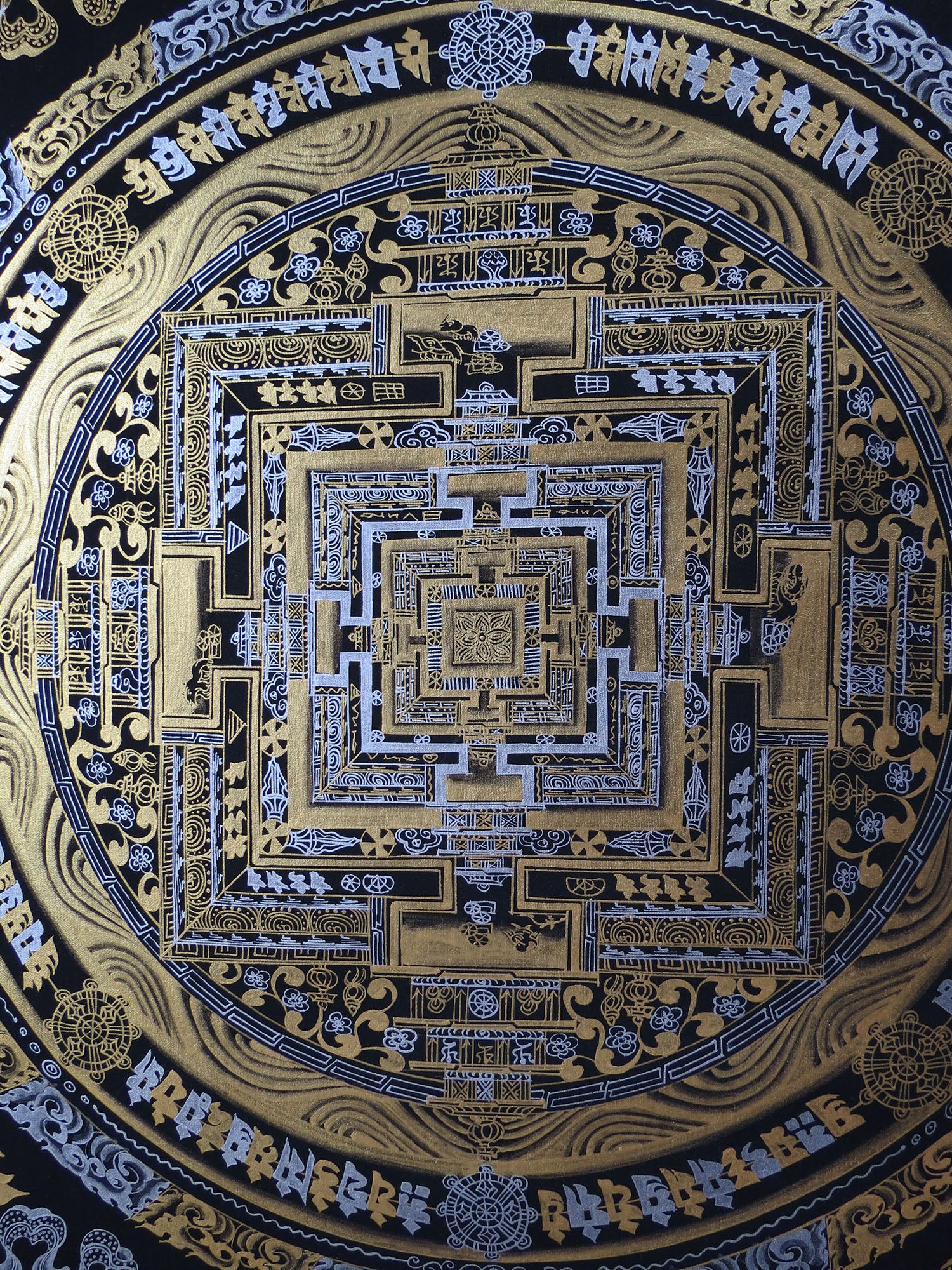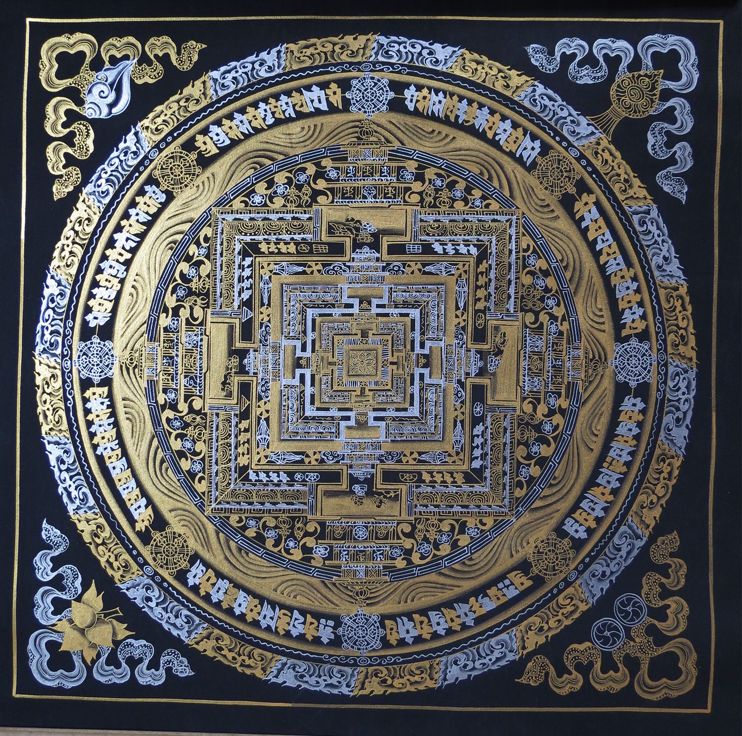 Tibetan Buddhism Ritual Kalachakra Mandala Tantra Thangka Gold & Silver Color Hand Painting Art Black free