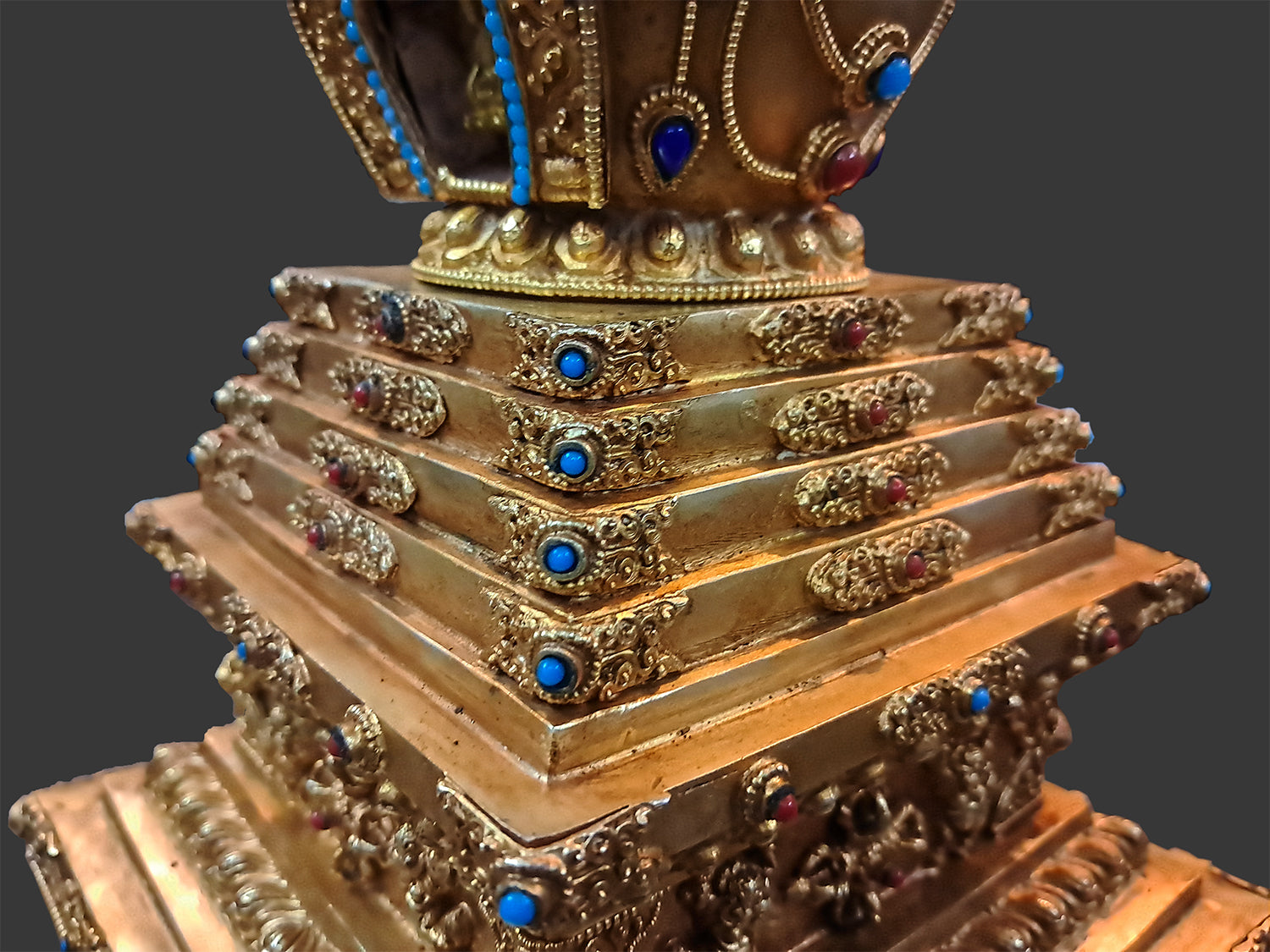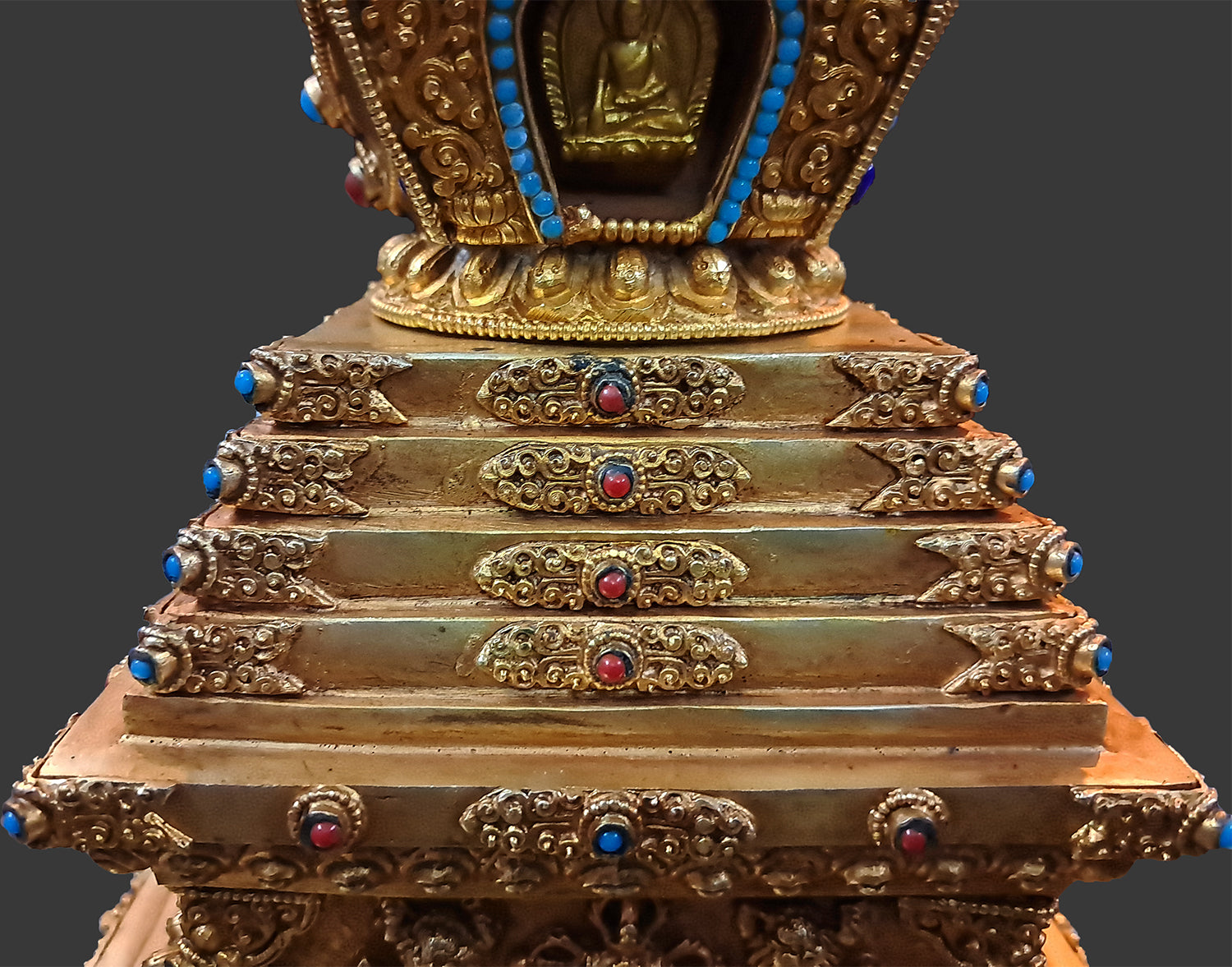 This Beautiful Handmade Hand craved Tibetan Buddhism Temple Gold Plated Ritual Stupa Pagoda with real Coral, Turquoise and Lapiz Stone Made by Artists of Nepal.