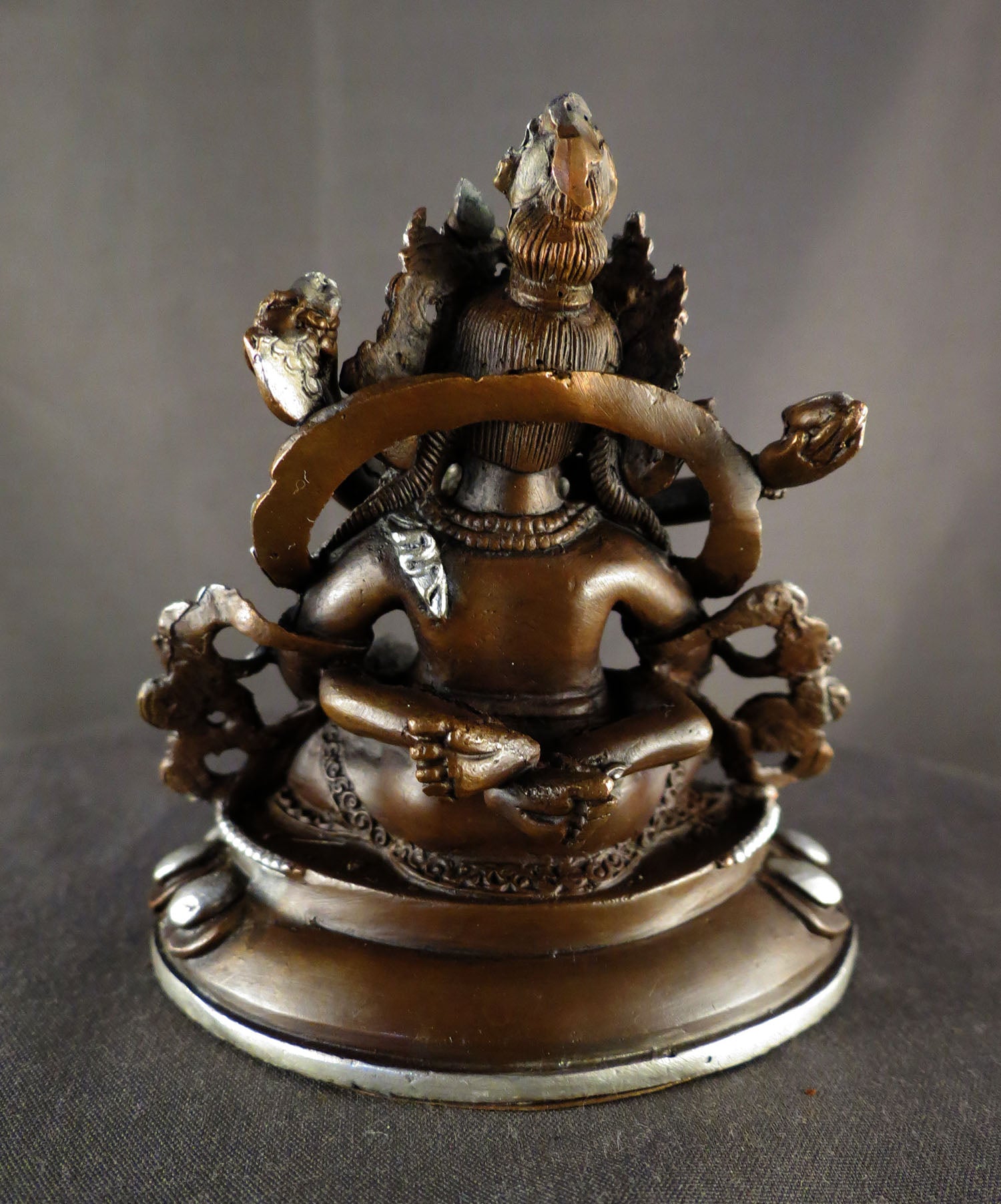 Dzambala is born from the right eye of Avalokitesvara Bodhisattva, also known as the manifestation of Avalokitesvara Bodhisattva. According to the sutra, his mantra can stop suffering, destroy bad karma and have a Bodhicitta or mind. His mantra can also avert disaster and sickness. He also bring wealth to all sentients being by chants his mantra. Tibetan name is “Dzambhala Gapee” which means, white Dzambala. White Jambala sits on a snow lion, although some artists depict him sitting on a dragon and in his left hand there is also a mongoose that spits out precious diamonds and ornaments.