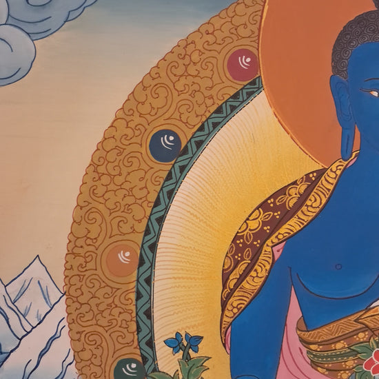 This Beautiful Handmade in Canvas Cloth Tibetan Buddhism Mandala Lord Medicine Buddha Bhaisajya Guru Buddha Painting Thangka made by Artists of Nepal.