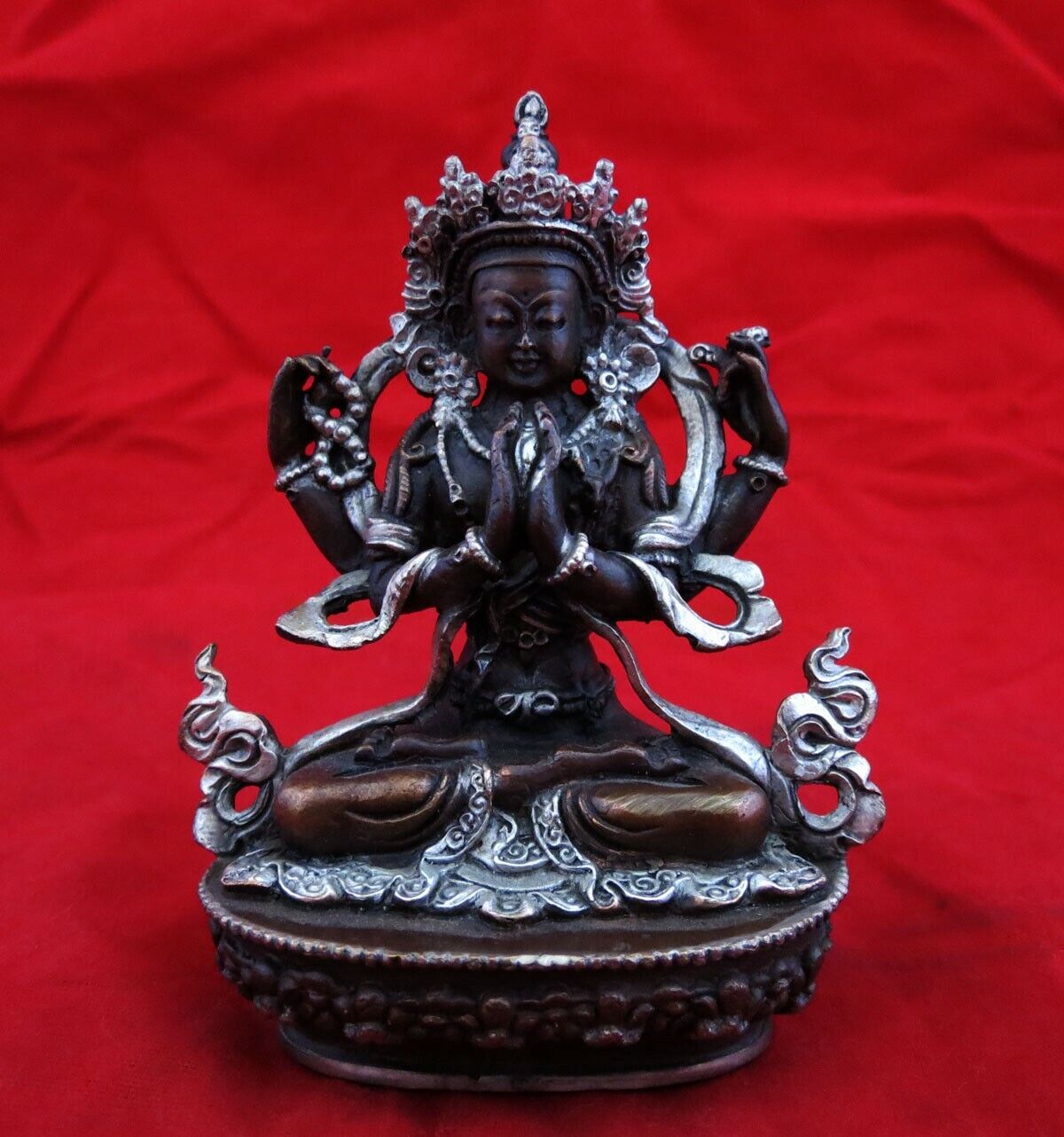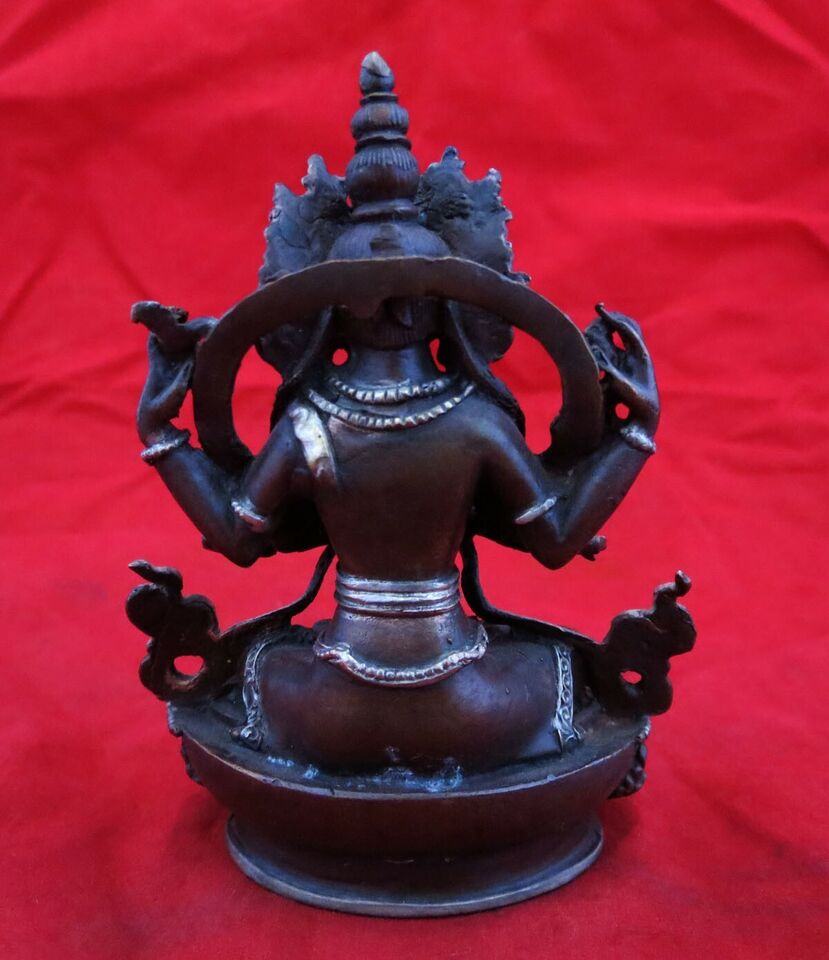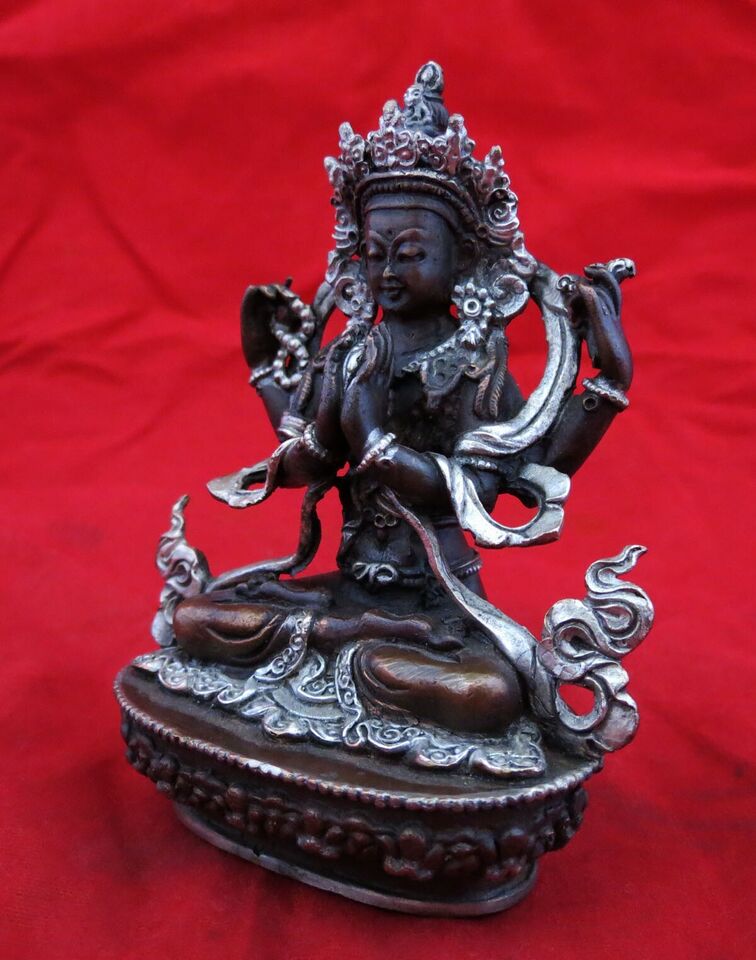 Tibetan Lord Chenrezig Khacheri 3.6" Fine Copper Silver Oxide Statue Figure Nepal