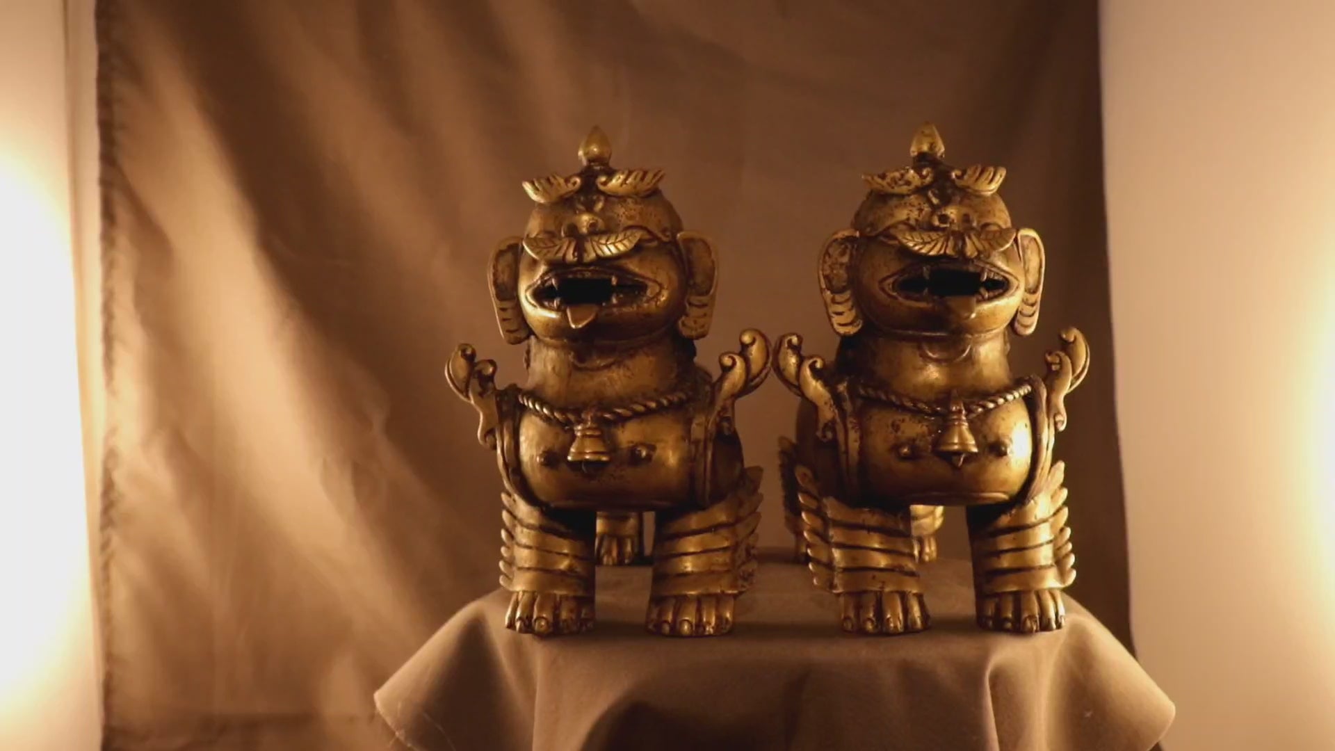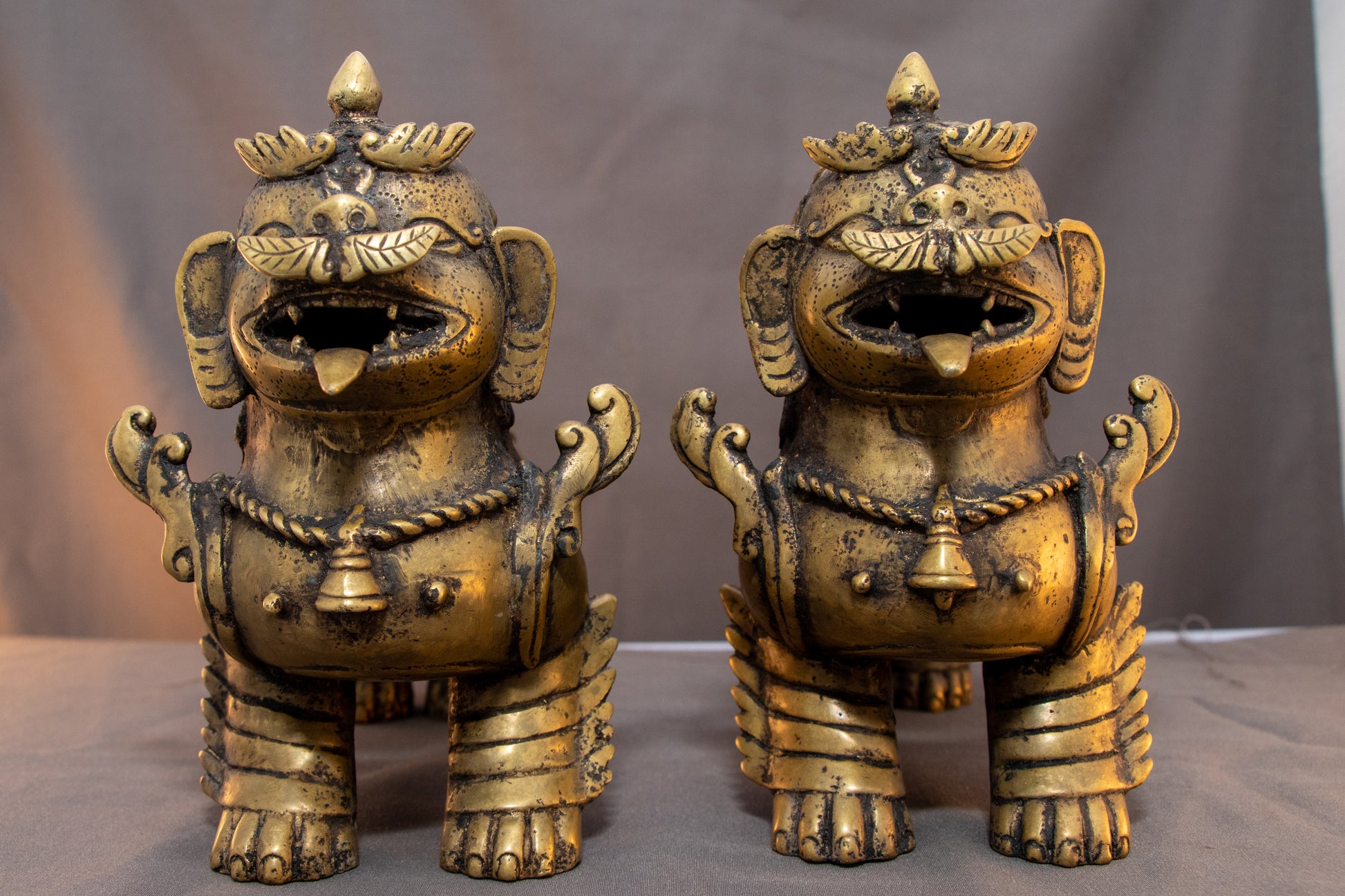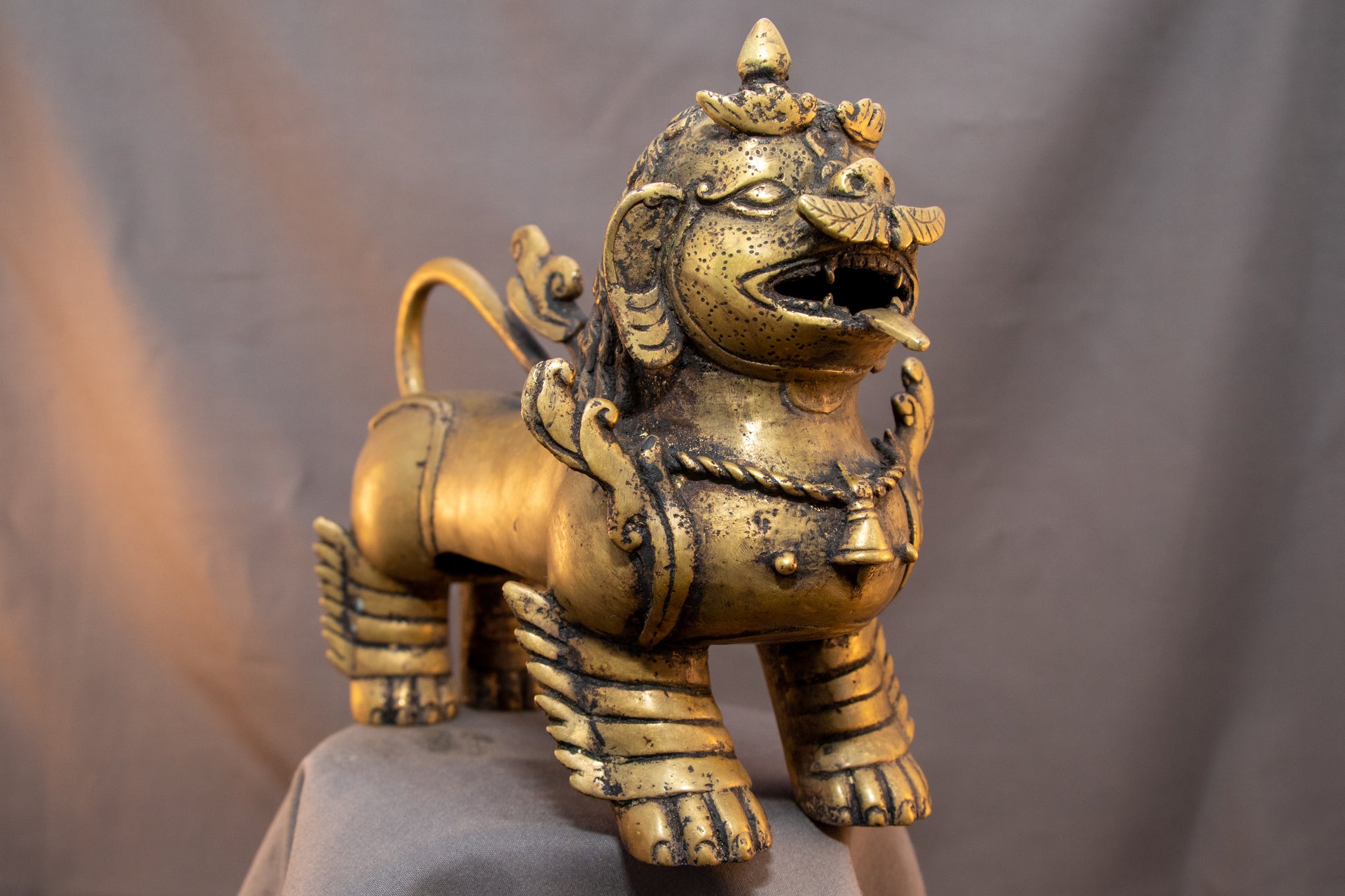 This Beautiful Finest Handmade Tibetan Buddhism Hinduism Protector Yellow Antique Color Singha Pair of Lion Feng Shui Lions Foo Fu Dog Guardian Lion Brass Statue made in Nepal.