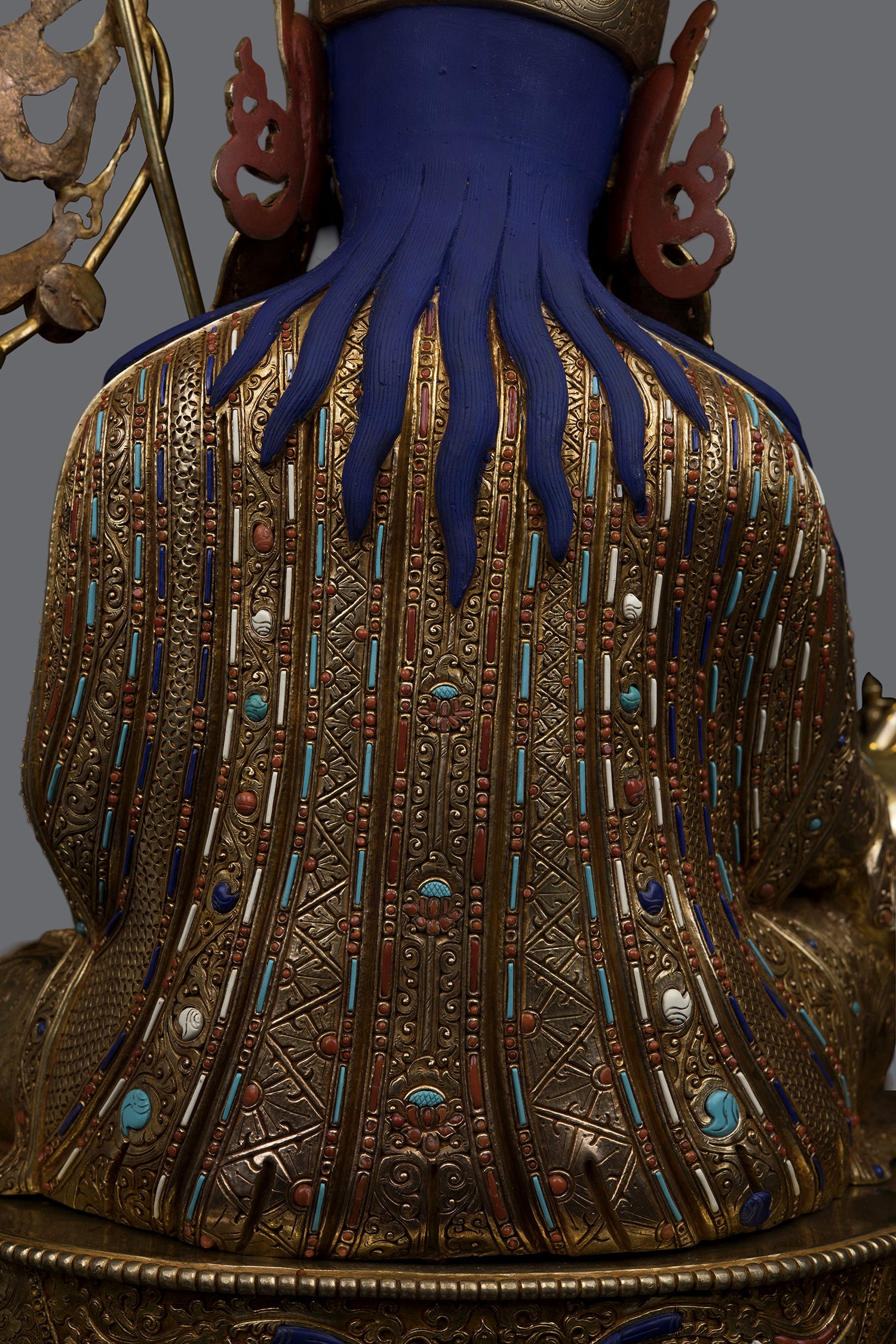 Guru Rinpoche, regarded as an emanation of Buddha Amitabha, was born miraculously from a lotus blossom in the land of Oddiyana located in present-day Pakistan. He was known far and wide for his miracle powers, including his ability to subdue spirits. At the request of the king, Guru Rinpoche journeyed to Tibet and engaged the local nature spirits in magical combat. Conquering these spirits, he bound them by oath to protect the Dharma for all time. Evidence of his victories in these battles can still be seen throughout the valleys and villages of Tibet, where he is affectionately known as "Guru Rinpoche," meaning "Precious Master."