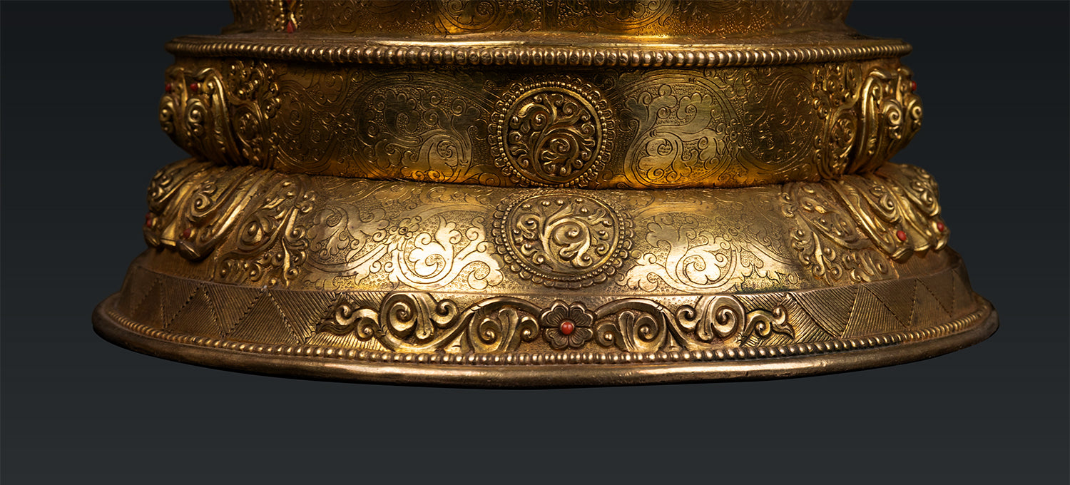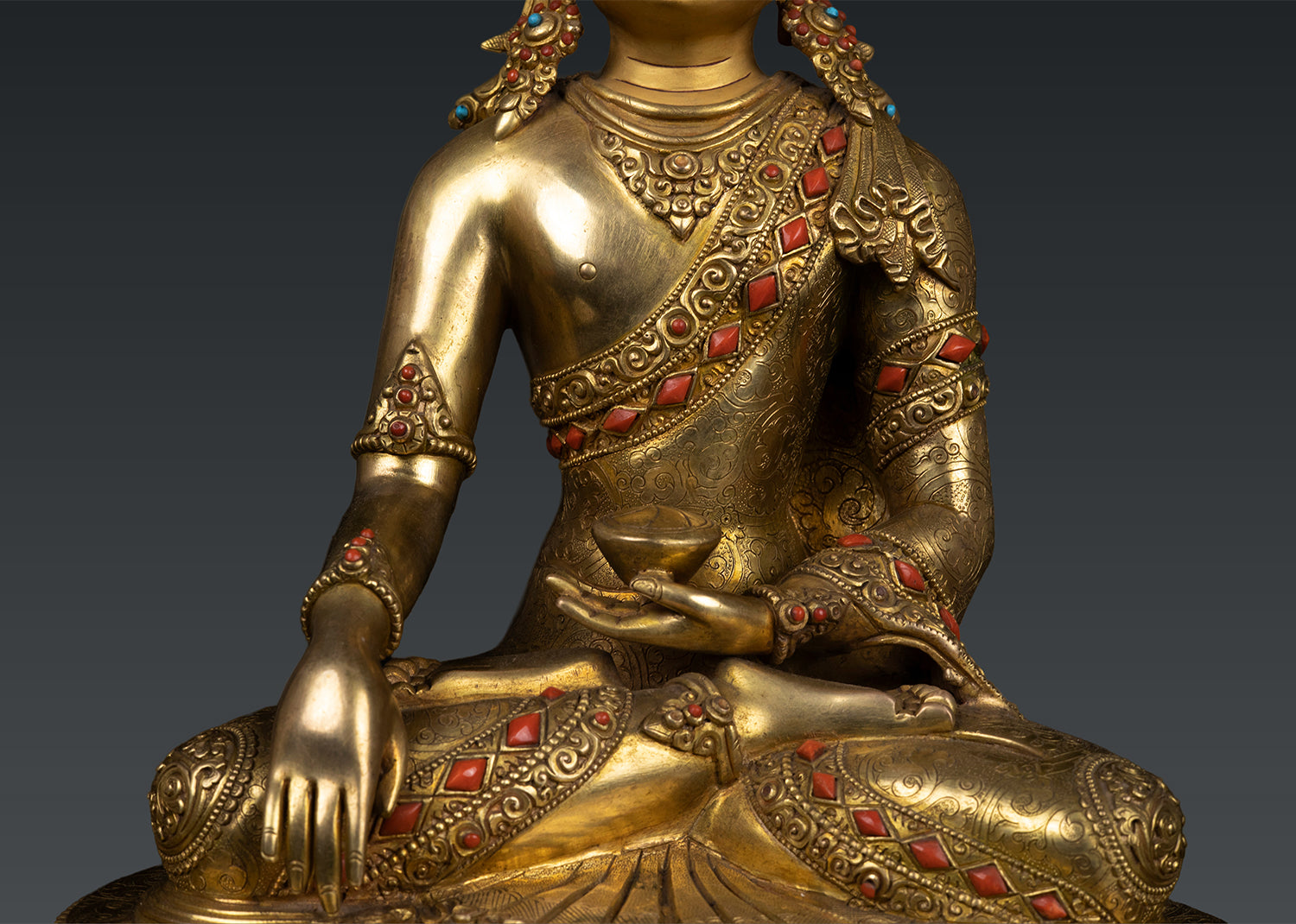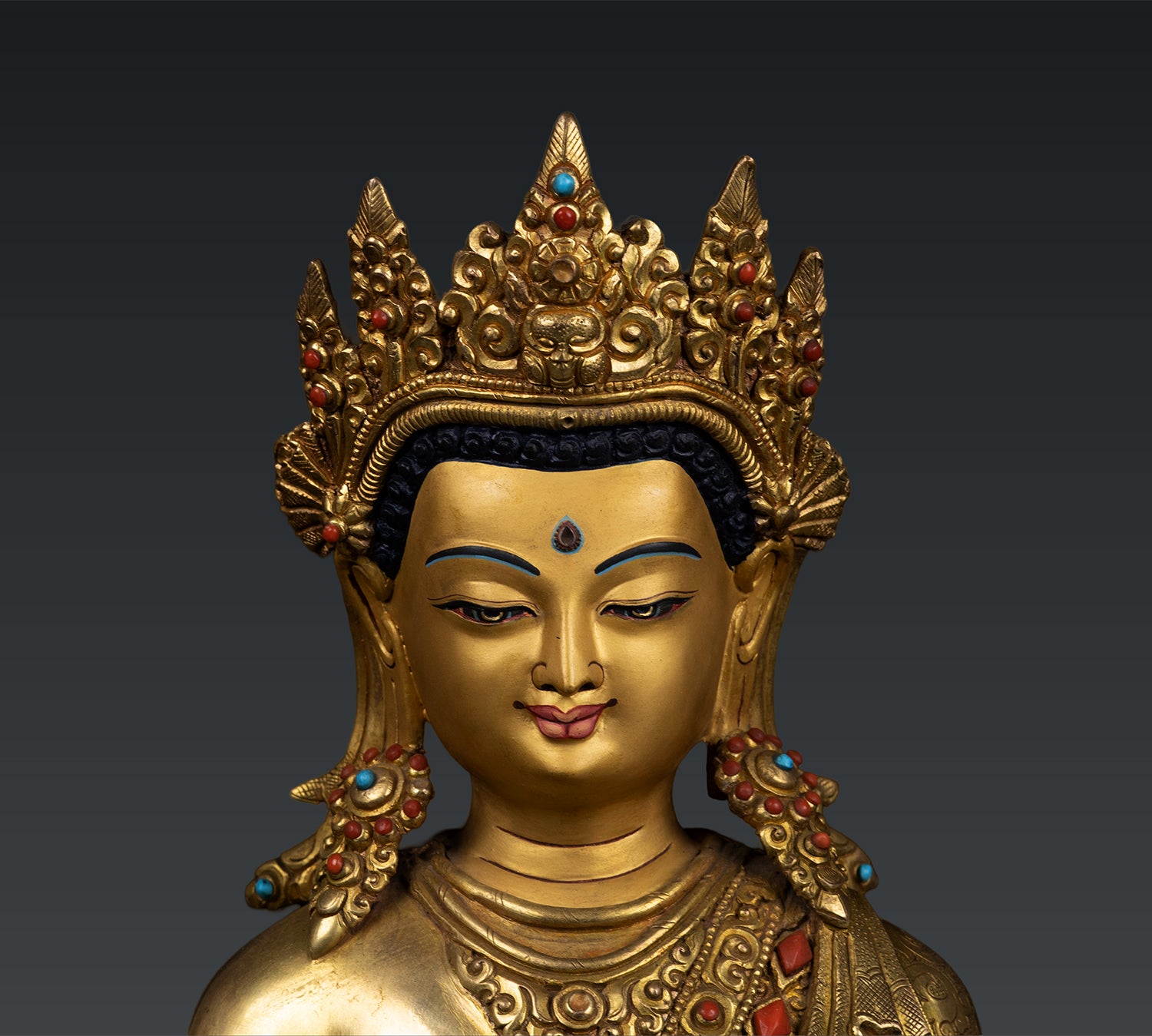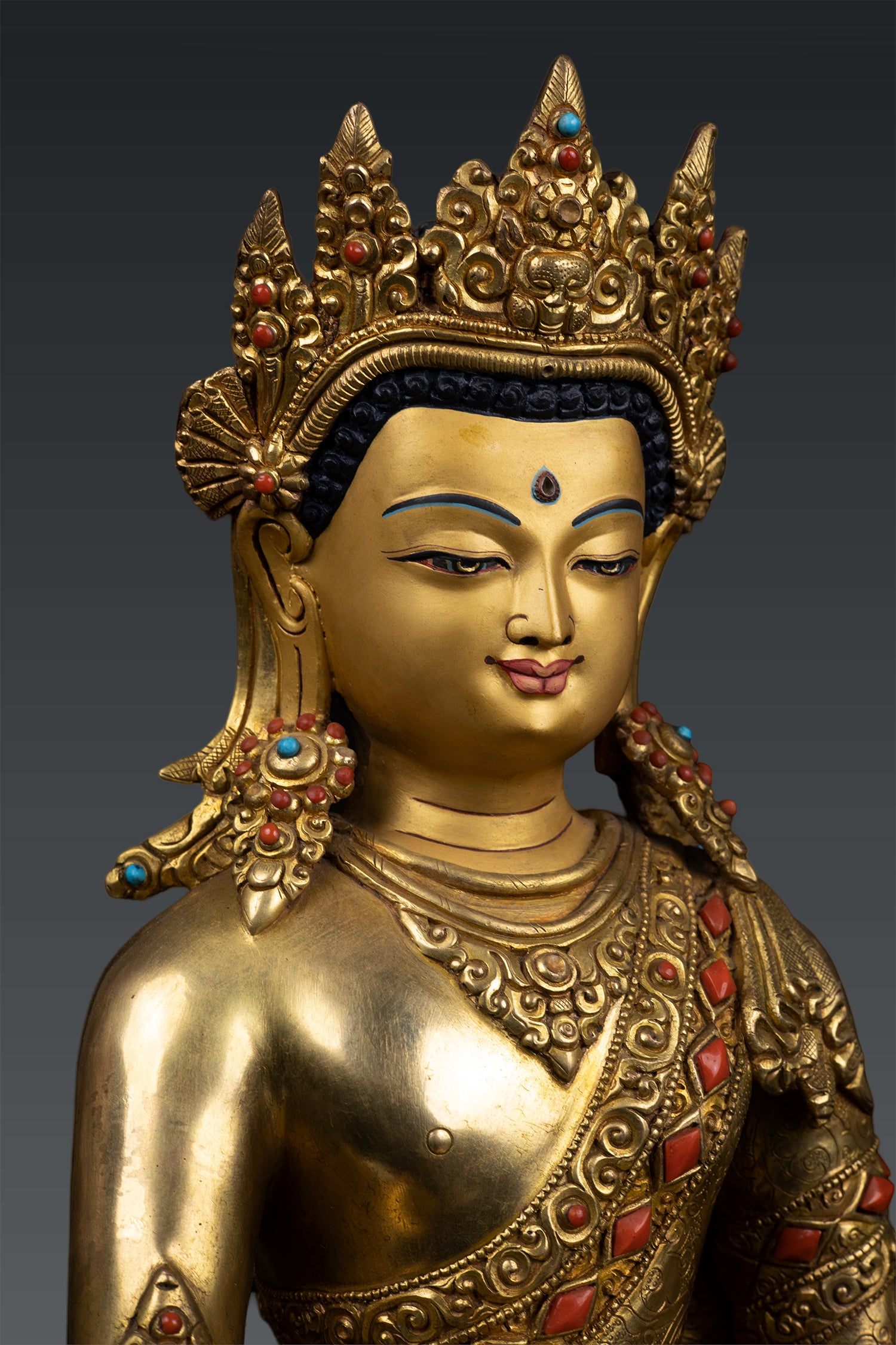 This Beautiful Handmade Hand craved Unique Buddhism Lord Shakyamuni Buddha 24K Gold Plated Pure Copper Statue with Real Coral Stone made by Artists of Nepal.