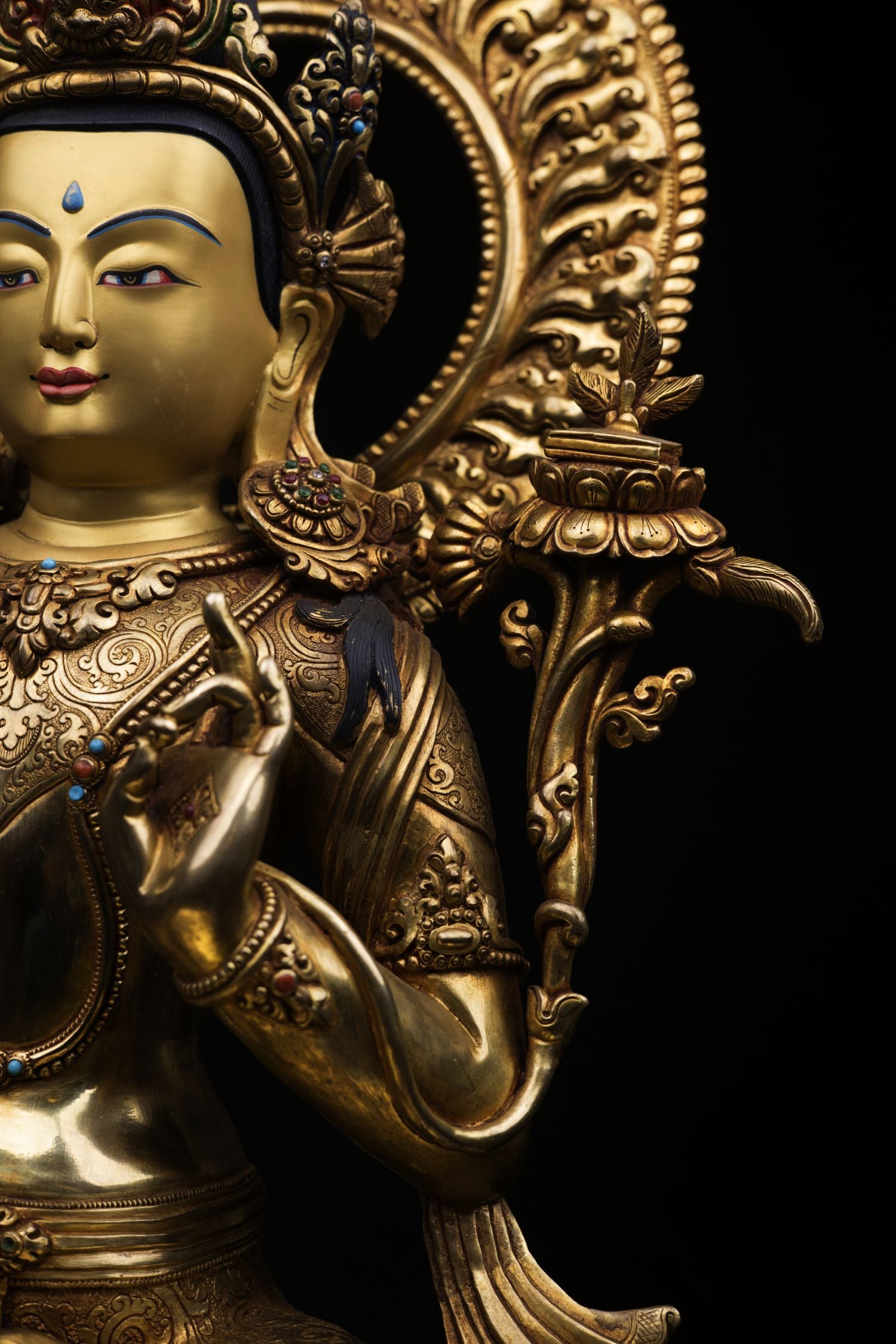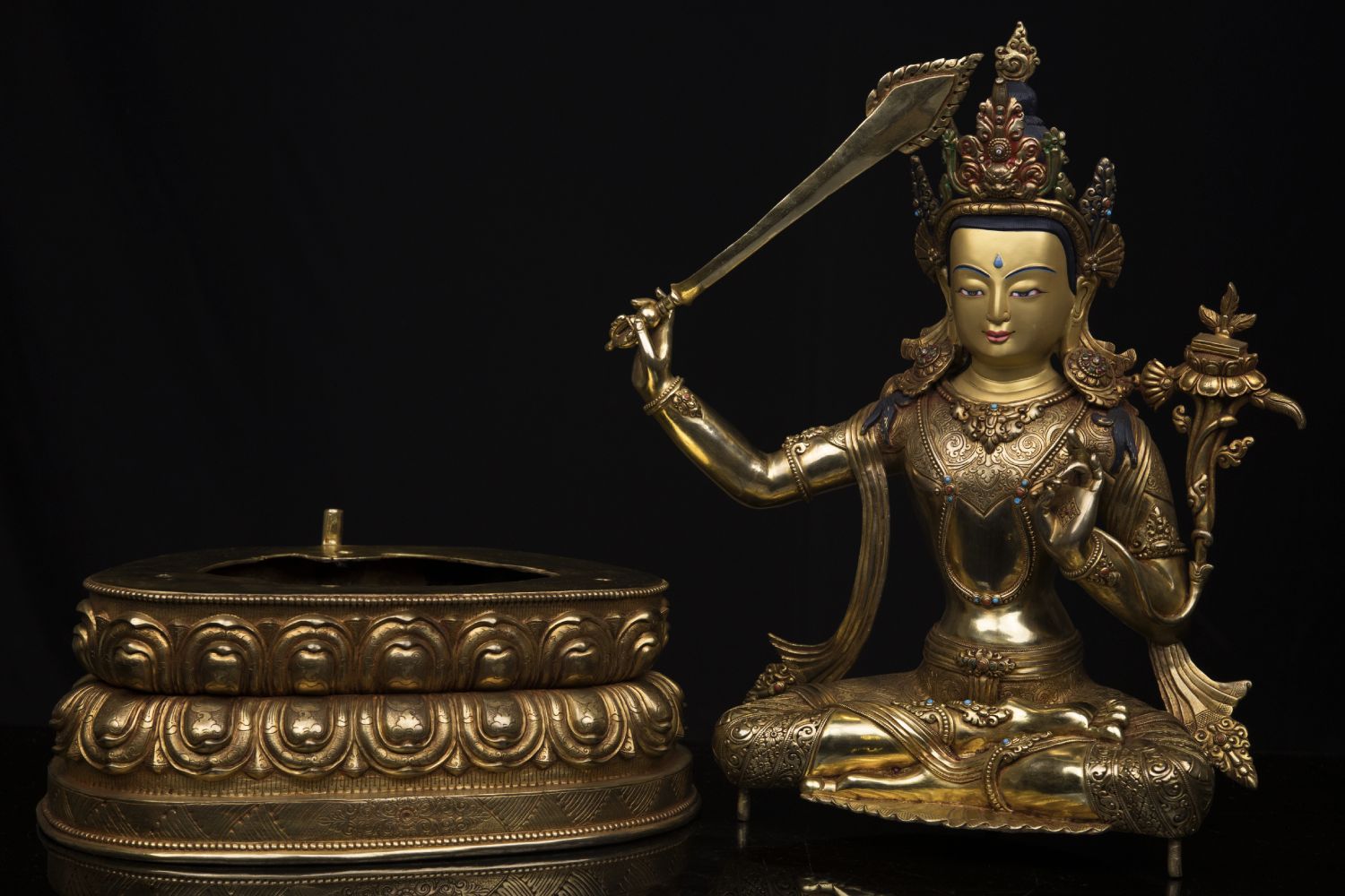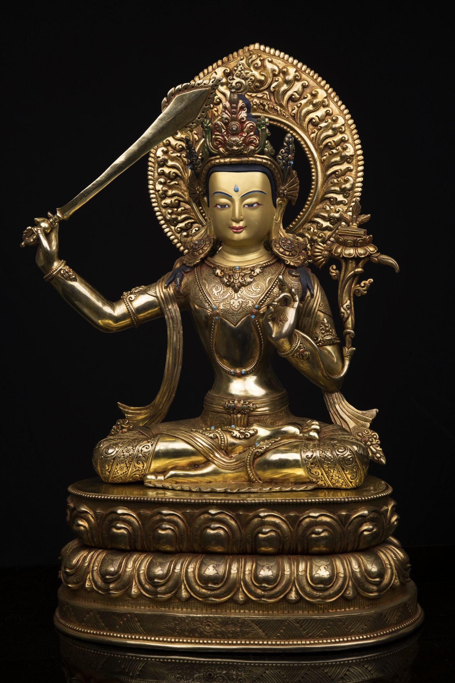 This Beautiful Unique Handmade Hand Craved Tibetan Buddhism Lord Maha Manjushri Pure Gold Plated Pure Copper Statue made by Artists of Nepal.